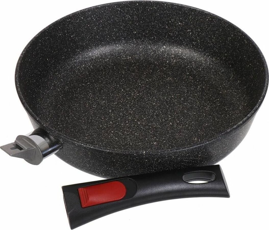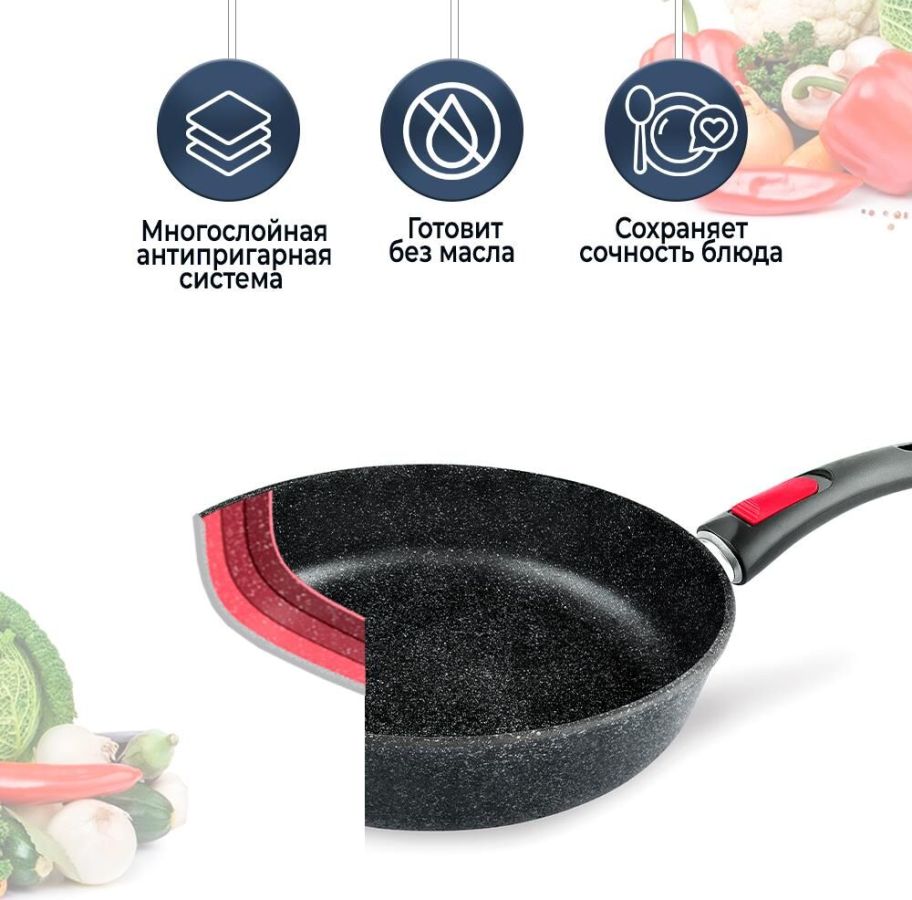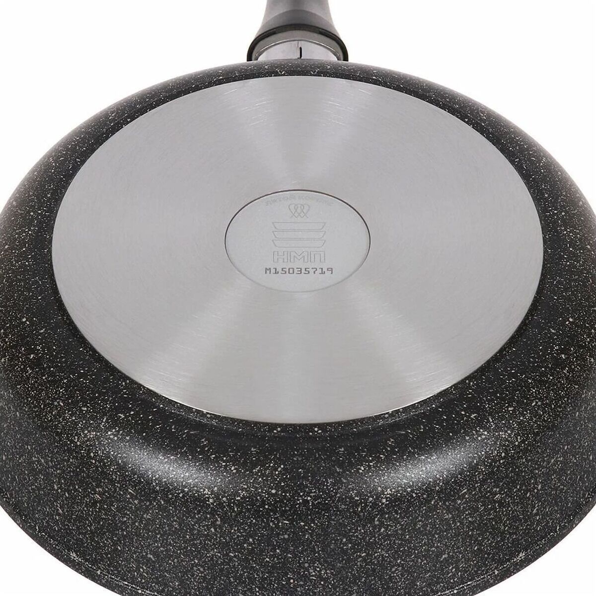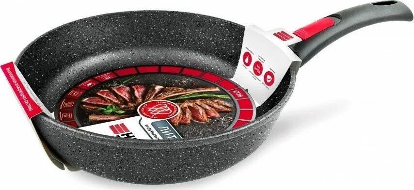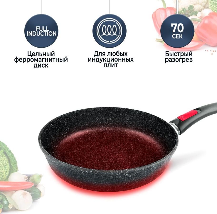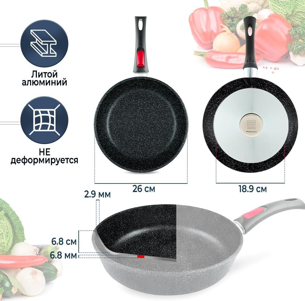 Тип сковорода универсальная Материал алюминий Антипригарное покрытие мраморное Совместимость с индукционными плитами есть Особенности мытье в посудомоечной машине, съемная ручка Размеры Диаметр верха 26 см Диаметр дна 18.9 см Толщина дна 6.8 мм Высота стенок 6.8 см Вес 1.27 кг Литой алюминиевый корпус сковороды не подвержен деформации и обеспечивает равномерный нагрев. Многослойное антипригарное покрытие c эффектом натурального камня позволяет готовить с минимальным количеством масла и сохранять натуральный вкус продуктов. Антипригарное покрытие на водно-кремниевой основе безопасно, не содержит PFOA (перфтороктановой кислоты). Эта сковорода выполнена с использованием современной технологии «Full Induction», дно сковороды оснащено цельным ферромагнитным диском, который распознается всеми типами индукционных плит и обеспечивает быстрый разогрев сковороды до идеальной температуры для жарки.