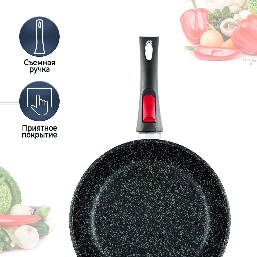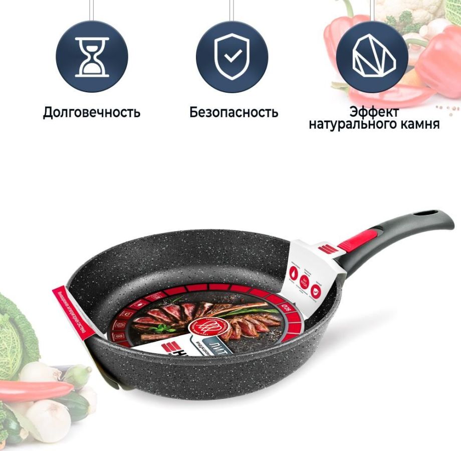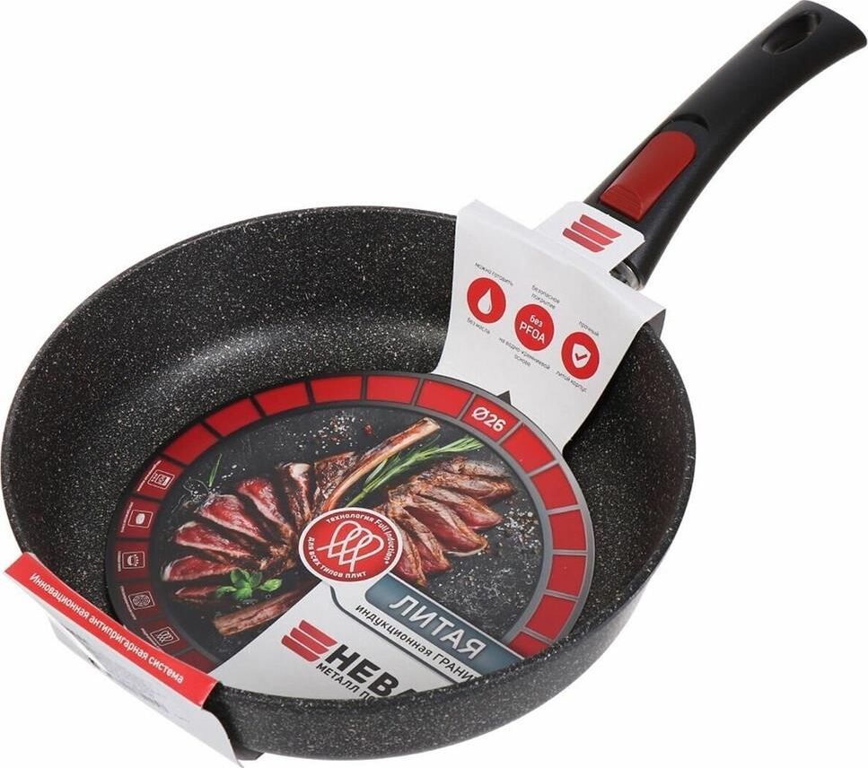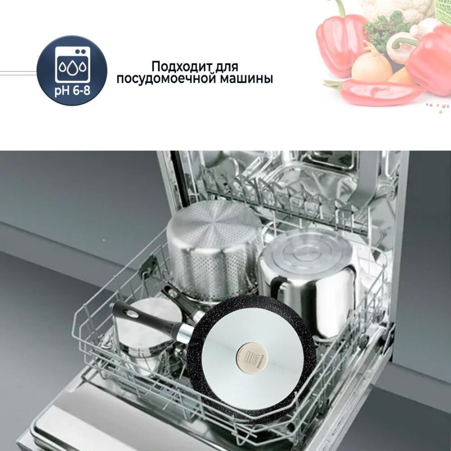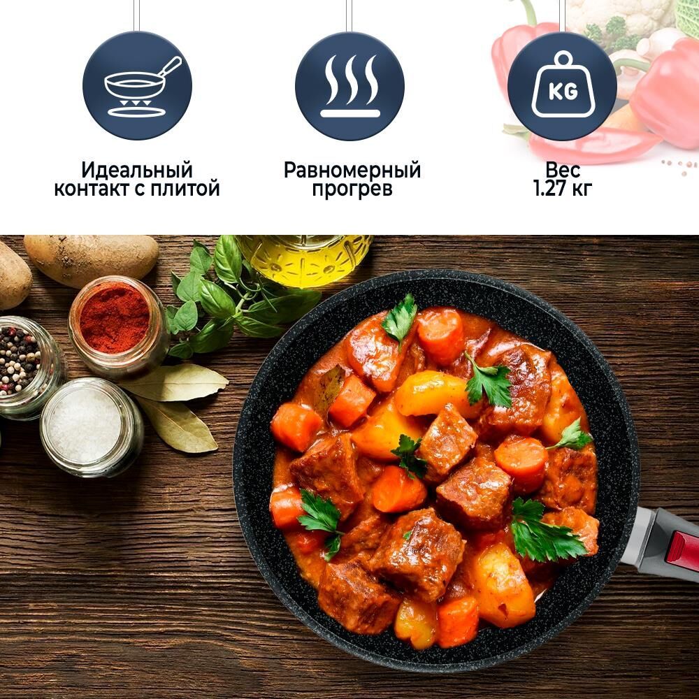 Тип сковорода универсальная Материал алюминий Антипригарное покрытие мраморное Совместимость с индукционными плитами есть Особенности мытье в посудомоечной машине, съемная ручка Размеры Диаметр верха 26 см Диаметр дна 18.9 см Толщина дна 6.8 мм Высота стенок 6.8 см Вес 1.27 кг Литой алюминиевый корпус сковороды не подвержен деформации и обеспечивает равномерный нагрев. Многослойное антипригарное покрытие c эффектом натурального камня позволяет готовить с минимальным количеством масла и сохранять натуральный вкус продуктов. Антипригарное покрытие на водно-кремниевой основе безопасно, не содержит PFOA (перфтороктановой кислоты). Эта сковорода выполнена с использованием современной технологии «Full Induction», дно сковороды оснащено цельным ферромагнитным диском, который распознается всеми типами индукционных плит и обеспечивает быстрый разогрев сковороды до идеальной температуры для жарки.