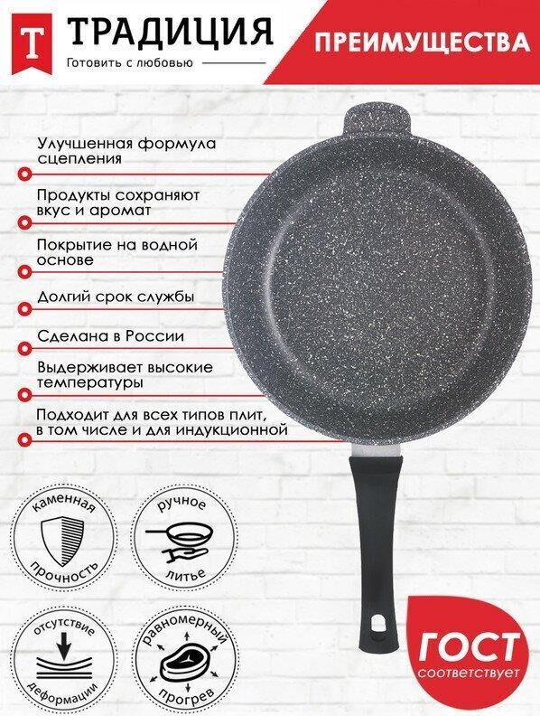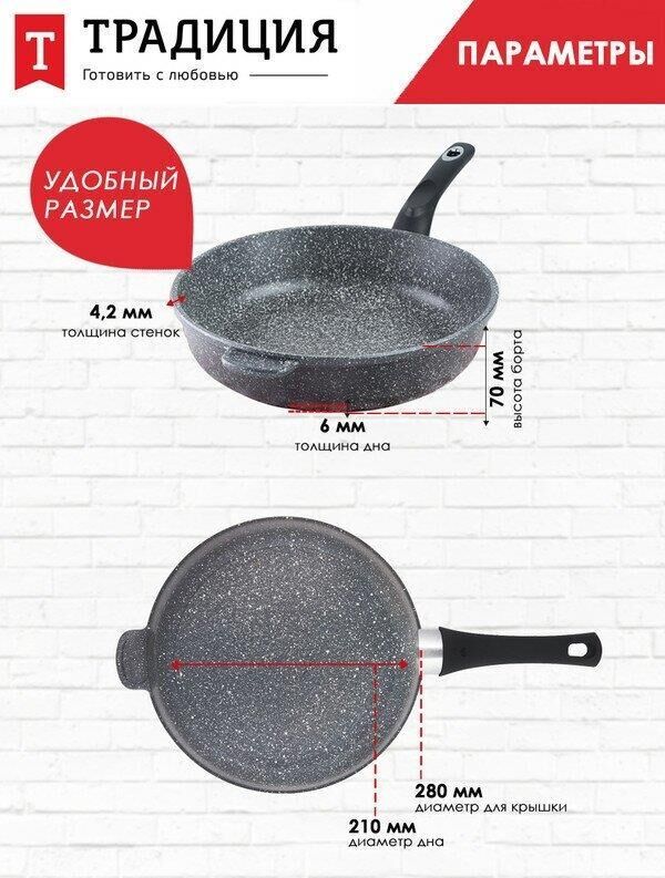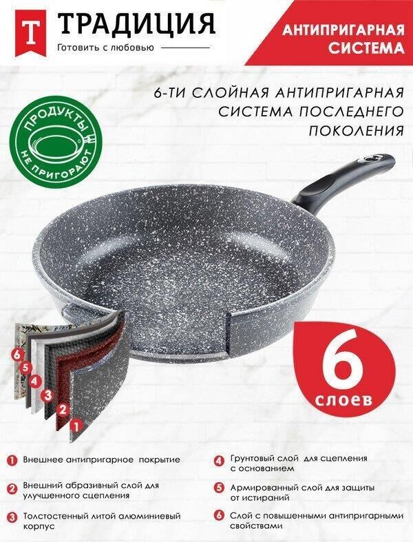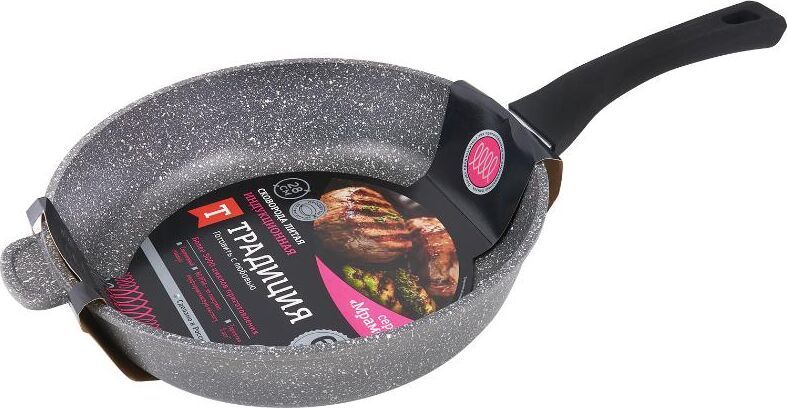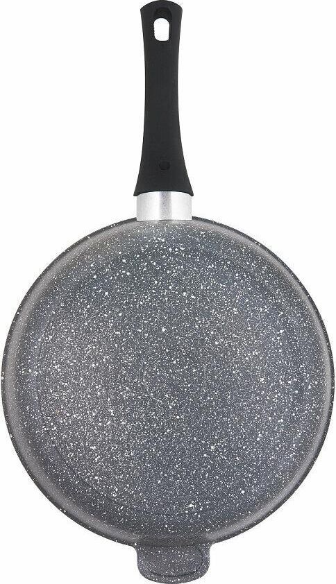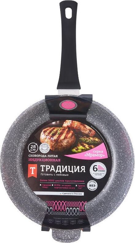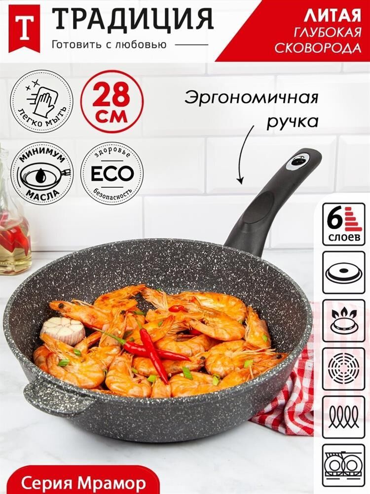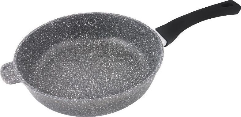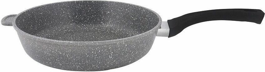 Сковорода 28 см Мрамор. Материал: пищевой литой алюминий. Антипригарное мраморное покрытие. Подходит для всех тип плит, в том числе индукционных. Не нагревающиеся бакелитовая ручка легко чистится. Можно мыть в посудомоечной машине. Без крышки.