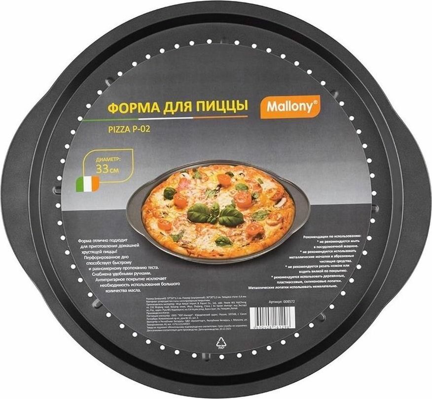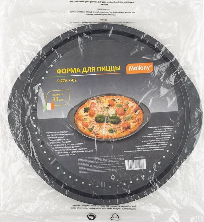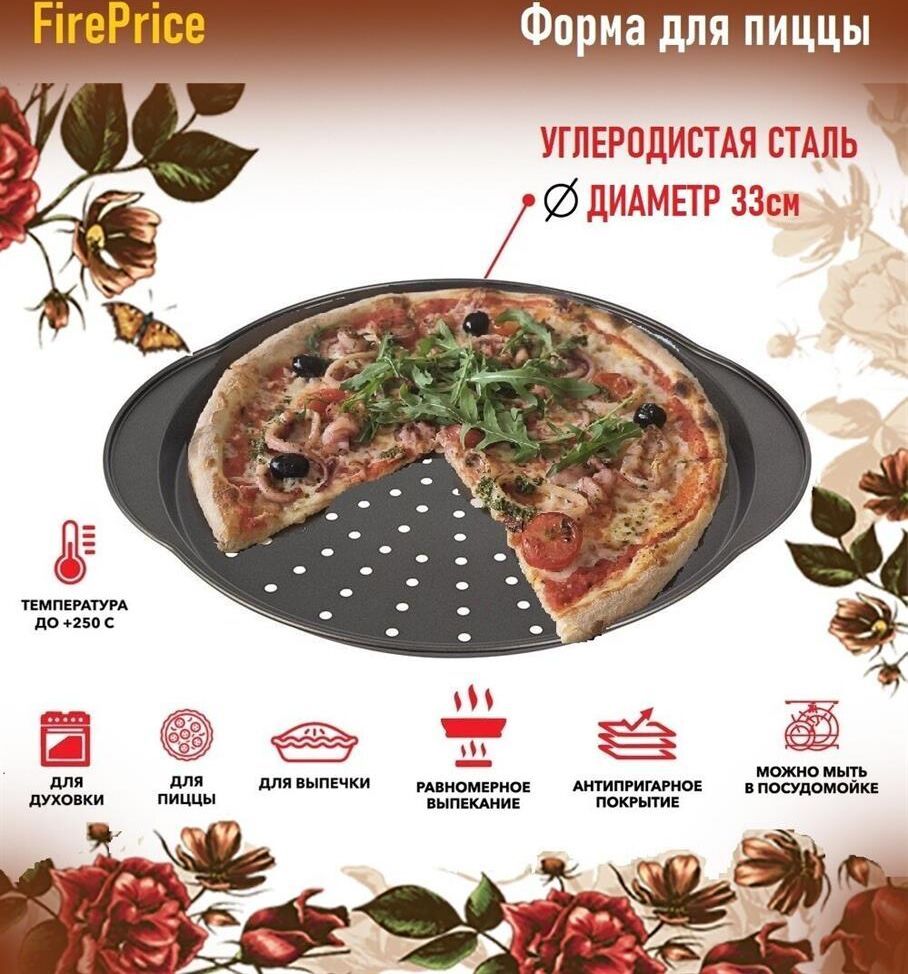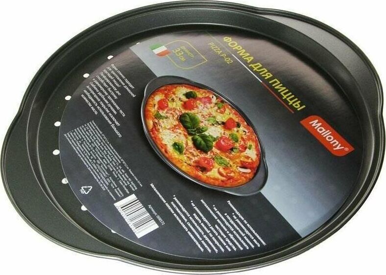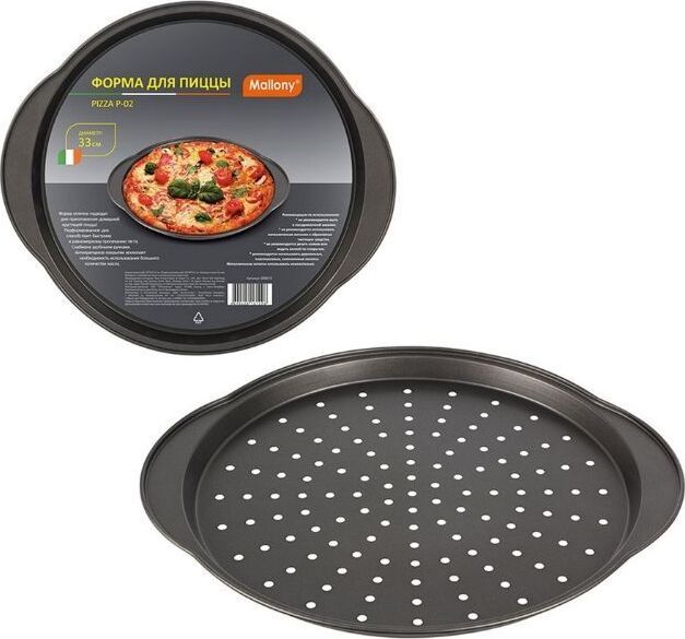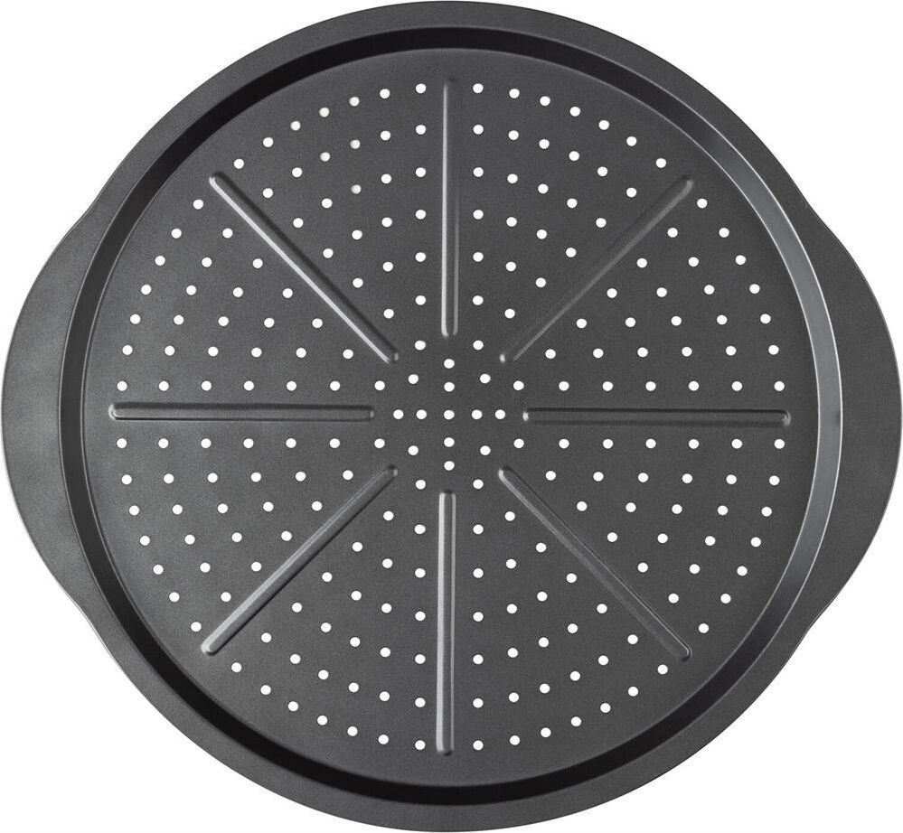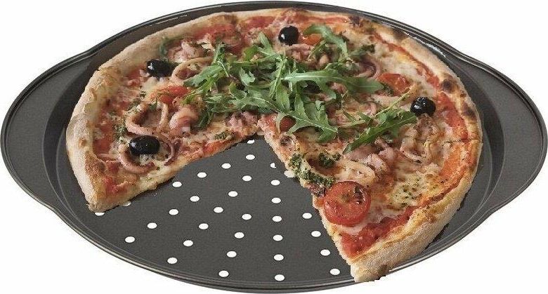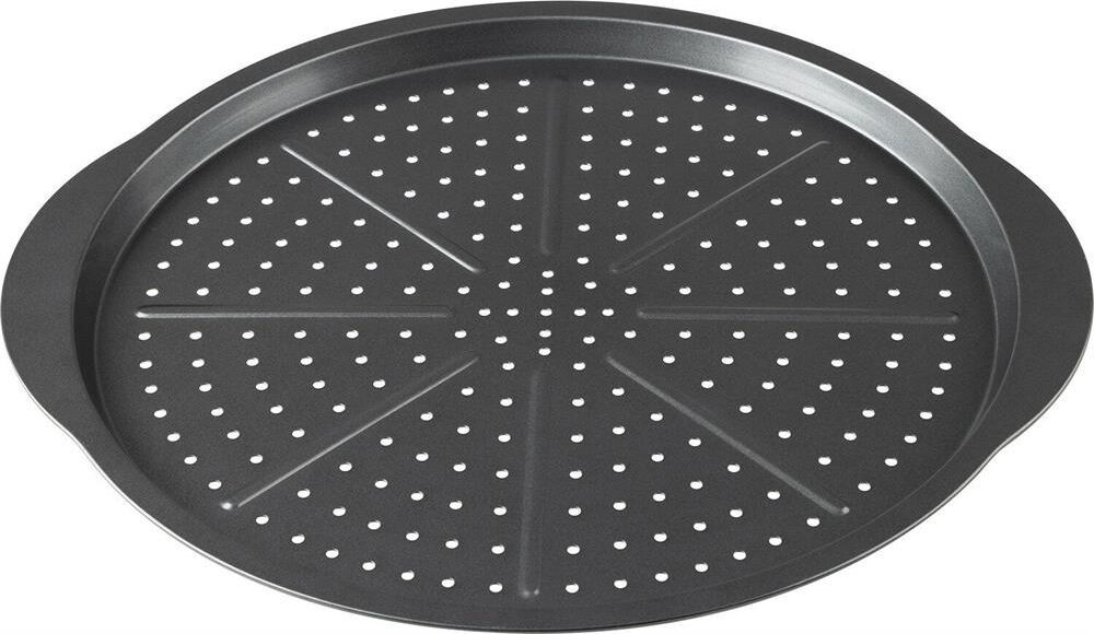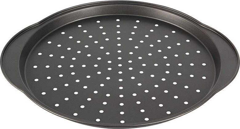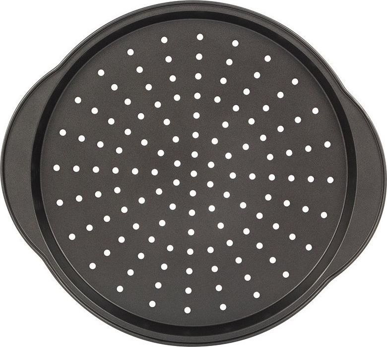 Круглая форма для пиццы Снабжена ручками для удобства Перфорированное дно (для более быстрого и равномерного пропекания теста) Размер (внешний): 37*33*2.2 см Размер (внутренний): 30*30*2.2 см Толщина стали: 0,4 мм Цвет: серый Материал: углеродистая сталь с антипригарным покрытием
