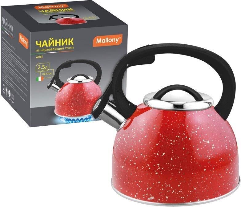 Комплектация: MALLONY Чайник из нерж стали со свистком "Arte" (красный с белыми точками) 2,5 л (005174) 1 шт.