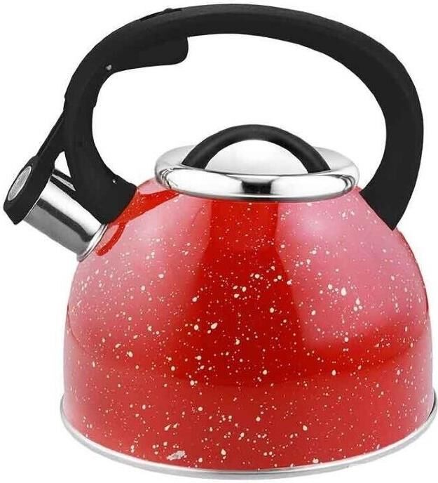 Чайник из нержавеющей стали # 201 со свистком, с крышкой, с ручкой из нейлона, матовый внутри/окрашенный под мрамор — снаружи (красный с белыми точками) матовая окрашенная поверхность корпуса дно — одинарное, подходит для всех типов плит, толщина стали — 0,3 мм, литраж — 2,5 литра, упаковка — цветная коробка. Название модели — "Arte" Материалы: нержавеющая сталь, нейлон.
