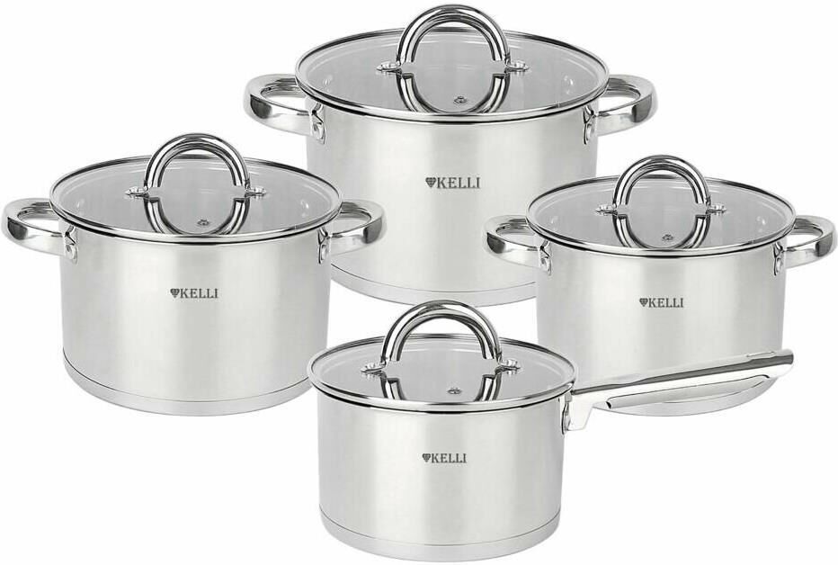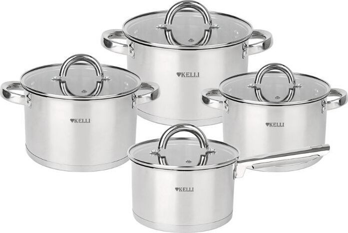 Набор посуды 8 предметов. Кастрюля 1,8л. Диаметр 16см. Кастрюля 2,5л. Диаметр 18см. Кастрюля 3,5л. Диаметр 20см. Ковшик 1,8л. Диаметр 16см. Высококачественная нержавеющая сталь. Жаропрочные стеклянные крышки с паровыпуском 5-ти слойное капсульое дно Удобные термостойкие клепаные ручки. Пригодна для всех видов плит.