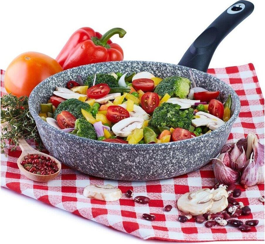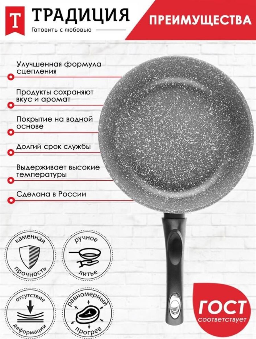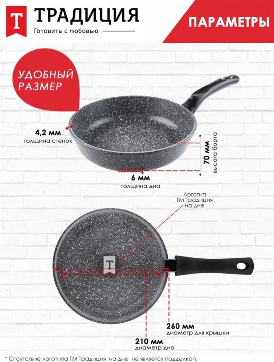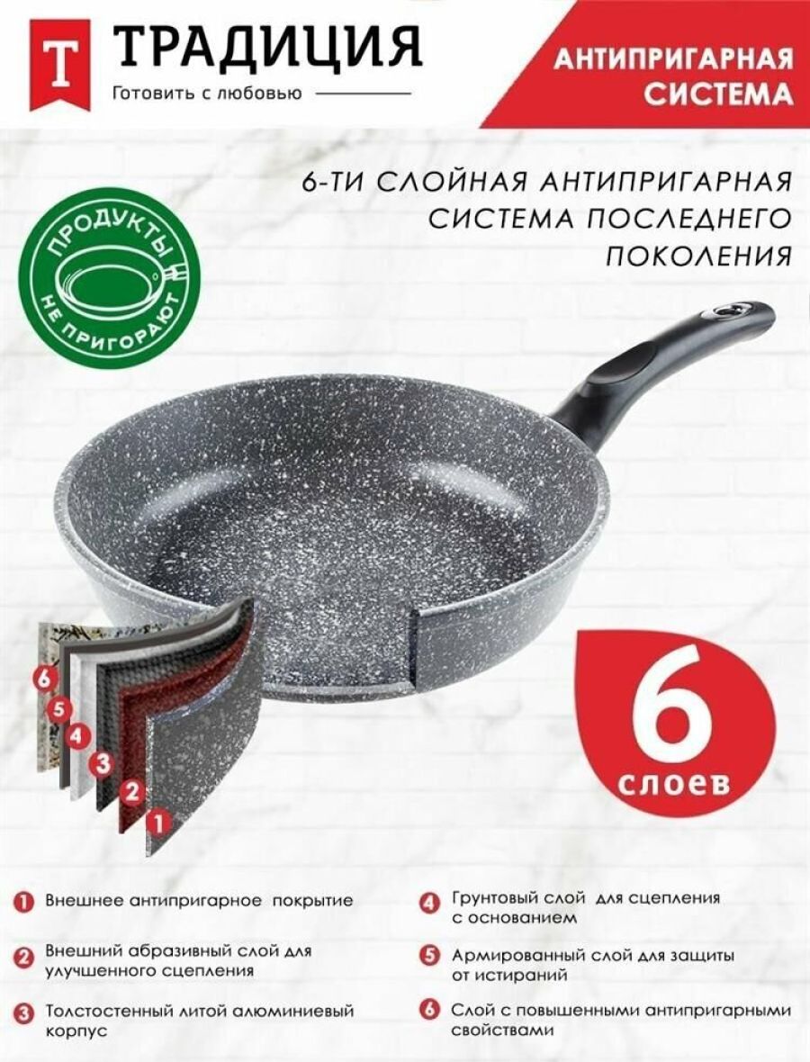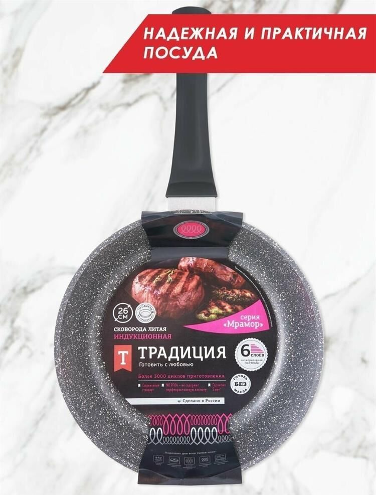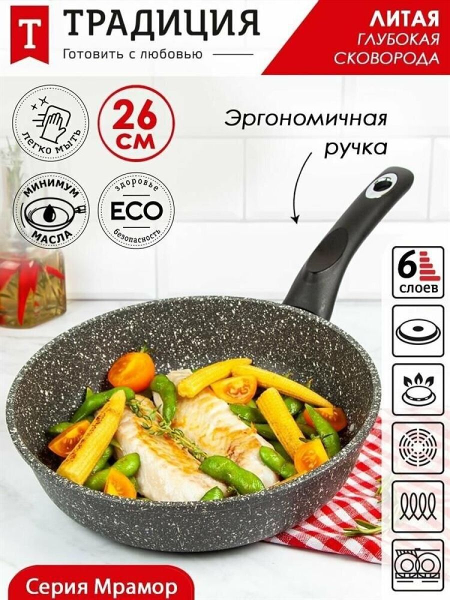 Объем, л./размер, см: 26 см Материал: литой алюминий Коллекция/серия: Мрамор Торговая марка: Традиция Толщина дна: 6 Толщина стенок: 4.2 Источник тепла: Все виды плит, кроме индукционной Тип упаковки: цветной рукав Внутреннее покрытие: антипригарное покрытие Pfluon Внешнее покрытие: антипригарное покрытие Pfluon