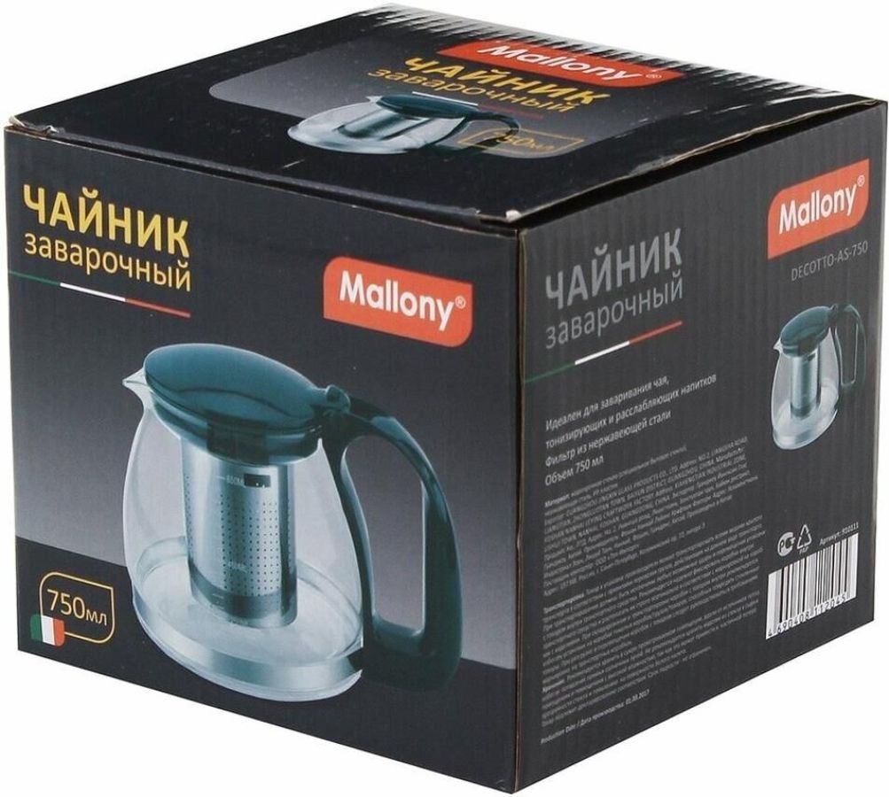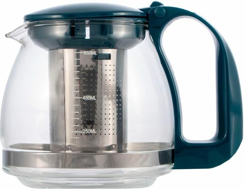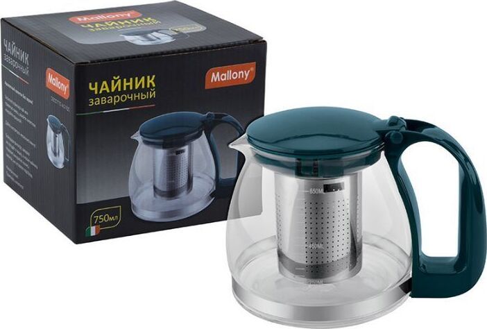 Чайник заварочный Отметки литража Корпус из жаропрочного стекла/крышка/ ручка из пластика Фильтр из нержавеющей стали Объем — 750 мл Толщина стекла — 1,7мм 4~11.5×10-6 — коэффициент линейного расширения Упаковка — пузырчатая пленка/цветная коробка