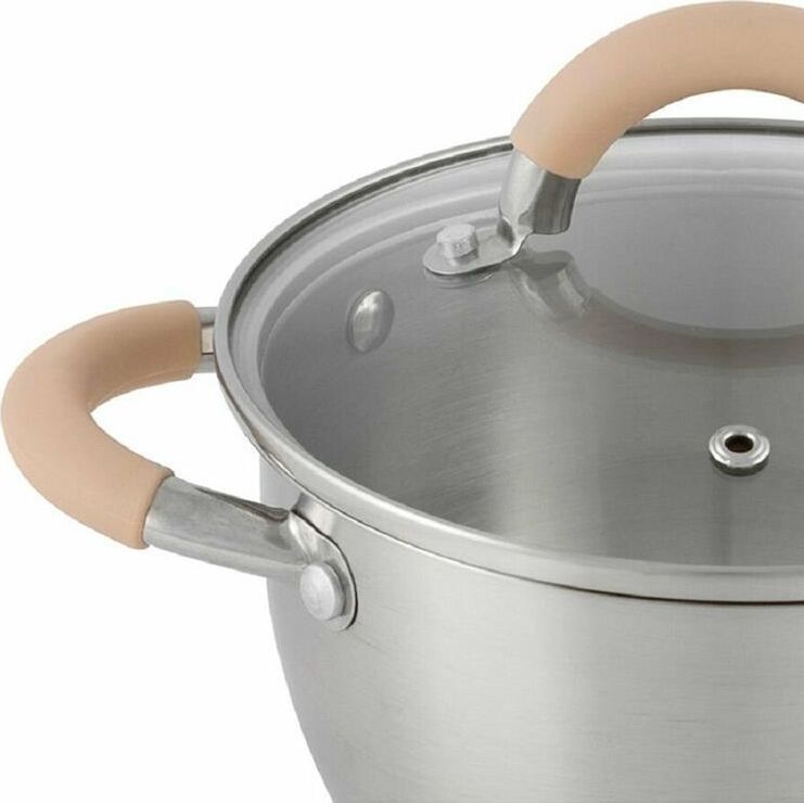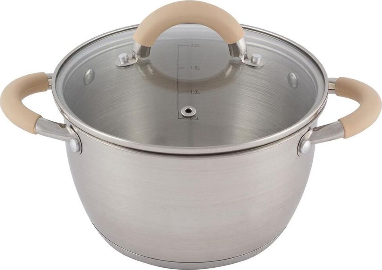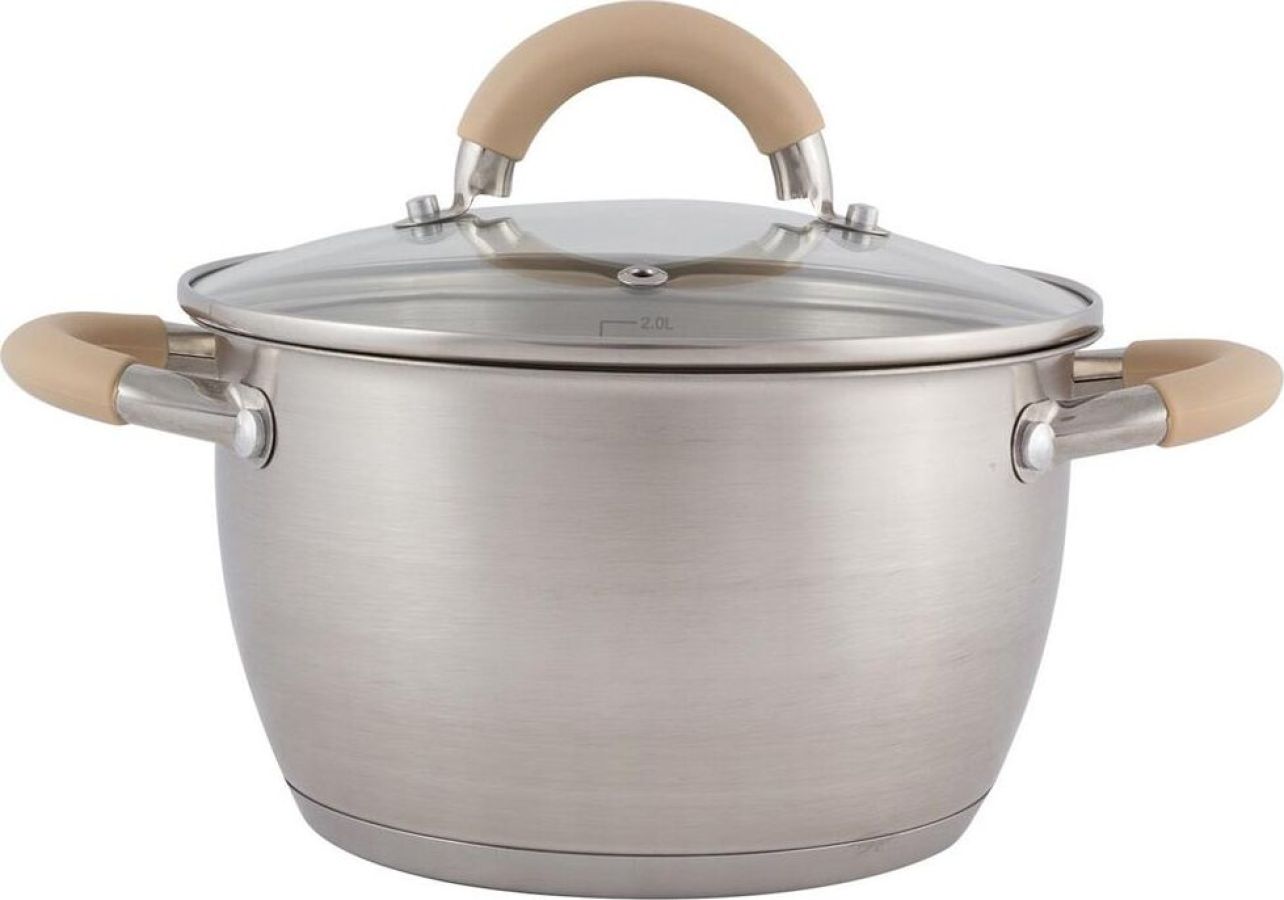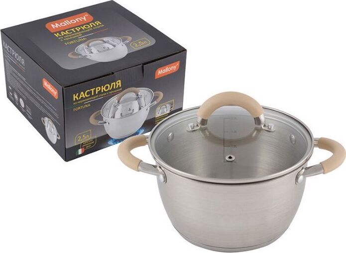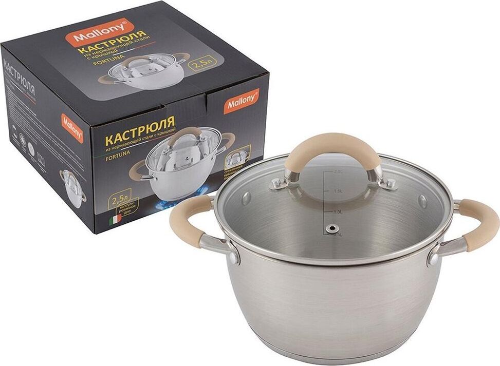 Кастрюля из нерж стали с крышкой, матовая,2,5 л, серия Fortuna, V-shape, ручки с сил-ном, тм Mallony Объем: 2,5 литра. Материалы: нерж сталь 201 (толщина стенок 0,5 мм), силикон, алюминий, 430 сталь, жаропрочное стекло. Размер: 18*11,5 см, капсулированное 3-слойное дно (нерж сталь 201+1,5 мм алюминий+ база 430 сталь), подходит для всех типов плит, матовая внутри и снаружи, крышка из жаропрочного стекла с отверстием для выпуска пара, С-тип, отметки литража, ручки полые из нерж стали 201 с силиконовыми вставками, упаковка — пакет и цветная коробка. Не рекомендуется мыть в посудомоечной машине. Мыть теплой водой с мягким моющим средством.