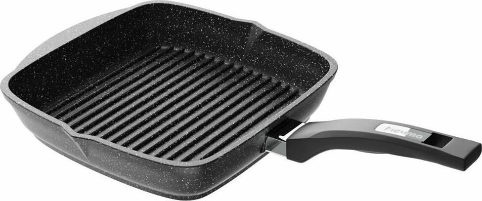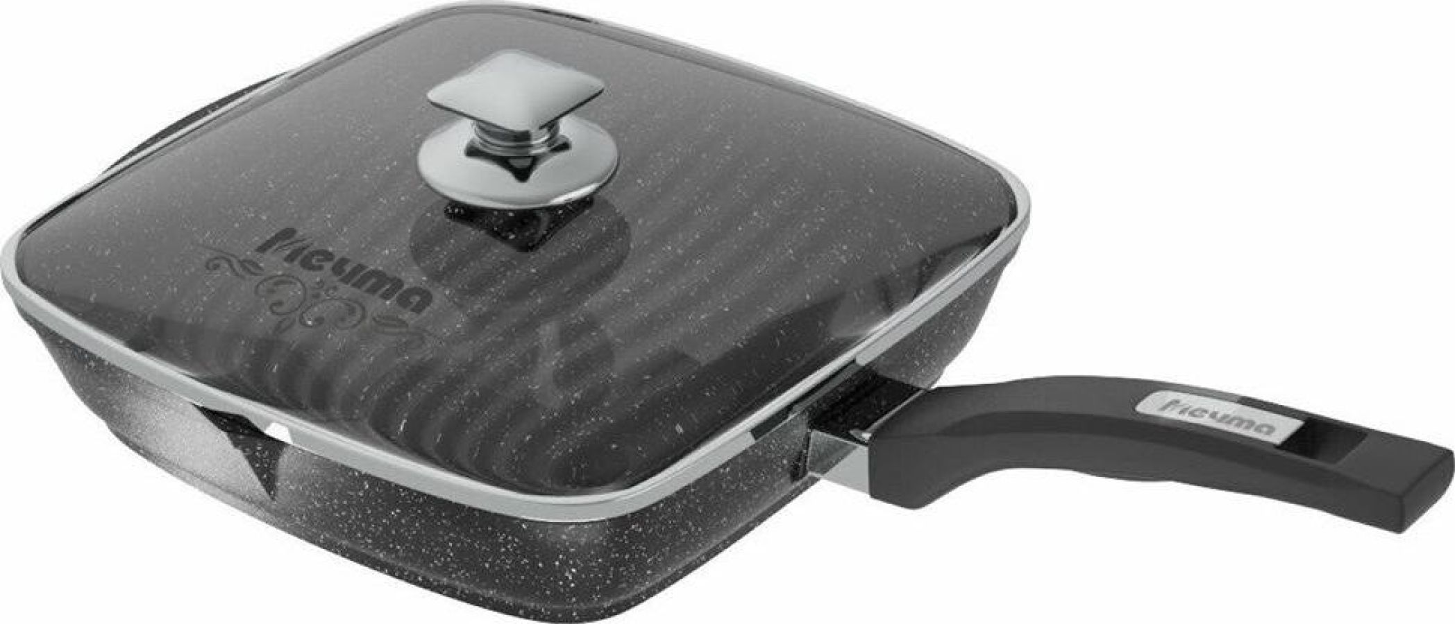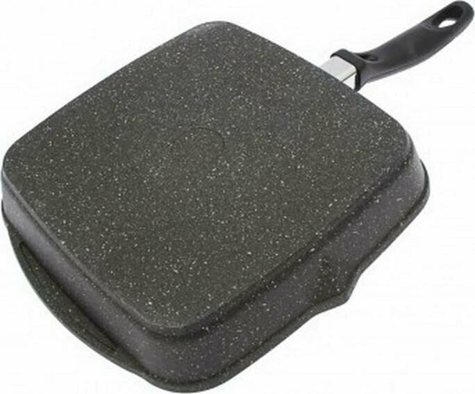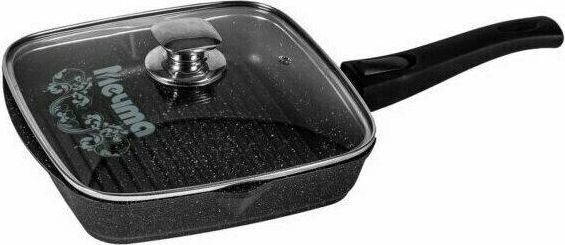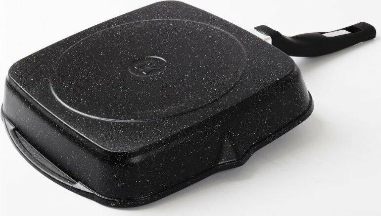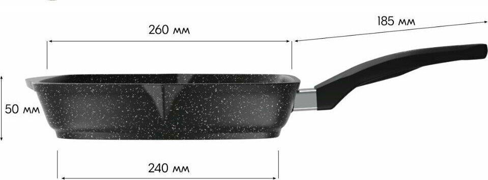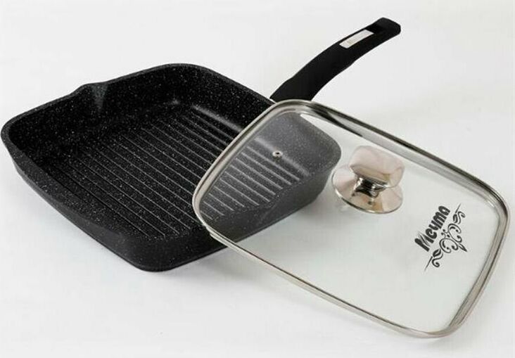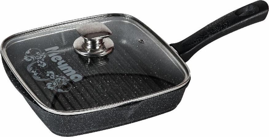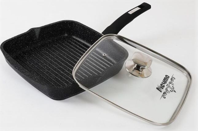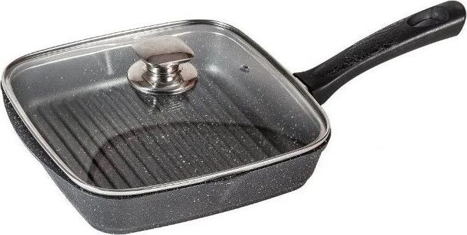 Сковорода-гриль квадр. 26*26 смс антипригарным покрытием, несъемной ручкой и стеклянной крышкой серии "Гранит black". Подходит для всех типов плит, кроме индукционных. Можно использовать в посудомоечной машине.