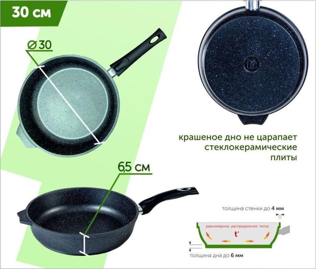 Сковорода 30 см. с антипригарным покрынием и несъемной ручкой серии "Гранит" Подходит для всех типов плит, кроме индукционных. Можно использовать в посудомоечной машине.