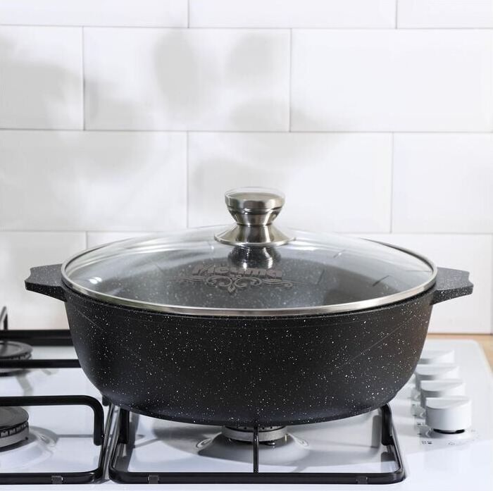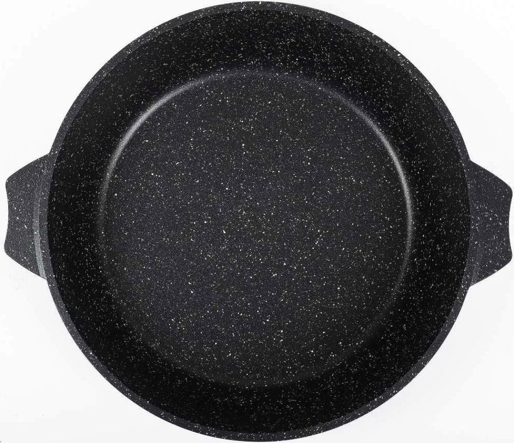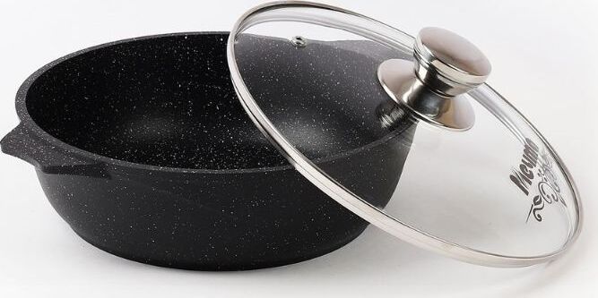 Жаровня 5л с антипригарным покрытием и стеклянной крышкой серии "Гранит black" Подходит для всех типов плит, кроме индукционных. Можно использовать в посудомоечной машине. Можно использовать в духовке отдельно без крышки.