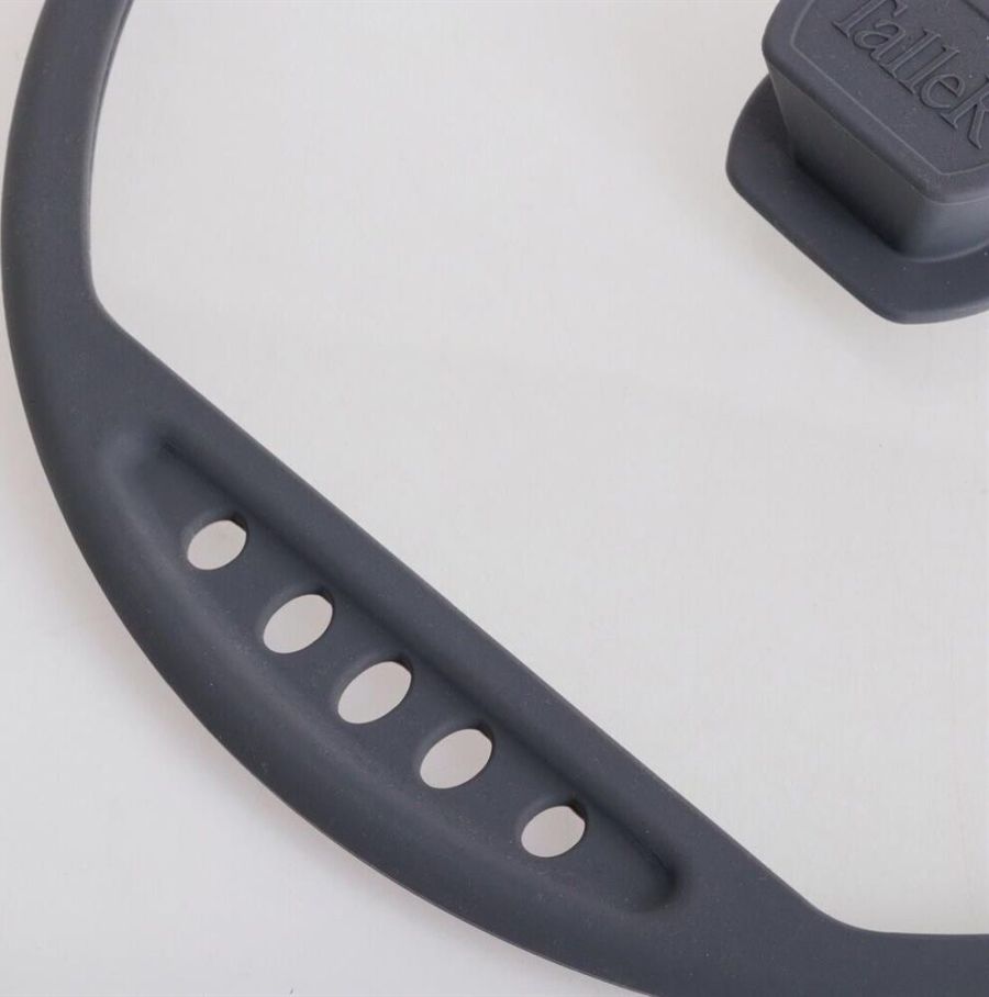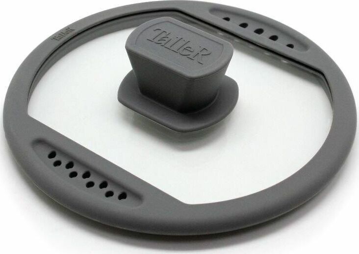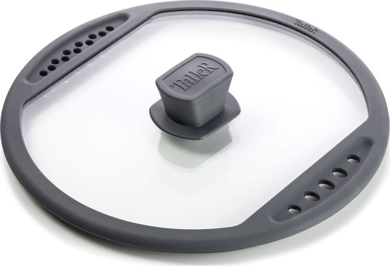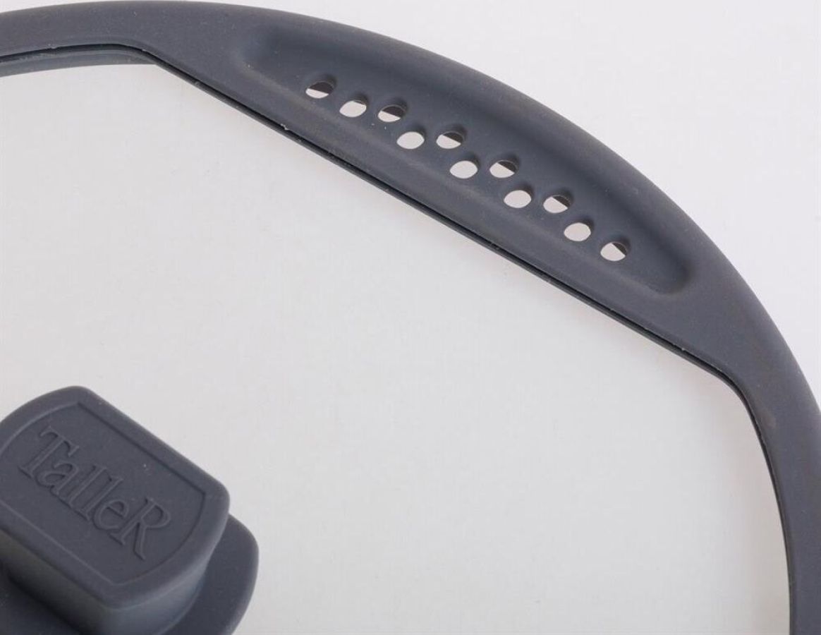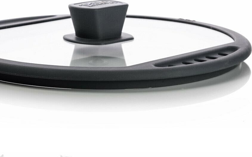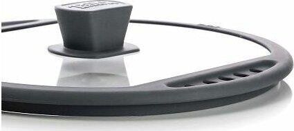 Крышка из жаропрочного стекла, диаметр 28см. Силиконовый обод с отверстиями для слива жидкости, силиконовая ручка. Нельзя использовать в духовке.