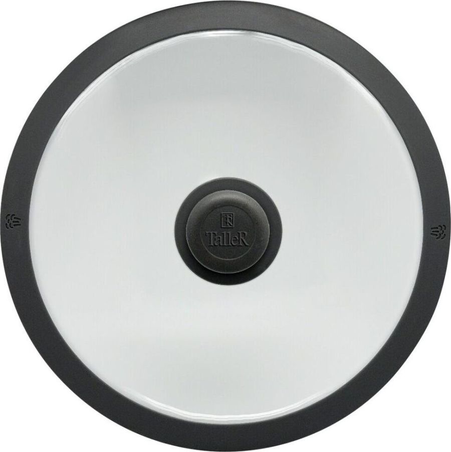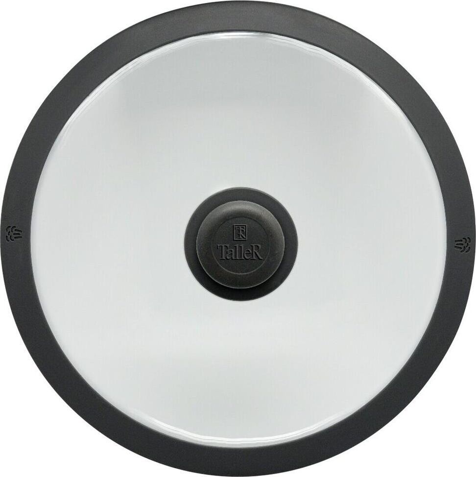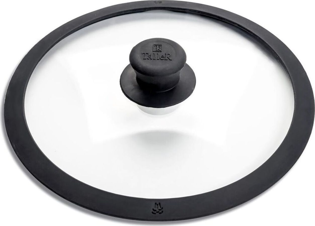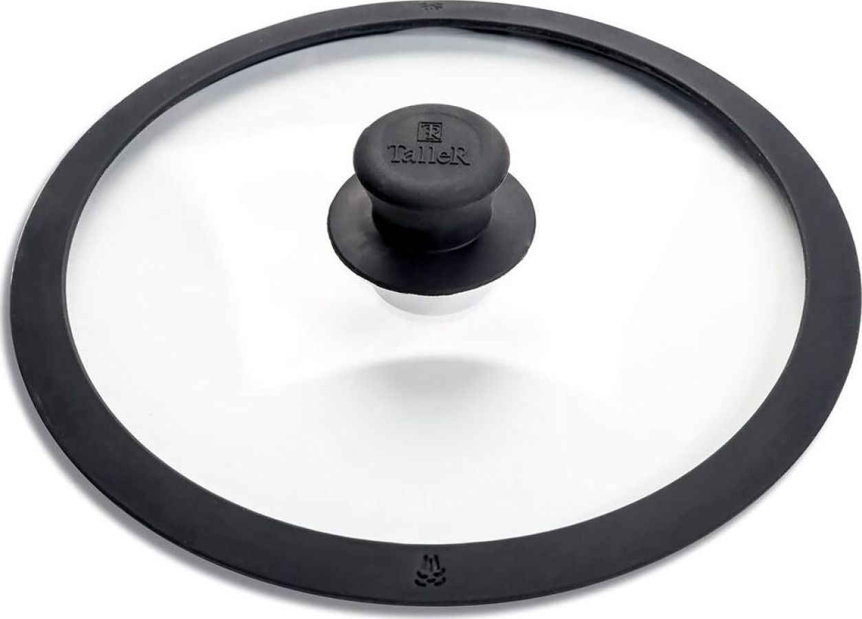 Крышка из жаропрочного стекла, диаметр 26см. Силиконовый обод с отверстиями для паровыпуска, силиконовая ручка. Нельзя использовать в духовке.