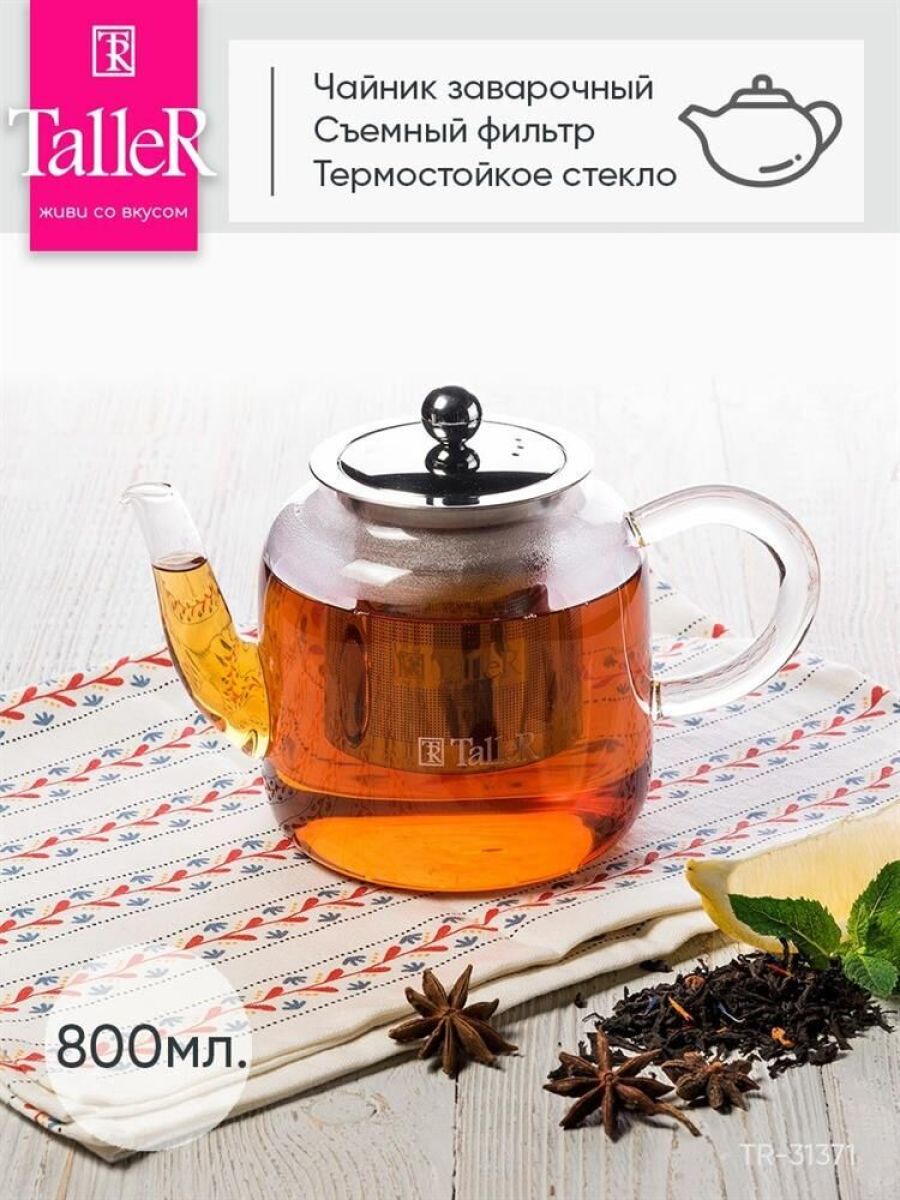 Чайник для заваривания, 800 мл. Термостойкое боросиликатное стекло. Съемный фильтр из нержавеющей стали. Пригоден для мытья в посудомоечной машине.