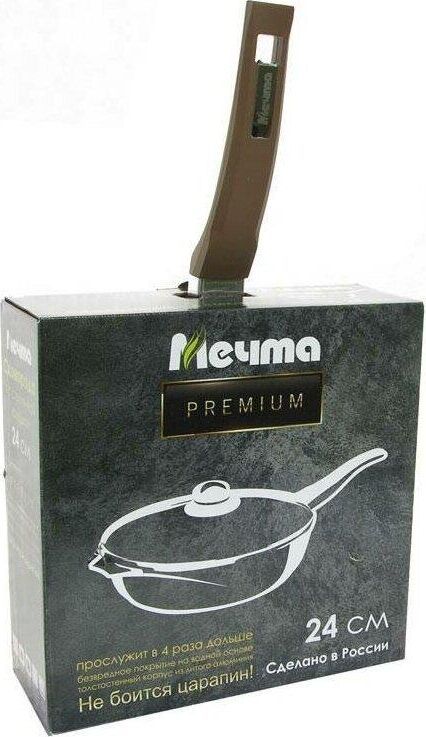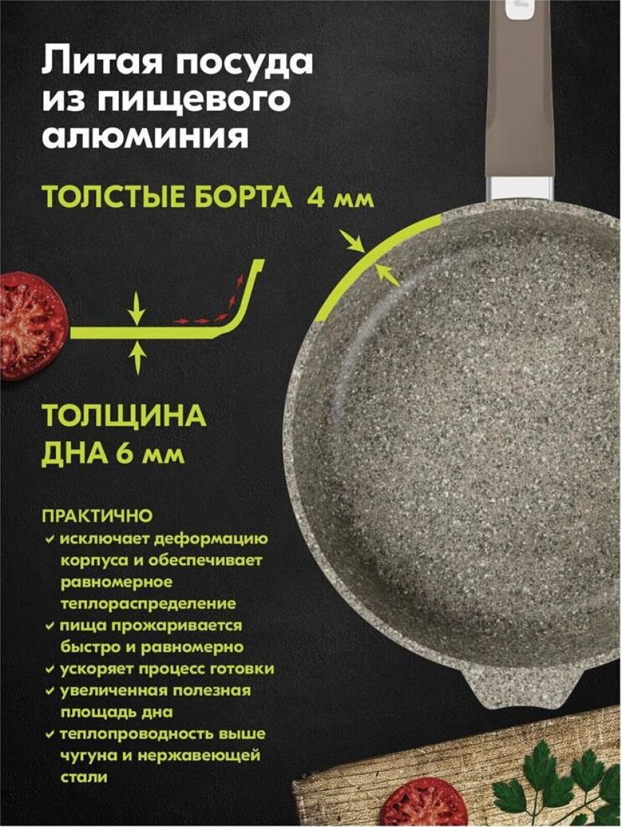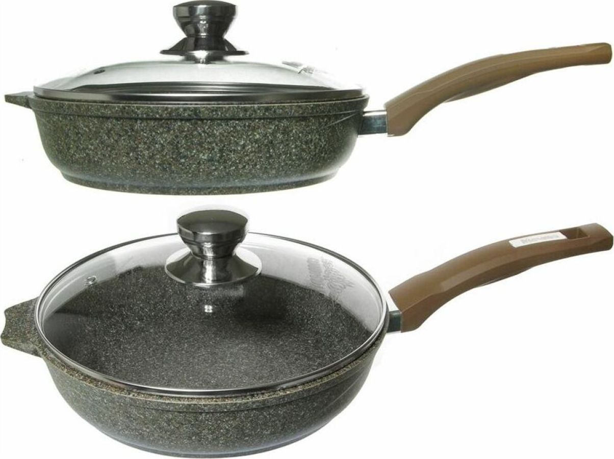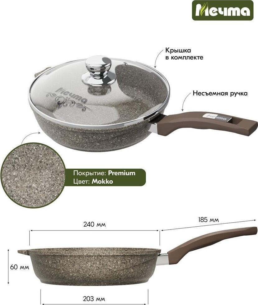 Сковорода 24см c антипригарным покрытием, несъемной ручкой и стеклянной крышкой серии "Premium" цвет mokko. Подходит для всех типов плит, кроме индукционных. Можно использовать в посудомоечной машине.
