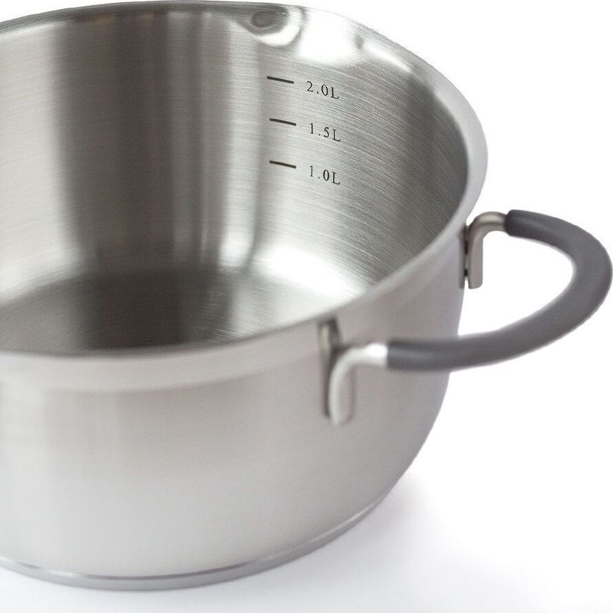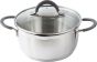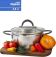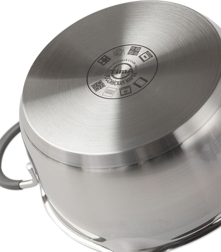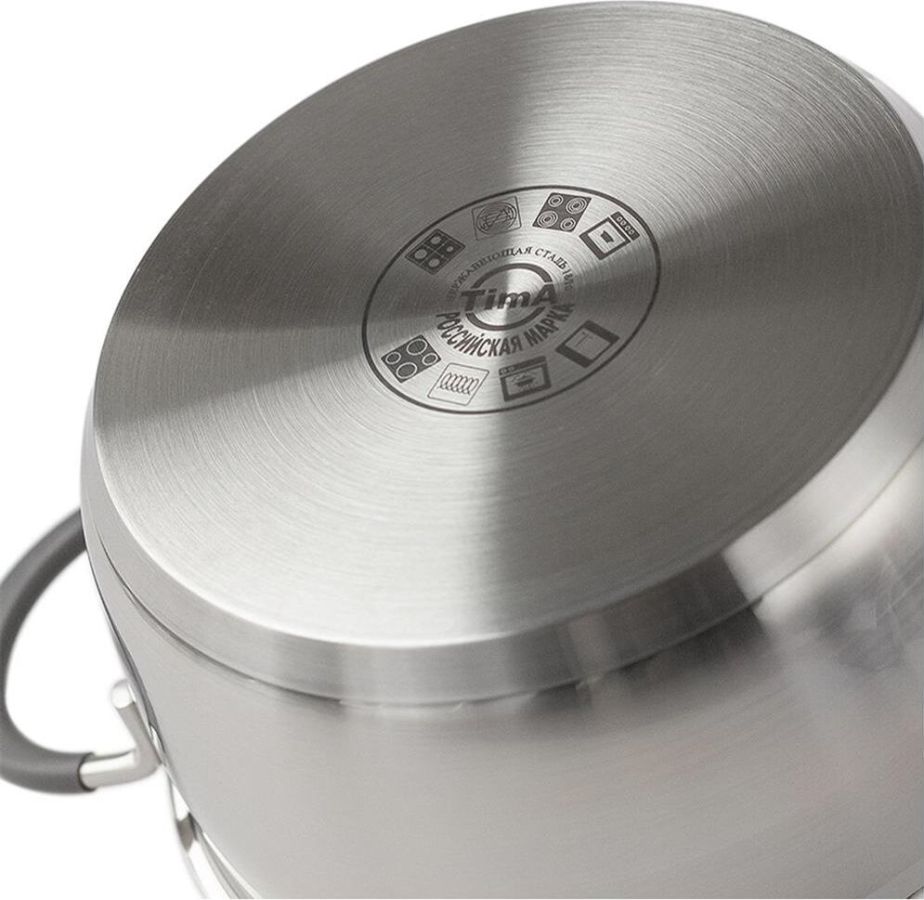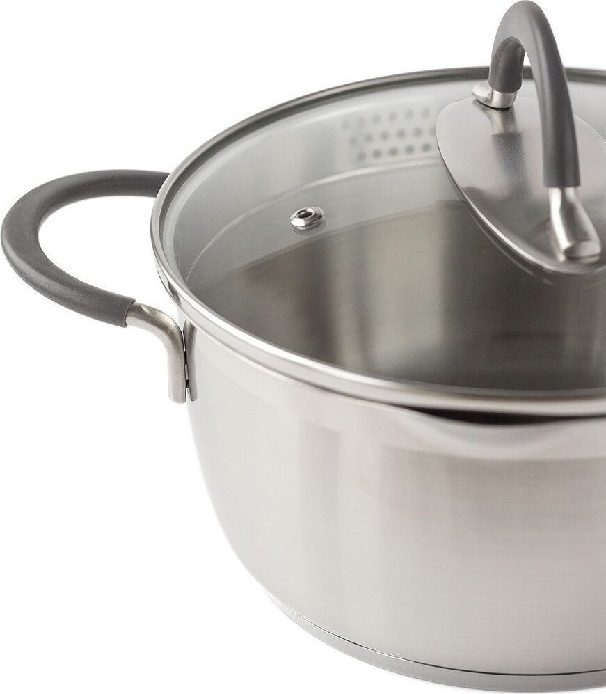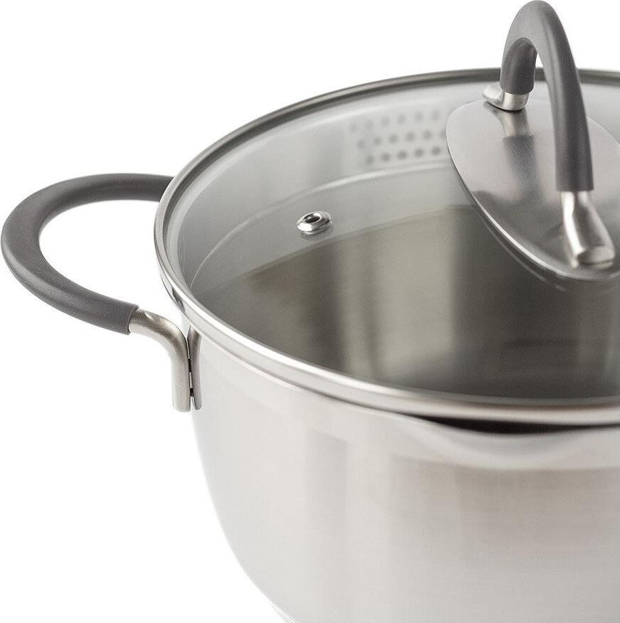 Кастрюля изготовлена из высококачественной нержавеющей стали. Толщина стенок 0,6 мм. Толстое капсулированное дно 4.5 мм с алюминиевой вставкой, обеспечивает идеальное распределение тепла. Прозрачная крышка из термостойкого стекла со стальным ободком, позволяет не только следить за процессом приготовления пищи, но и удобно сливать жидкости. На ободе крышке есть специальные отверстиями различного диаметра. На внутренней стороне нанесена мерная шкала.