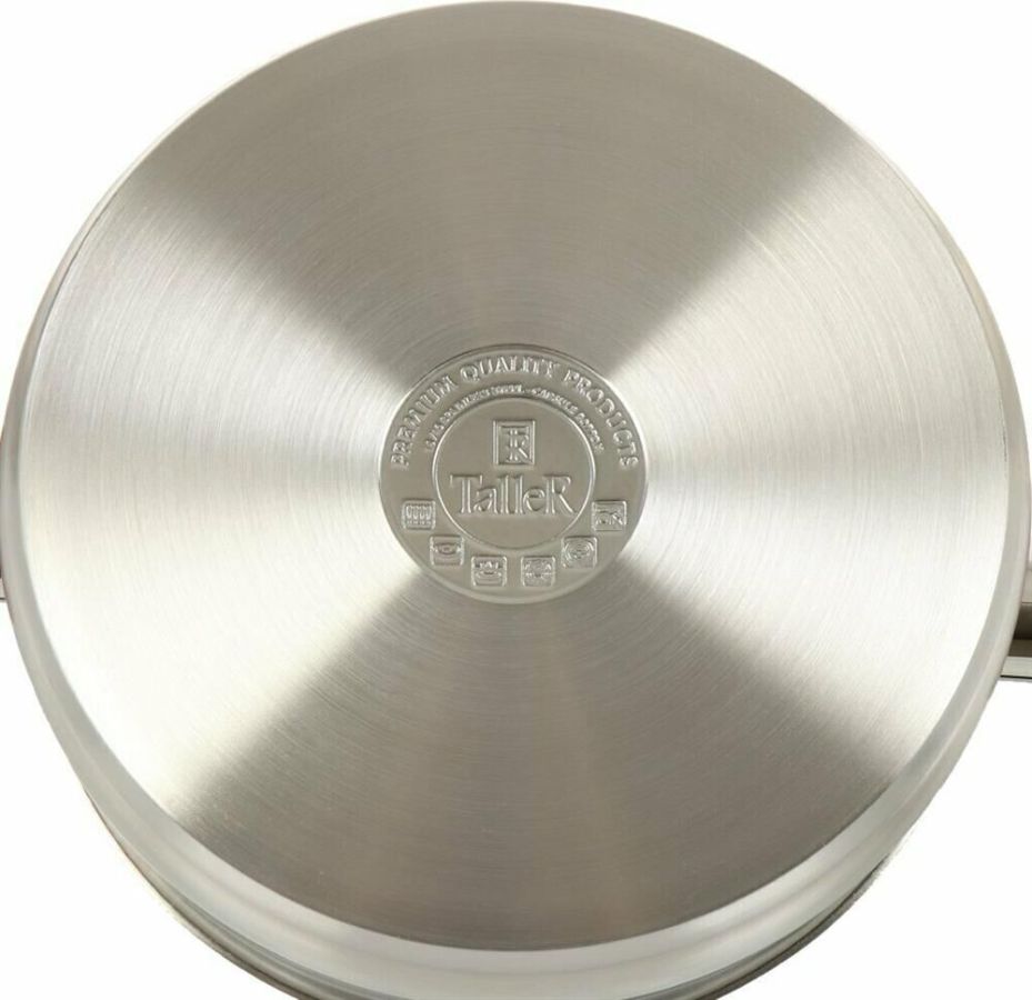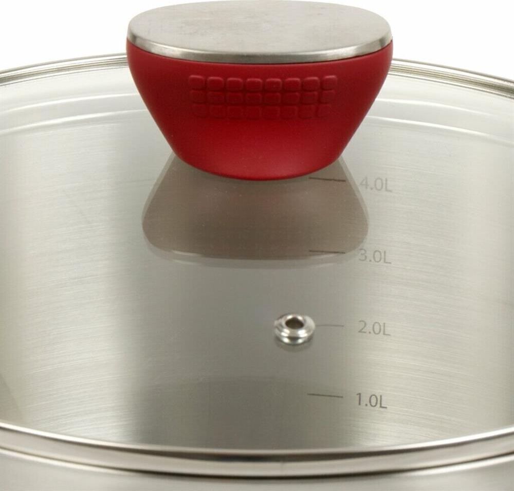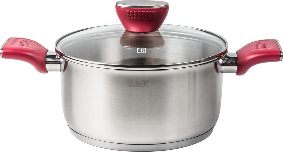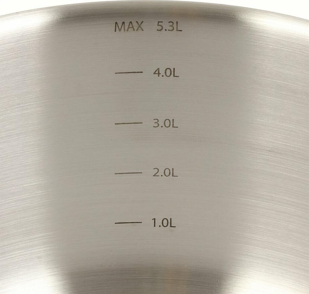 Кастрюля "Грейси" с крышкой 24 см, 5,3 л Толщина стенки — 0,5 мм. Толщина дна 4 мм. Внешний диаметр дна 21,8 см. Крышка из жаропрочного стекла со стальным ободом и отверстием для выхода пара. Бакелитовые ручки. Есть отметки литража. Рекомендации: нельзя