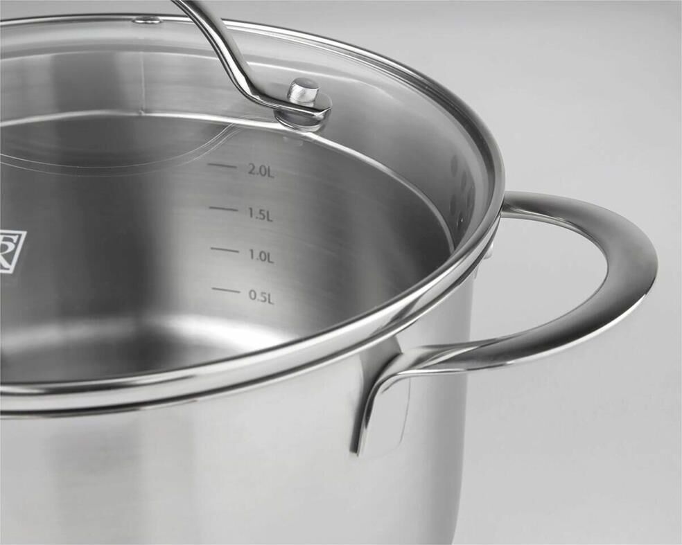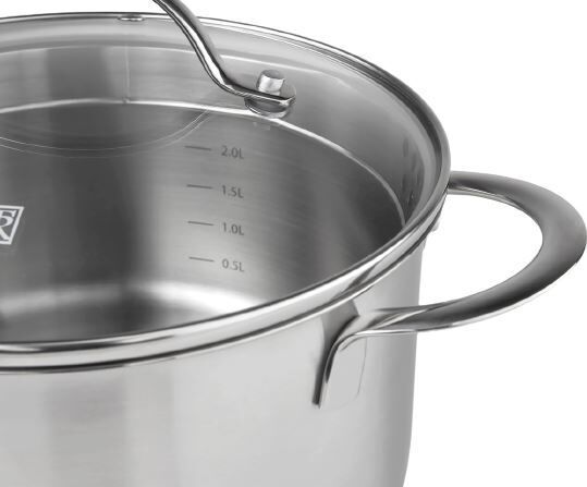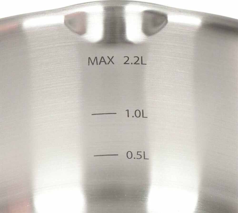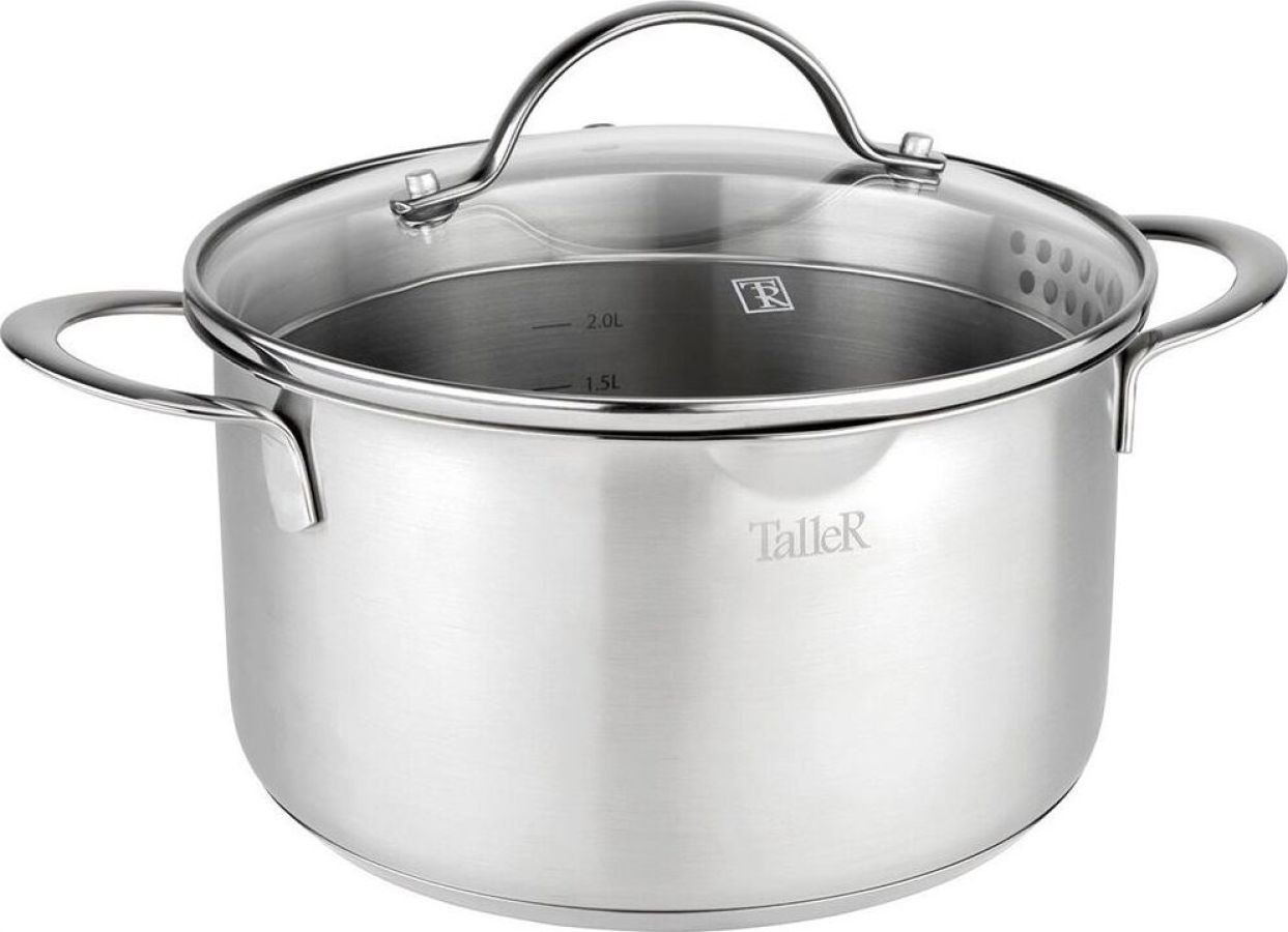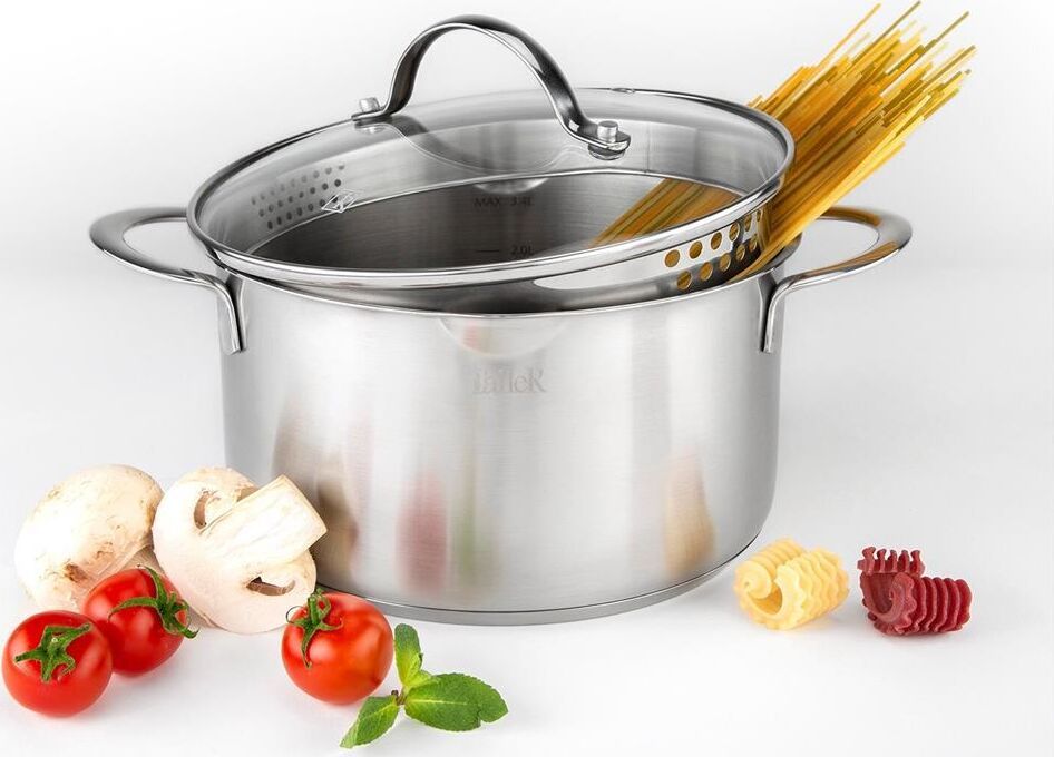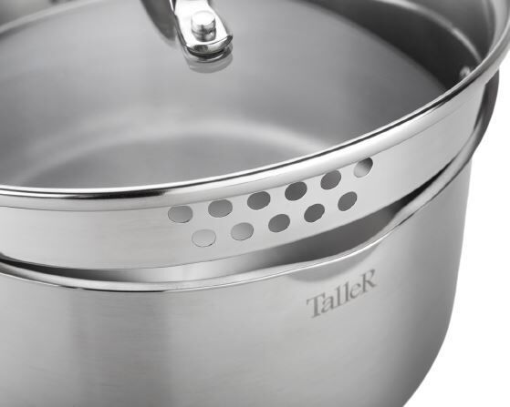 Сталь 18/10, толщина дна/стенки 4.0/0,6мм, сливной носик, крышка с перфорацией для удобного слива жидкости. Ручки из нержавеющей стали. Отметки емкости на внутренней стенке кастрюли, матовая внутренняя и внешняя полировка. Упаковка: цветная коробка. Разме