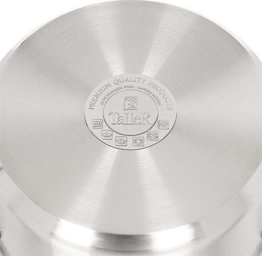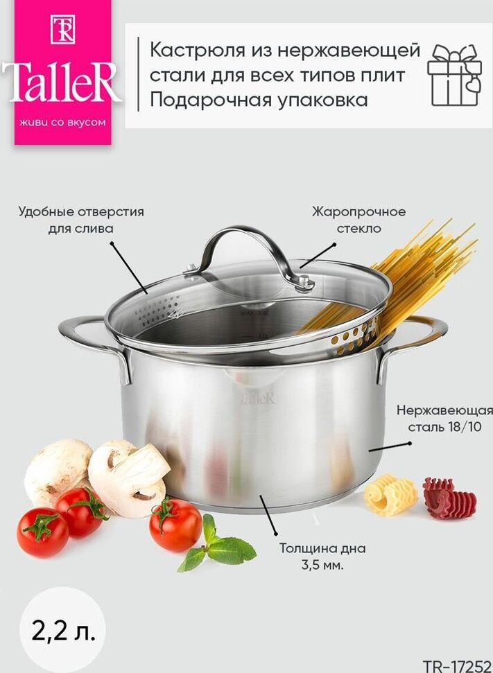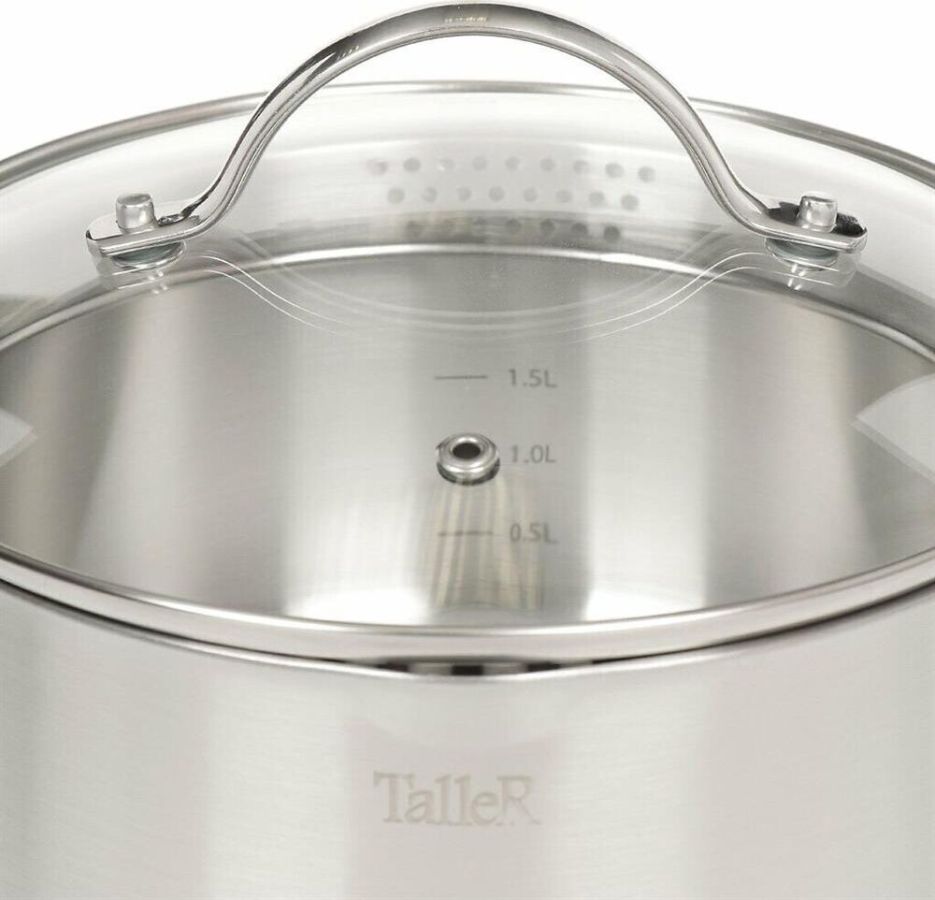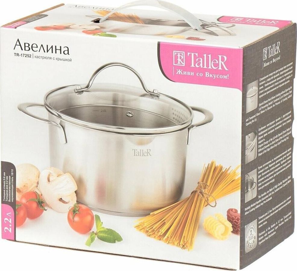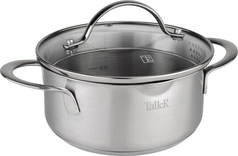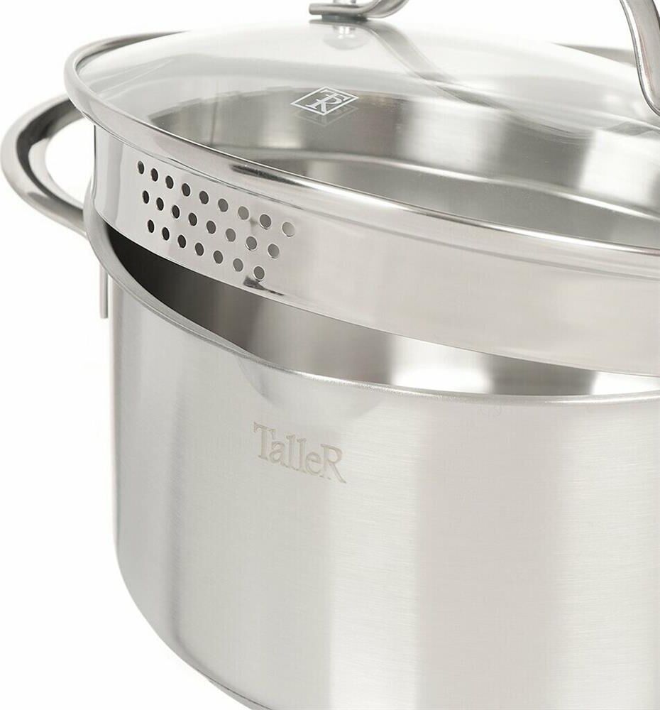 Сталь 18/10, толщина дна/стенки 4.0/0,6мм, сливной носик, крышка с перфорацией для удобного слива жидкости. Ручки из нержавеющей стали. Отметки емкости на внутренней стенке кастрюли, матовая внутренняя и внешняя полировка. Упаковка: цветная коробка. Разме