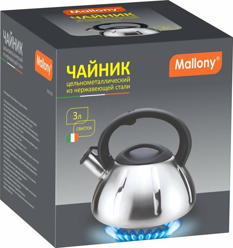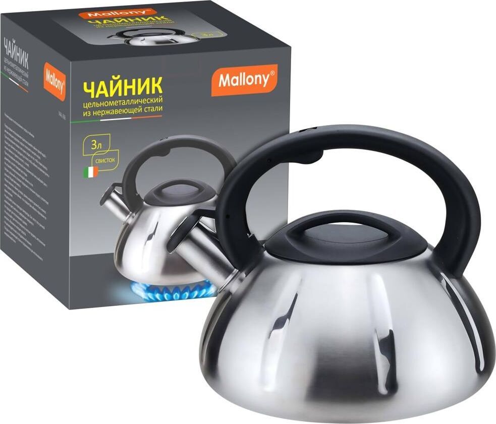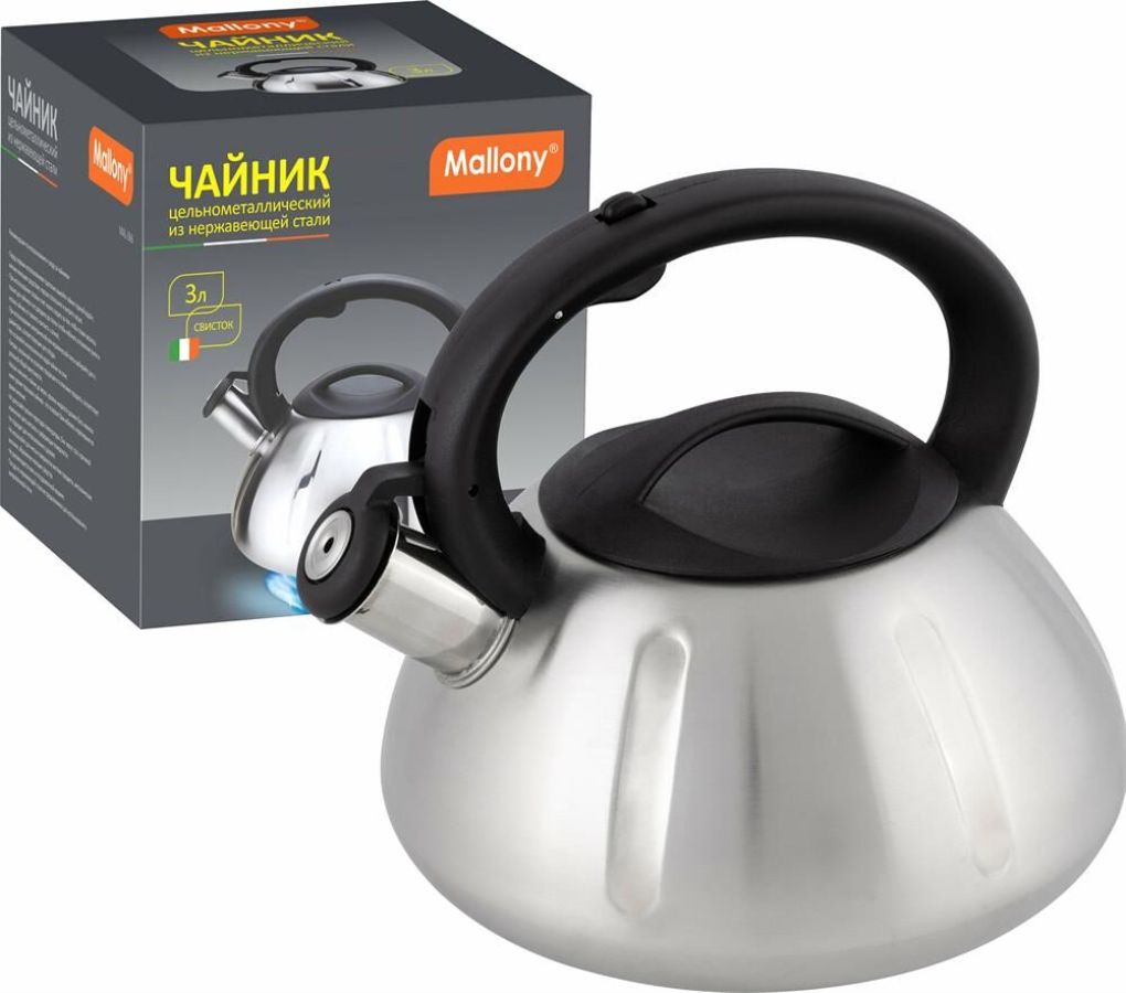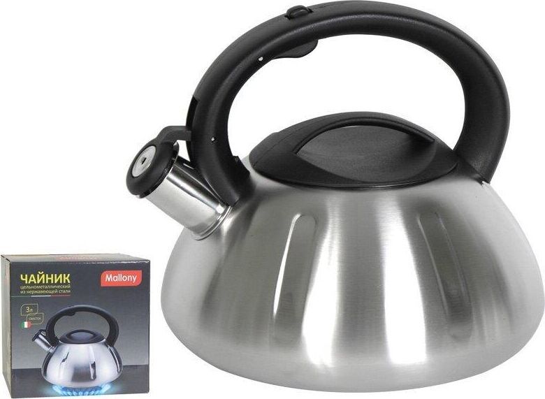 Чайник из нерж. стали 201 со свистком Объем: 3 литра Материал: нержавеющая сталь, пластмасса Толщина стенок — 0,5 мм Цельнометаллический Cо свистком Цвет: матовый Однослойное дно, толщина дна 0,6 мм Подходит для всех типов плит. Не рекомендуется мыть в посудомоечной машине. Упаковка: инд. цветная коробка