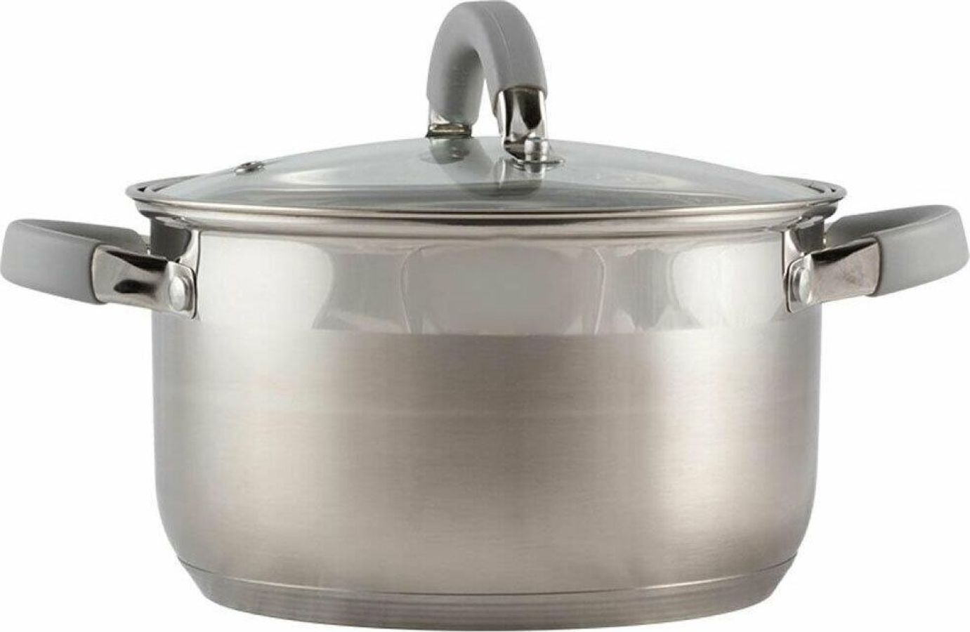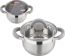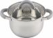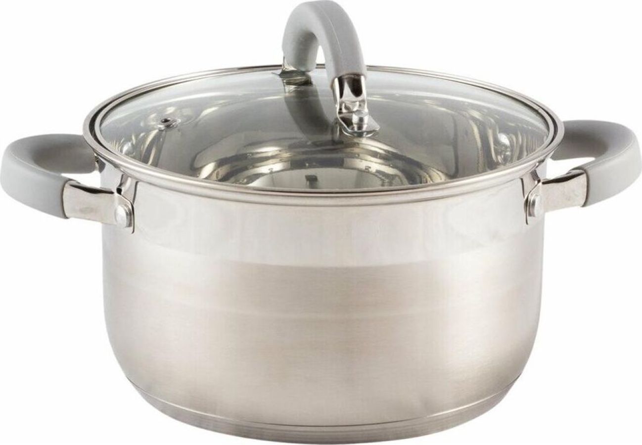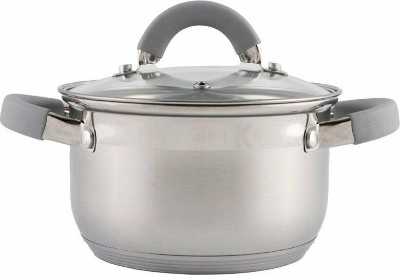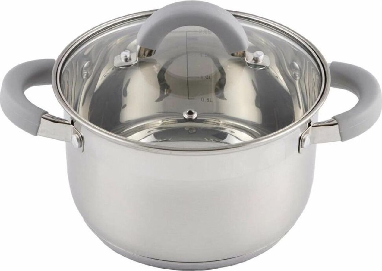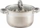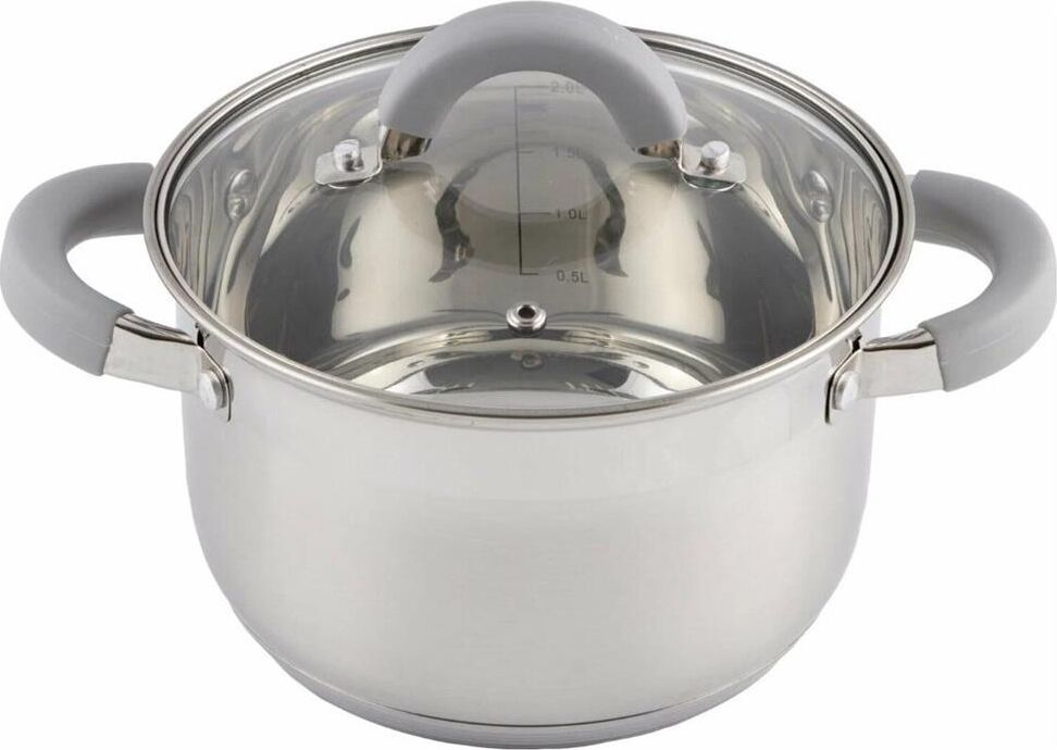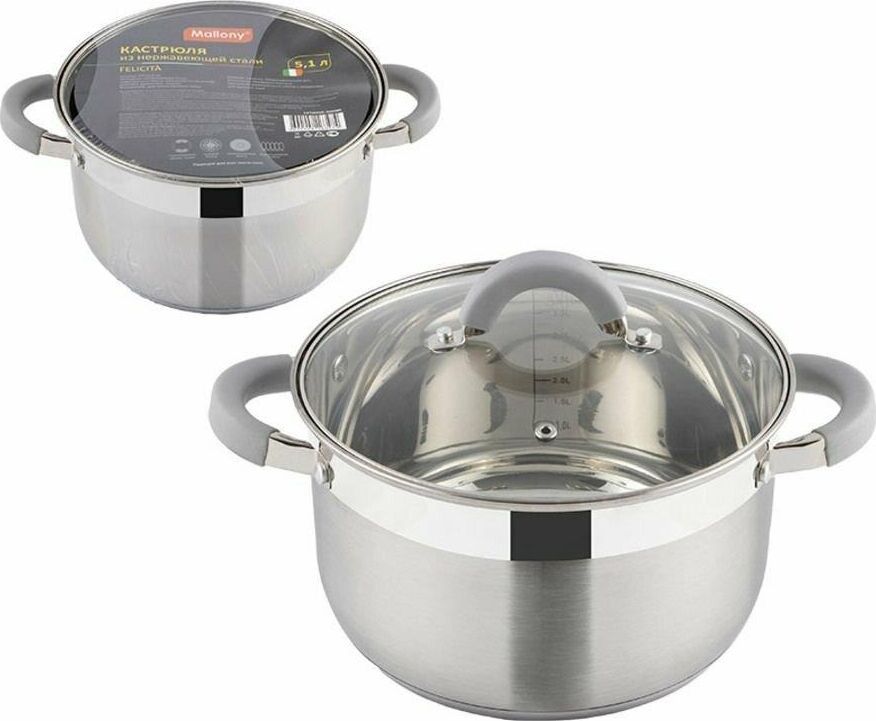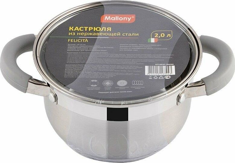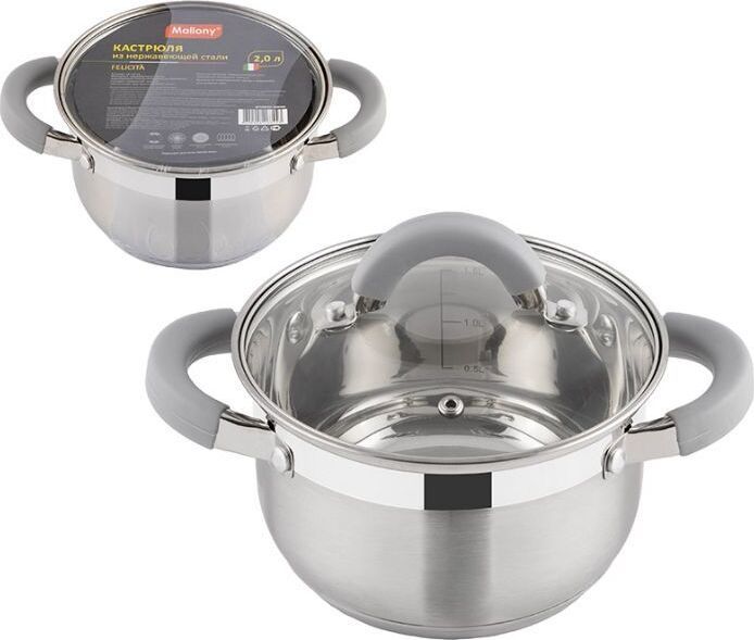 Кастрюля Felicità, объем 2 л, из нерж стали с крышкой из жаропрочного стекла, размер 16*10 см Материал: нерж сталь № 201, жаропрочное стекло, силикон, алюминий, нерж сталь № 430, железо. Размер: 16*10 см/Объем: 2 л. Толщина стенок — 0,5 мм, 5-слойное капсулированное дно/толщина дна 3,5 мм (0,5 мм нерж сталь 201+0,5 мм алюминий + 1 мм железо +0,5 мм алюминий + 0,5 мм 430 сталь). Подходит для всех типов плит. Зеркальная полировка внутри. Отметки литража. Внешний корпус — смешанный тип полировки (матовый с зеркальной полосой в верней части). Крышка С-типа из жаропрочного стекла с отверстием для выпуска пара. Полые ручки из нерж стали с покрытием из силикона. Инд упаковка: термоусадка + цветной круглый вкладыш + пакет. Диаметр дна: 13,5 см Диаметр крышки: 16,5 см