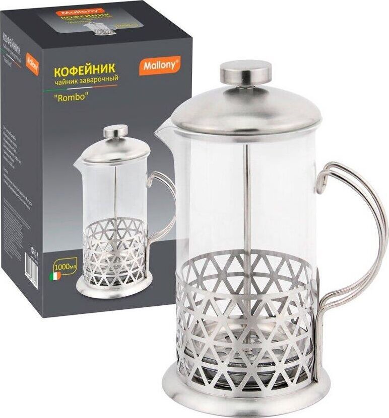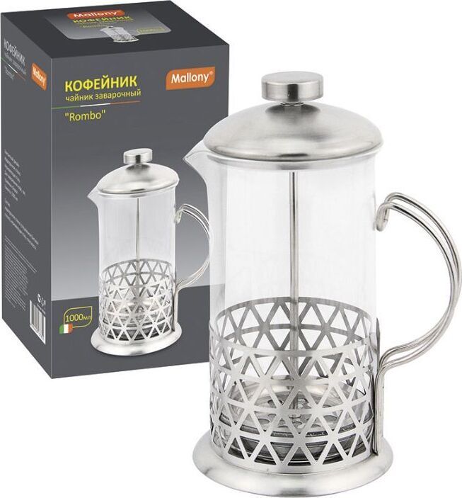 Кофе-пресс/чайник заварочный серия Rombo, объем 1000 мл, тм Mallony Предназначен для заваривания чая, кофе, прочих напитков. Коэффициент линейного расширения — 3,0. Корпус/фильтр/стержень из нержавеющей стали № 201, колба из жаропрочного боросиликатного стекла. Крышка — нерж сталь № 201/пластмасса. Толщина стекла — 0,8 мм Толщина нерж стали — 0,3 мм Можно мыть только стекл колбу в посудомоечной машине, остальные части не рекомендуется мыть в посудомоечной машине (можно мыть мягким моющим средством и теплой водой, хорошо просушивать). Упаковка: цветная картонная коробка.