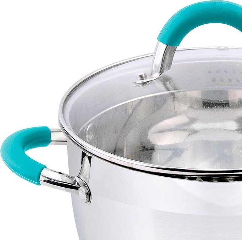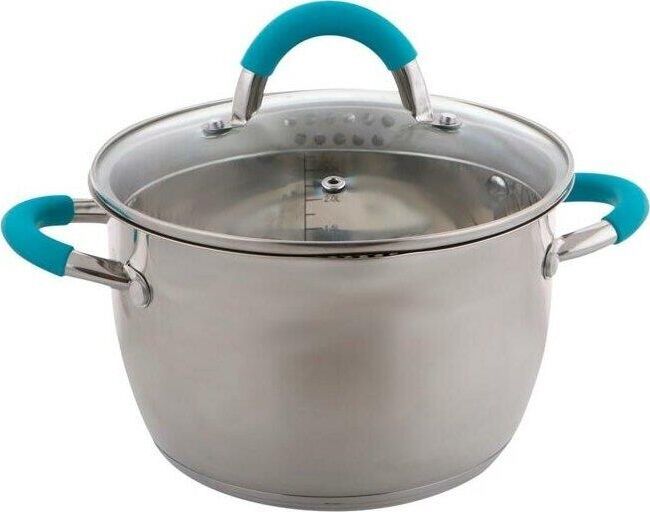 Кастрюля из нержавеющей стали с крышкой (тип стали — 201), КРЫШКА с ДУРШЛАГОМ Объем — 2,1 литра, размер: 16*10,5 см Высота стенки без крышки — 10,5 см толщина стенок — 0,5 мм, капсулированное пятислойное дно (нерж сталь 201 + 0,5 мм алюминий + 1,5 мм железо + 0,5 мм алюминий + 430 нерж сталь), толщина 3,5 мм Метод производства — штамповка, тип крепления ручек — заклепочное внутри — зеркальная полировка с отметками литража, снаружи — смешанный тип полировки (верхняя часть — зеркальная, осн часть — матовая), Крышка-дуршлаг из жаропрочного стекла с отверстием для выпуска пара, а также боковыми отверстиями разного диаметра для слива жидкости. Эргономичные носики для слива жидкости. Ручки из нержавеющей стали, полые с покрытием из силикона, упаковка — цветная коробка. Корпус кастрюли дополнительно упакован в пакет, крышка в пузырчатую пленку, ручки защищены доп упаковкой. Подходит для всех типов плит. Не рекомендуется мыть в посудомоечной машине.