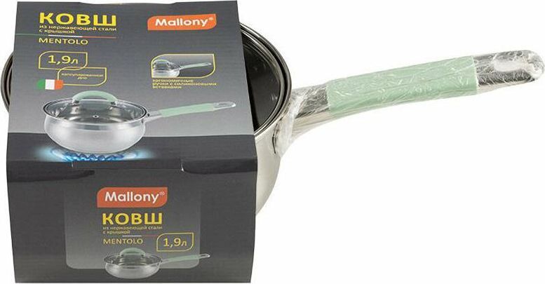 Ковш MENTOLO, 1,9 л, из нержавеющей стали с крышкой, ручки с силиконом Материал: нержавеющая сталь 201, жаропрочное стекло, силикон, алюминий, 430 сталь. Толщина стенок: 0,5 мм. Силиконовое покрытие на ручках. Ручки полые из нерж стали. Дно капсулированное: 201 сталь+1 мм алюм+430 сталь. Подходит для всех типов плит. Смешанная полировка внешнего корпуса, внутри — зеркальная полировка с отметками литража. Крышка из жаропрочного стекла с отверстием для выпуска пара. Размер 16*9,5 см. Объем 1,9 л. Упаковка: цветной ремень.