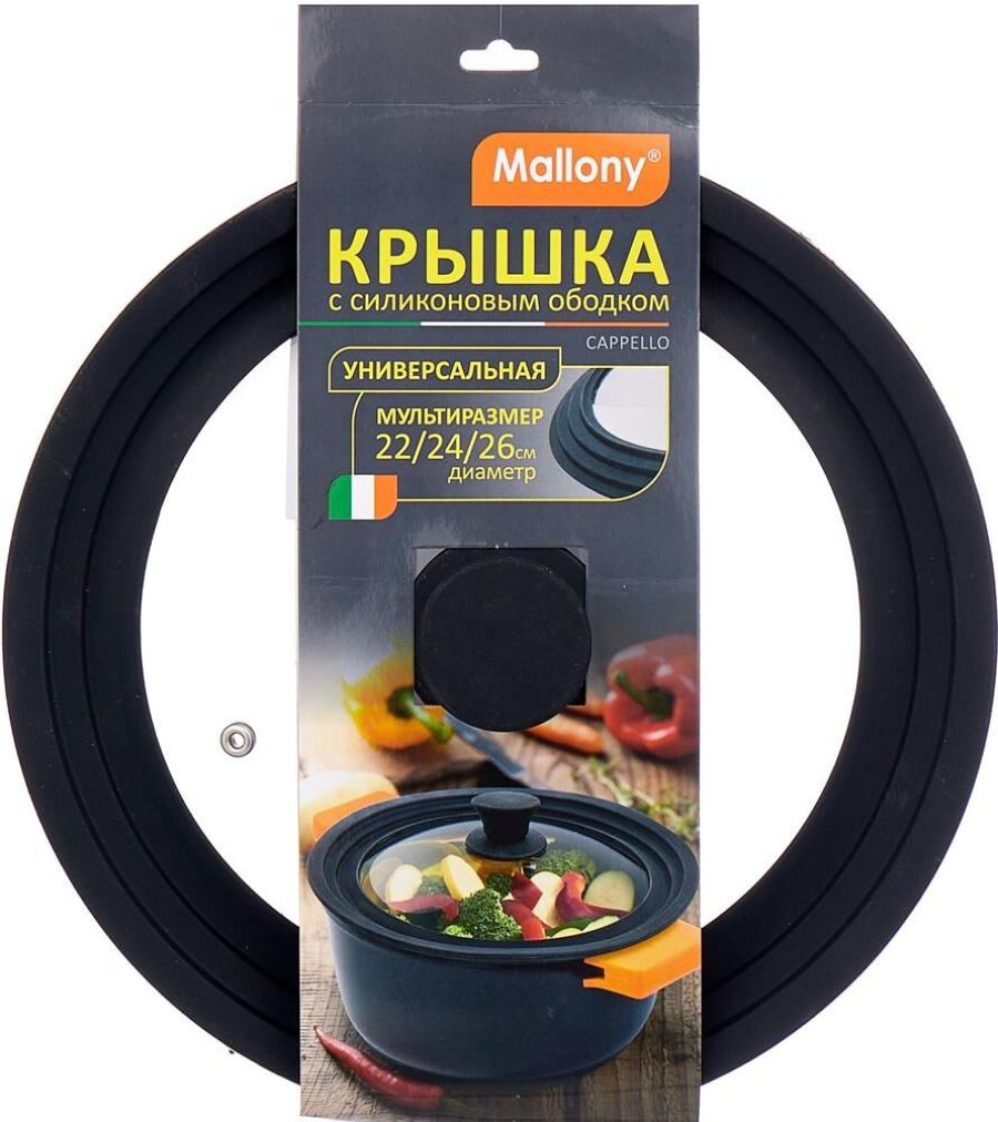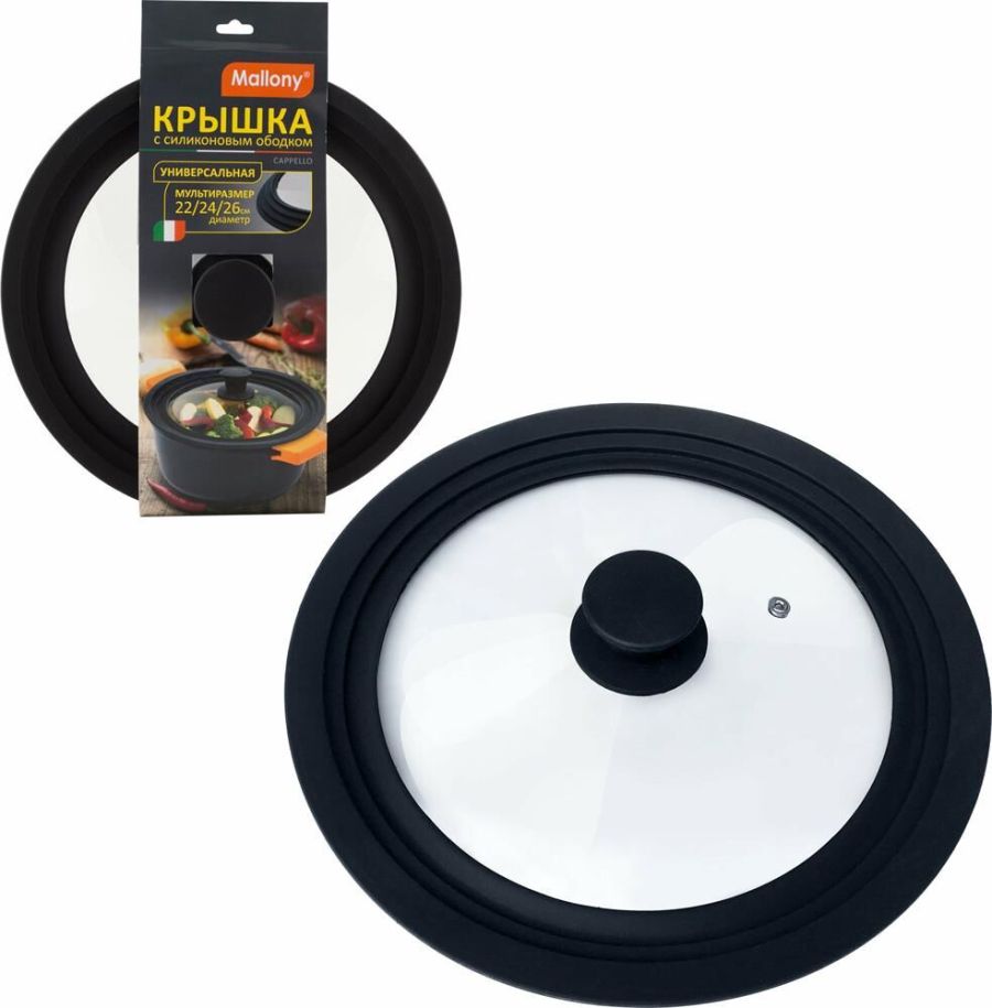 Крышка универсальныая CAPPELLO мультиразмер: 22/24/26см, материалы — закаленное стекло, силикон, нерж сталь толщина стекла — 4 мм; крепеж из 304 нерж стали Упаковка — цветной рукав + пузырчатая пленка Можно мыть в посудомоечной машине. Можно использовать в духовом шкафу. Крышка универсальная подходит для посуды разного диаметра 22/24/26см, имеет отверстие для выхода пара и силиконовый ободок, который предохраняет крышку от механических повреждений.