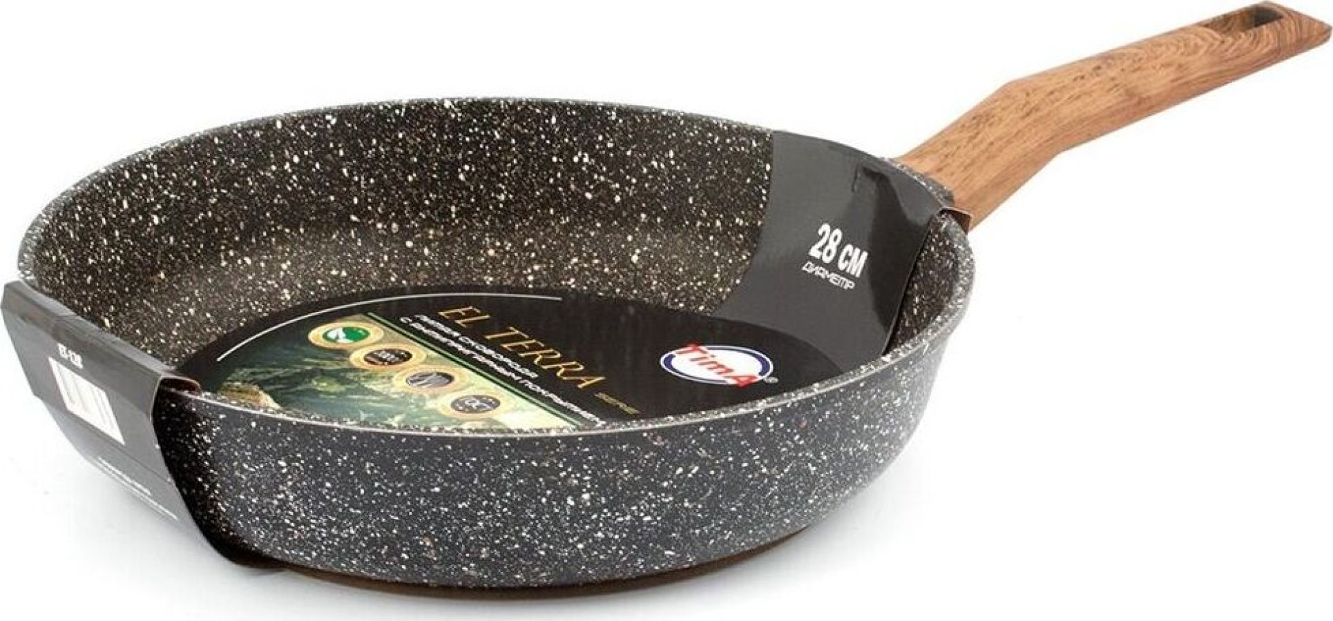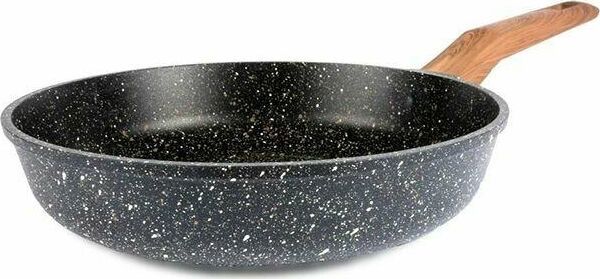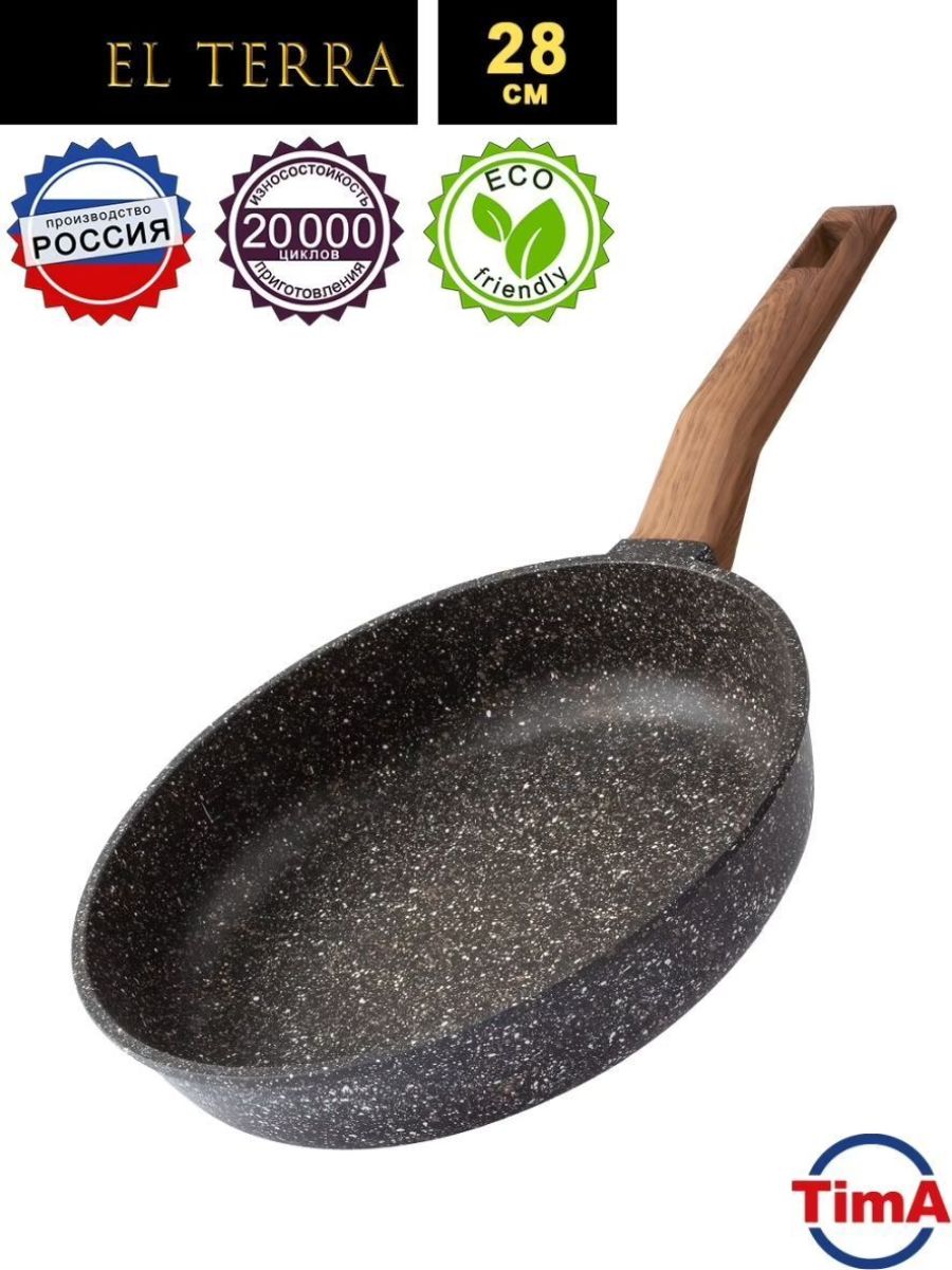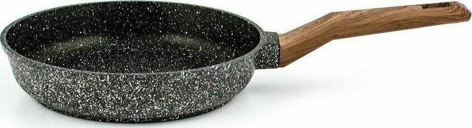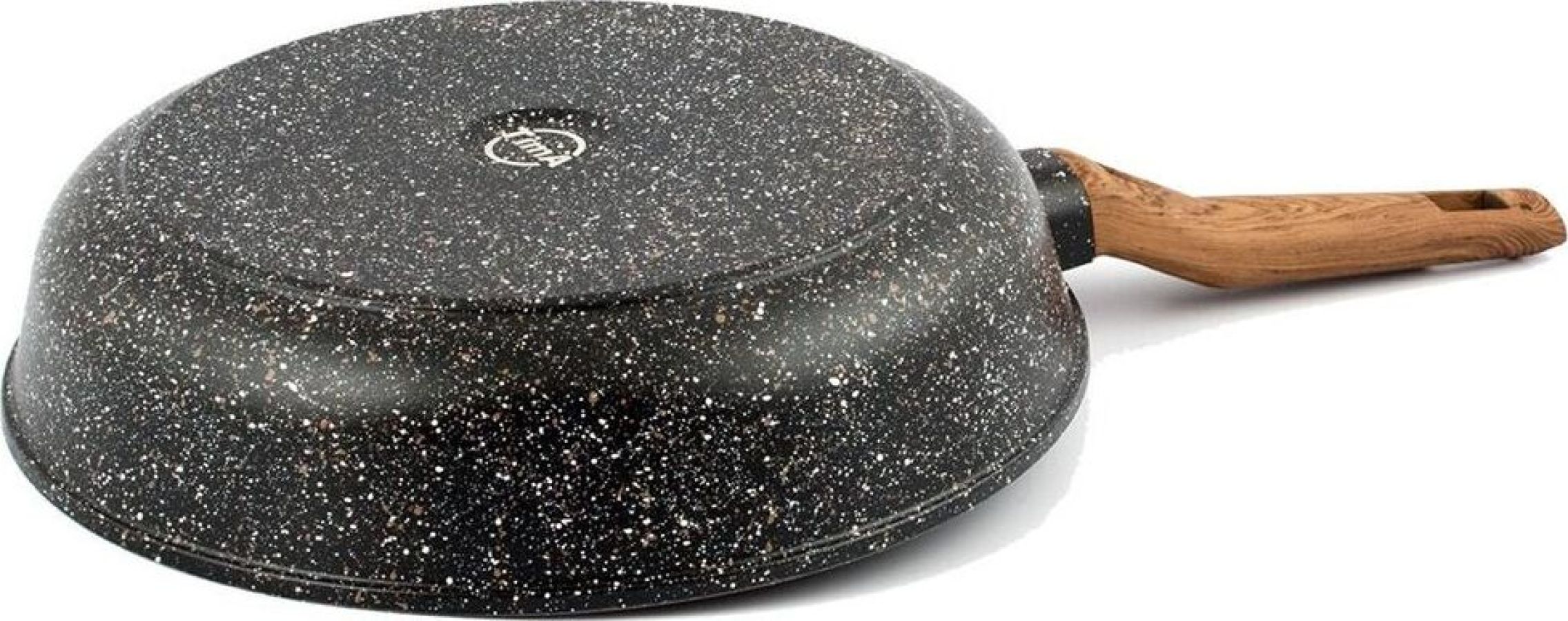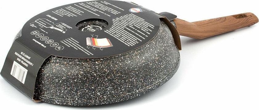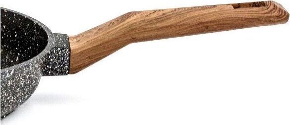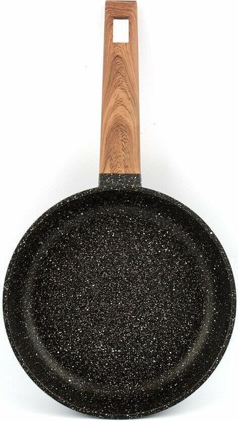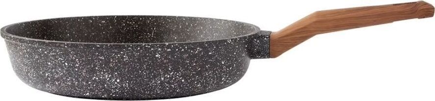 Сковорода изготовлена из литого алюминия обладает надёжным экологичным 5-и слойным каменным покрытием. Покрытие не боится использования металлических аксессуаров и считается экологически безопасным, т.к. не содержит PFOA. Ручка сковороды из материала soft touch бакелит, стилизована под дерево. Ручка словно прорезинена, приятная на ощупь, надёжно держится даже в мокрых руках, не выскользнет. Модель подходит для стеклокерамических, газовых и электрических плит. Подходит для использования в посудомоечной машине.
