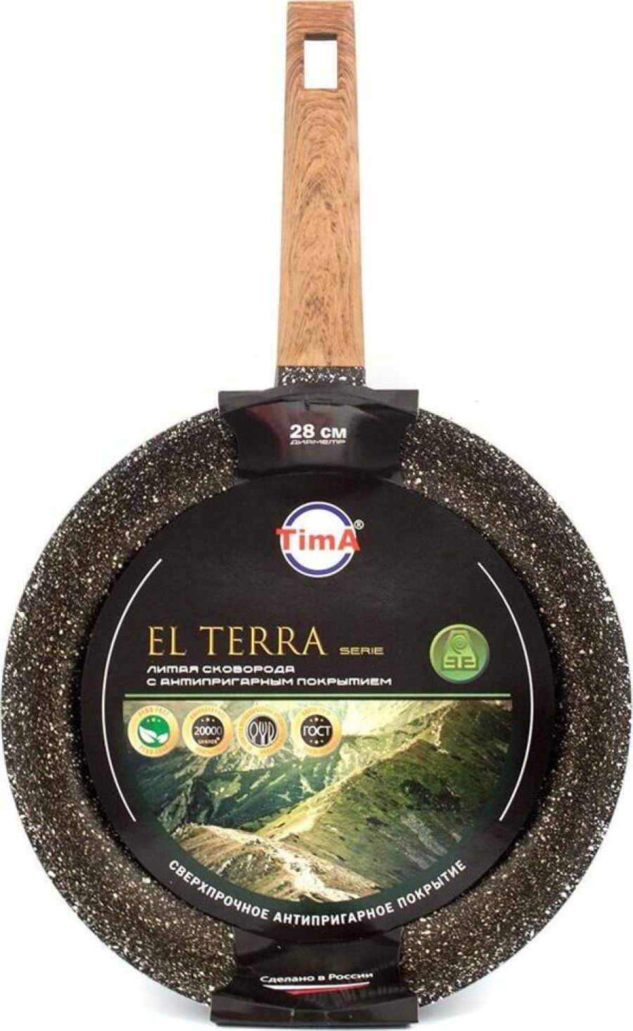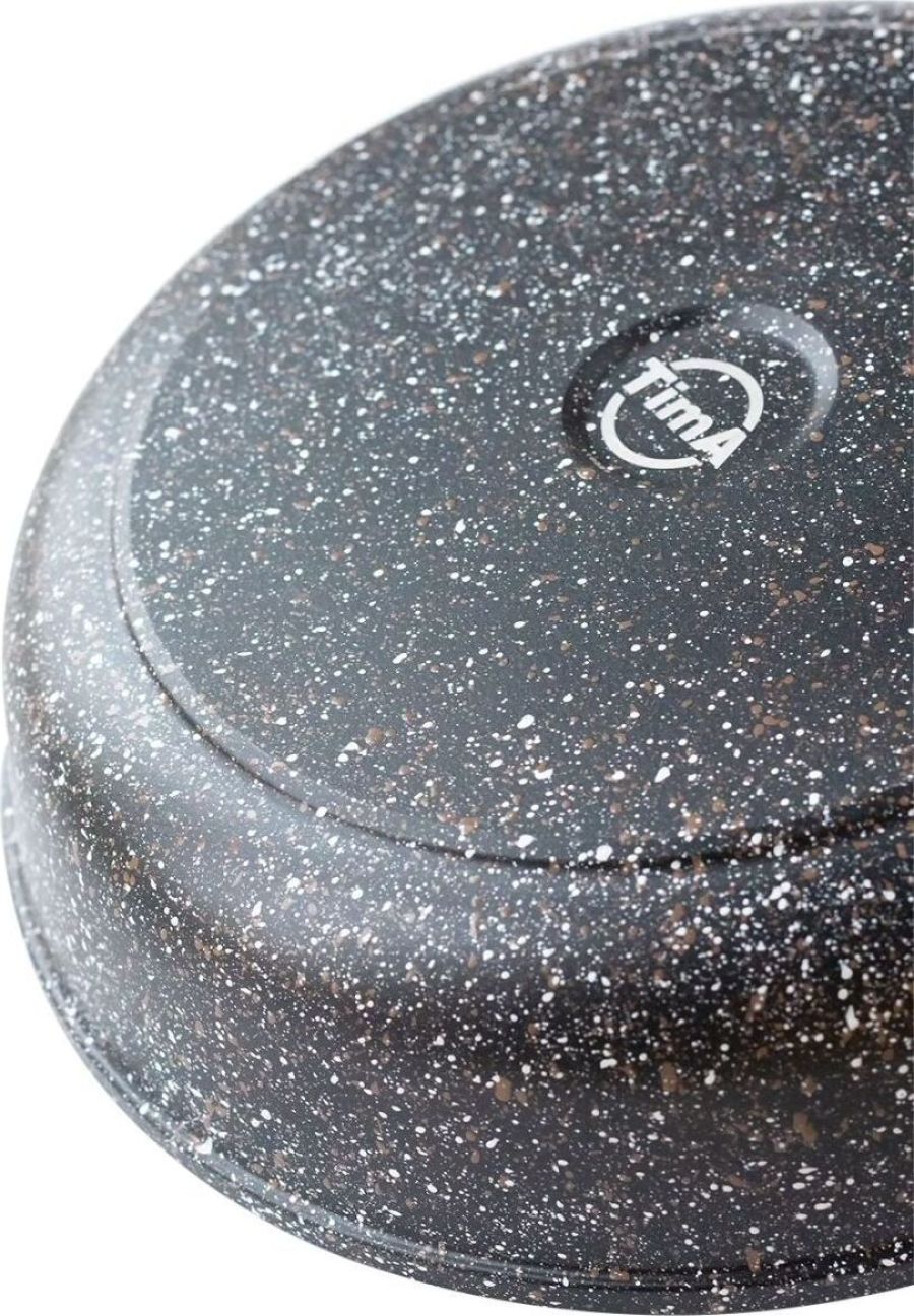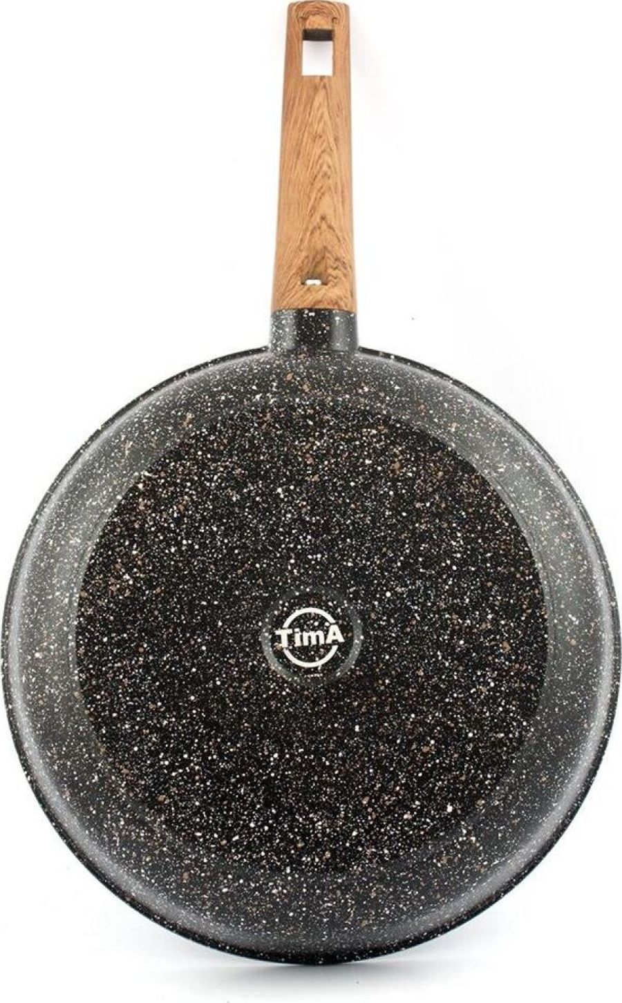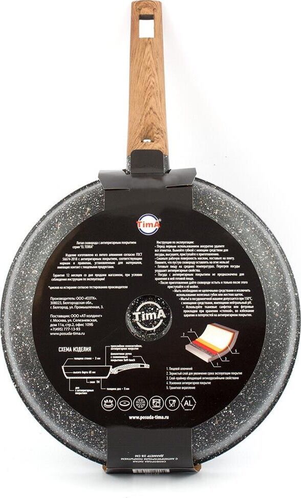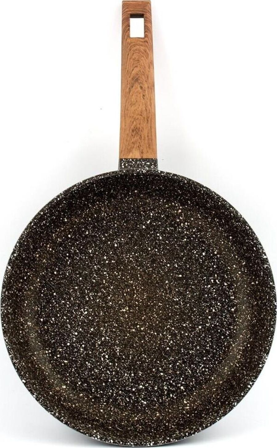 Сковорода изготовлена из литого алюминия обладает надёжным экологичным 5-и слойным каменным покрытием. Покрытие не боится использования металлических аксессуаров и считается экологически безопасным, т.к. не содержит PFOA. Ручка сковороды из материала soft touch бакелит, стилизована под дерево. Ручка словно прорезинена, приятная на ощупь, надёжно держится даже в мокрых руках, не выскользнет. Модель подходит для стеклокерамических, газовых и электрических плит. Подходит для использования в посудомоечной машине.