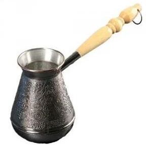 Турка изготовлена из меди, прекрасно подходит для приготовления настоящего кофе на плите. Внешняя поверхность имеет декоративное тиснение, что придает изделию оригинальный внешний вид. Внутренняя сторона покрыта пищевым оловом. Изделие оснащено небольшим носиком и удобной не нагревающейся деревянной ручкой с петелькой для подвешивания. Надежное крепление ручки гарантирует безопасное использование.