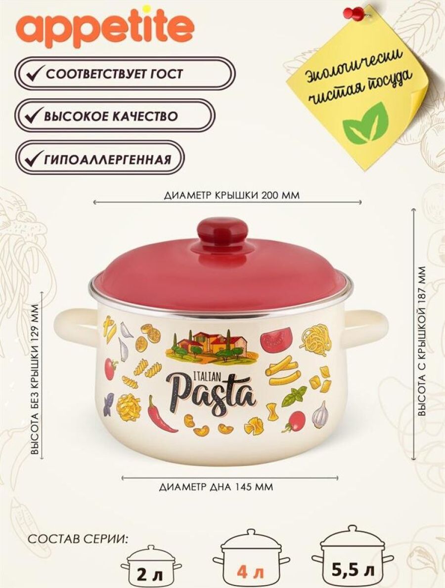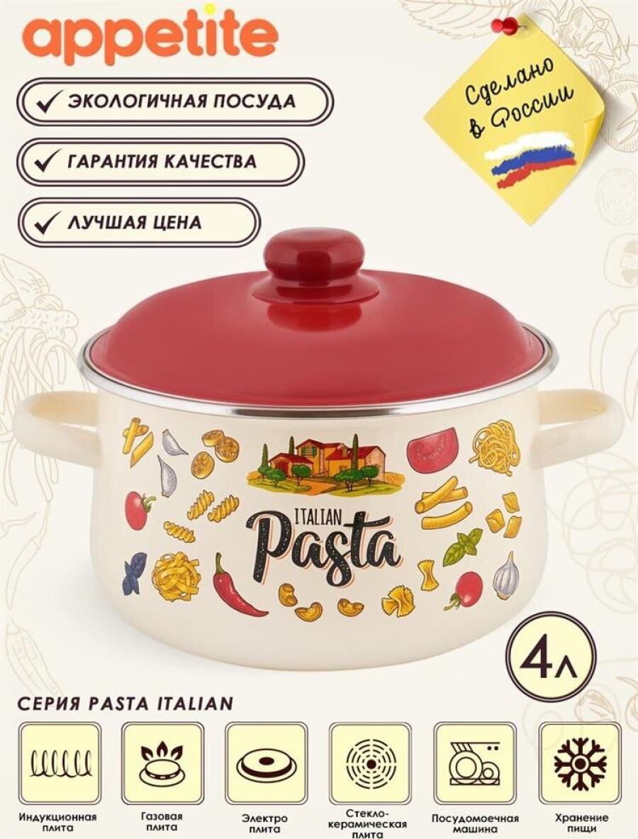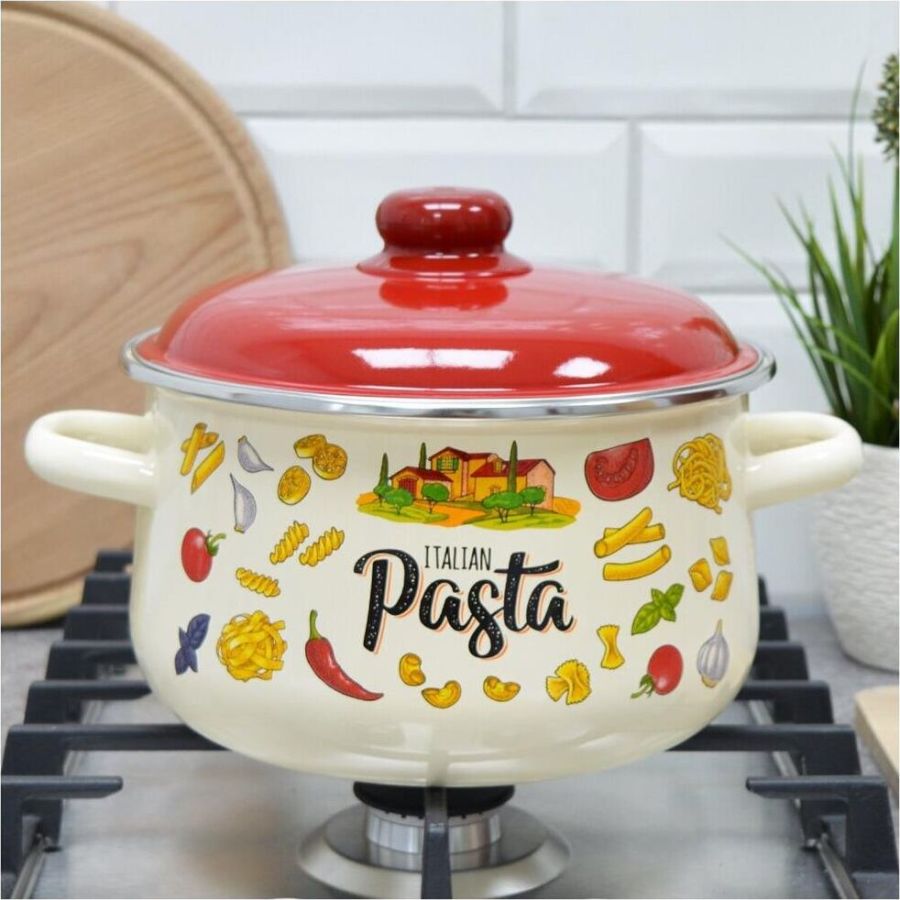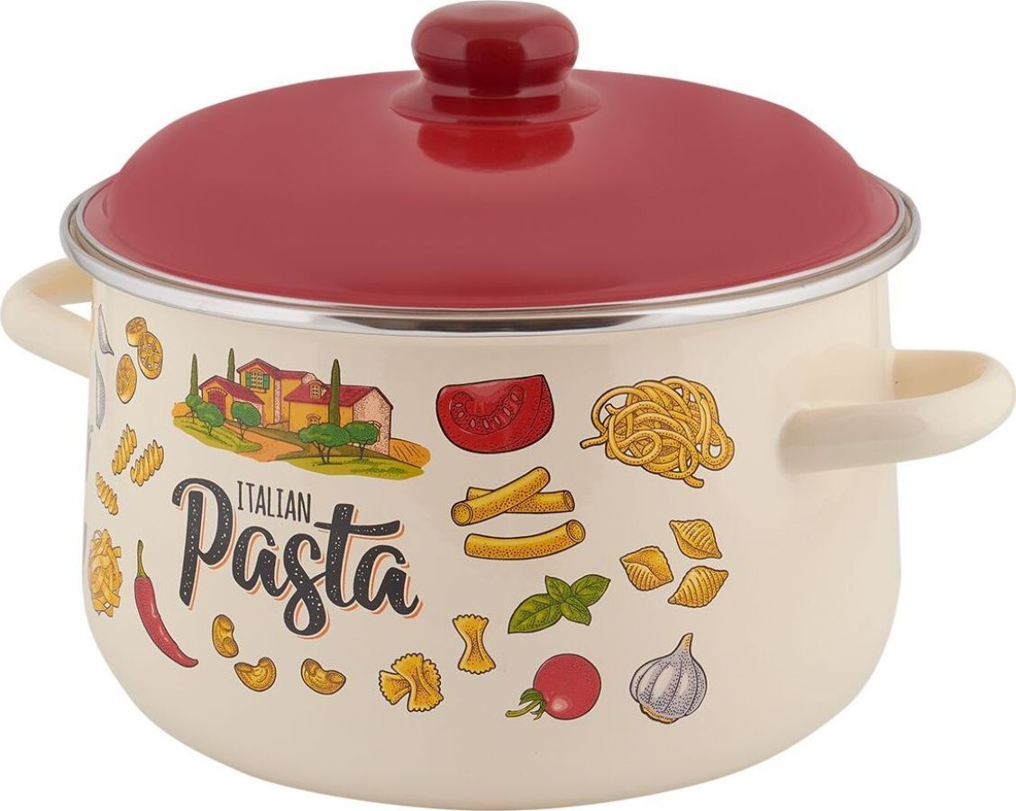 Кастрюля эмалированная серия "Pasta ITALIAN" Наружное и внутреннее покрытие - ЭМАЛЬ, стальная эмалированная крышка. Можно использовать в посудомоечной машине. Подходит для всех типов плит, в том числе индукционных. Объем, л./размер, см: 4.0 л Материал: эмалированная сталь Толщина дна: 0.8 Источник тепла: Все виды плит Тип упаковки: коллективная Крышка: эмалированная Внутреннее покрытие: эмаль Внешнее покрытие: эмаль