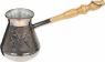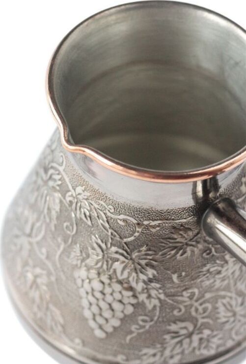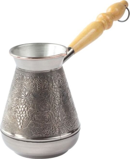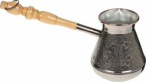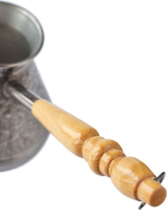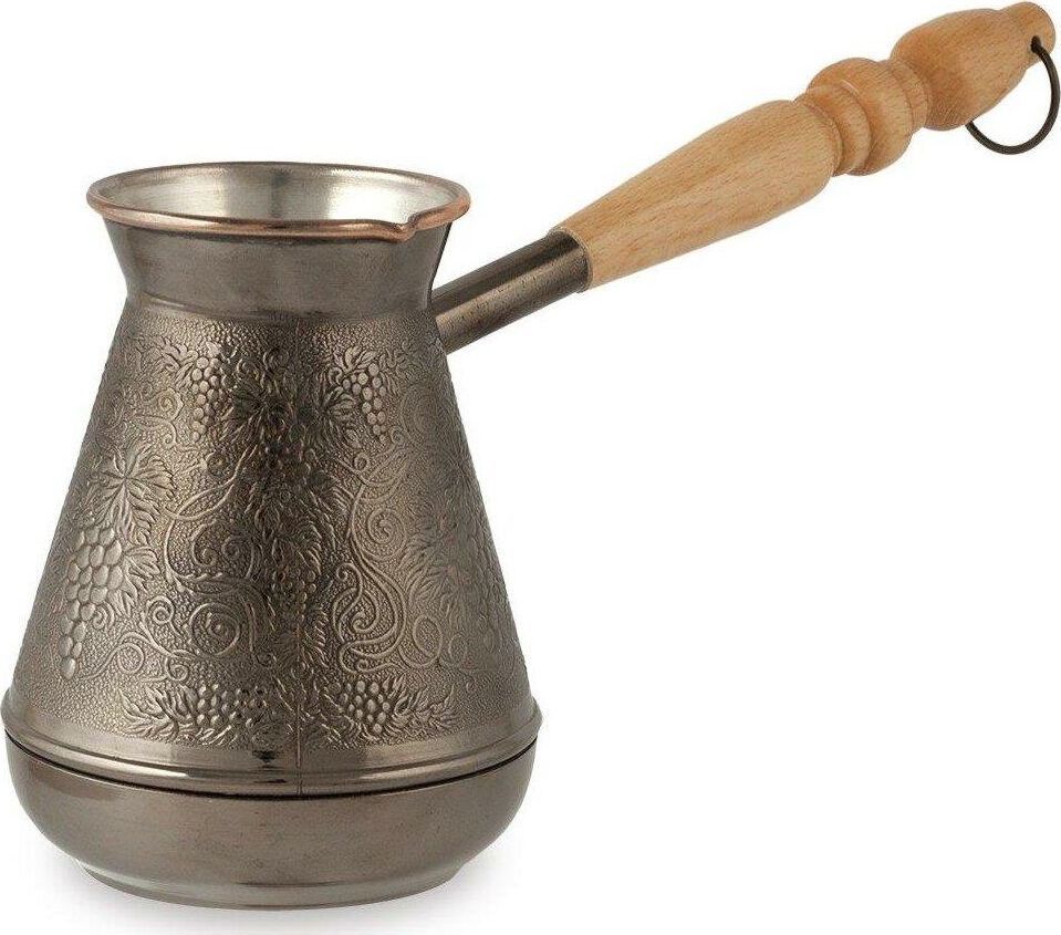 Турка изготовлена из меди, прекрасно подходит для приготовления настоящего кофе на плите. Внешняя поверхность имеет декоративное тиснение, что придает изделию оригинальный внешний вид. Внутренняя сторона покрыта пищевым оловом. Изделие оснащено небольшим носиком и удобной не нагревающейся деревянной ручкой с петелькой для подвешивания. Надежное крепление ручки гарантирует безопасное использование.