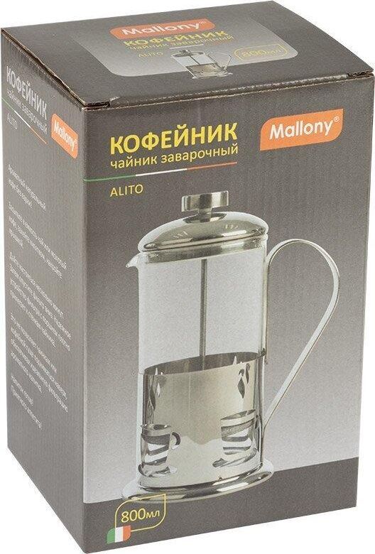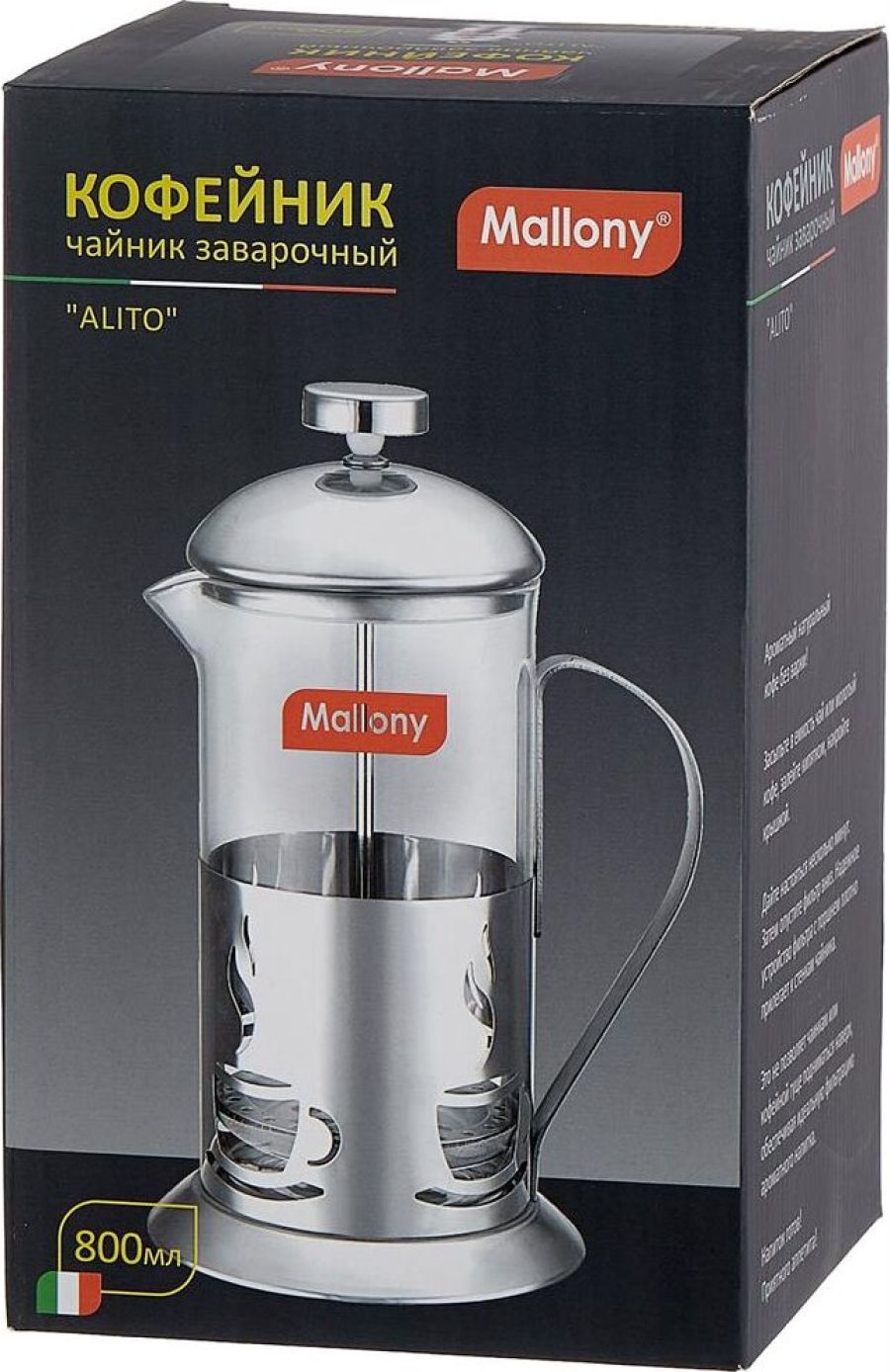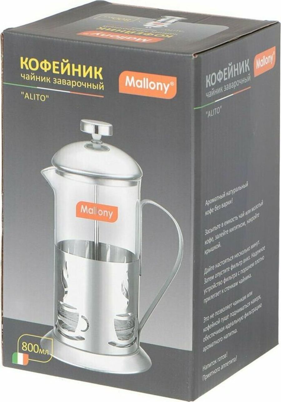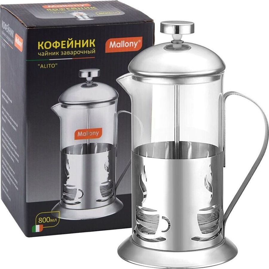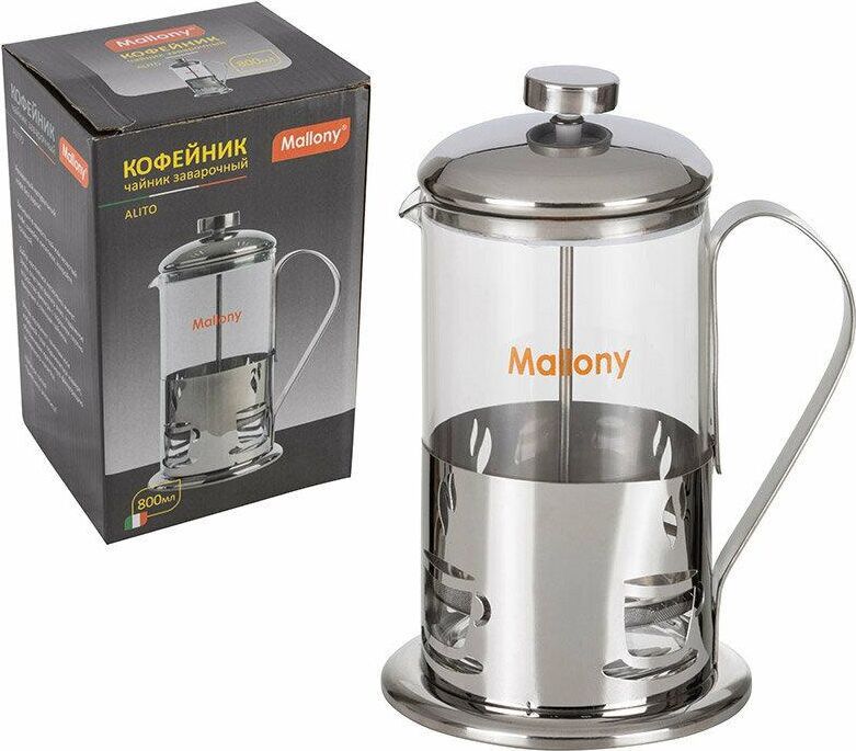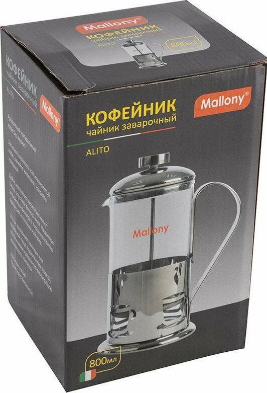 Кофейник/чайник (кофе-пресс) ALITO Литраж - 800 мл материалы: боросиликатное стекло, нерж сталь. Колба изготовлена из боросиликатного стекла, корпус из нерж. стали 201, фильтр из нерж. сталь 304, стрежень 304 сталь. Упаковка: цветная коробка. Толщина стекла - 2,2 мм Толщина нерж стали - 0,4 мм В кофе-прессе можно приготовить не только чай или кофе, но и заваривать травяные настои, какао. Пресс для кофе/чая позволяет использовать любой помол зерен, листовой, гранулированный чай или чай в пакетиках. Можно мыть в посудомоечной машине только стеклянную колбу. Части из нерж стали мыть в посудомоечной машине не рекомендуется (корпус, фильтр, крышку).