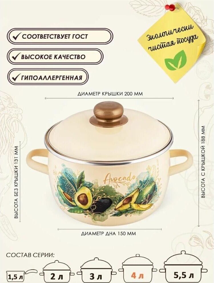 Кастрюля эмалированная 4,0л сферическая, толщина дна: 0,8мм толщина стенок: 0,8мм. Тип упаковки: коллективная Крышка: эмалированная Внутреннее покрытие: эмаль Внешнее покрытие: эмаль Подходит для всех типов плит, включая индукционные. Можно мыть в посудомоечной машине.