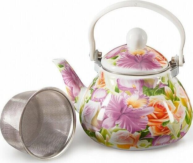 EM-131X1/8 Чайник эмалированный с фильтром из нерж.стали "Орхидея" 1,3л Параметры Объем 1,3 л Описание Чайник эмалированный с фильтром из нержавеющей стали Трехслойное внутреннее и внешнее эмалевое покрытие, устойчивое к воздействию пищевых кислот Съемный фильтр из нержавеющей стали Зачерненное дно с повышенной термоотдачей Эргономичная подвижная ручка Может быть использован на всех типах кухонных плит: электрических, газовых, керамических, индукционных Подходит для мытья в посудомоечной машине