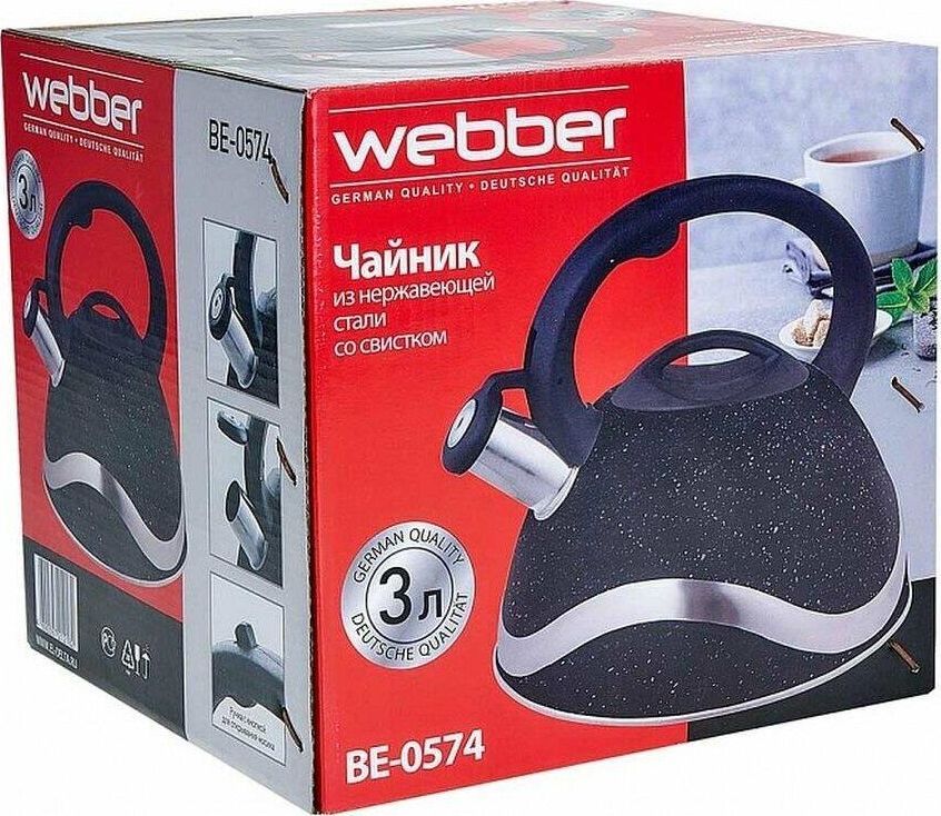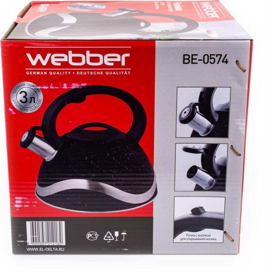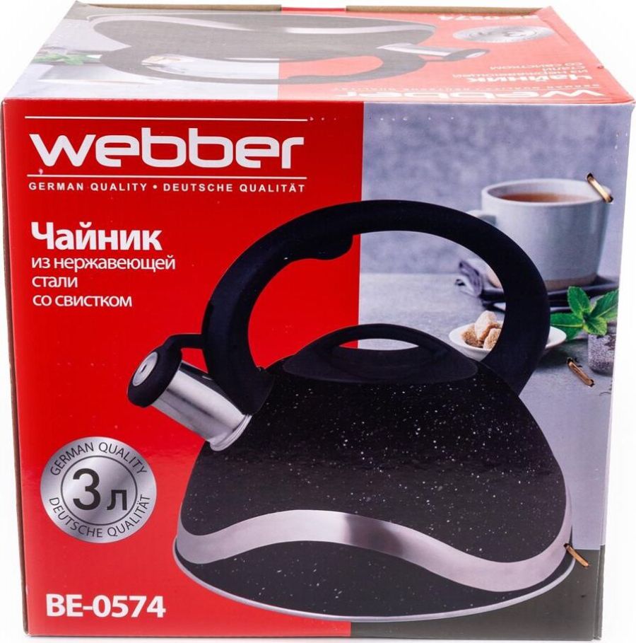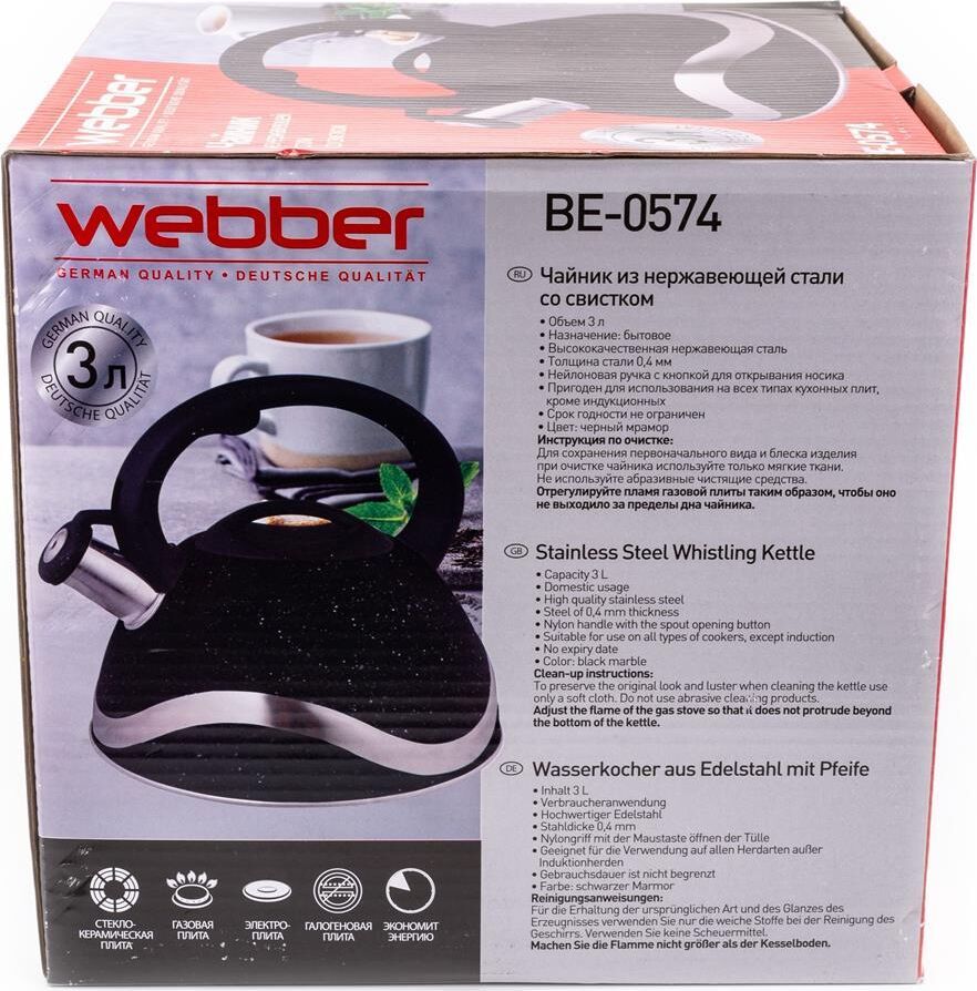 WEBBER BE-0574 Чайник из нерж.стали 3л, капсулированное дно Параметры Объем 3 л Толщина стали 0,4 мм Описание Чайник из нержавеющей стали со свистком Высококачественная нержавеющая сталь c цветным покрытием Цвет: черный мрамор Капсулированное дно Нейлоновая ручка с кнопкой открывания носика Цвет ручки и крышки: черный Пригоден для использования на всех типах кухонных плит, кроме индукционных