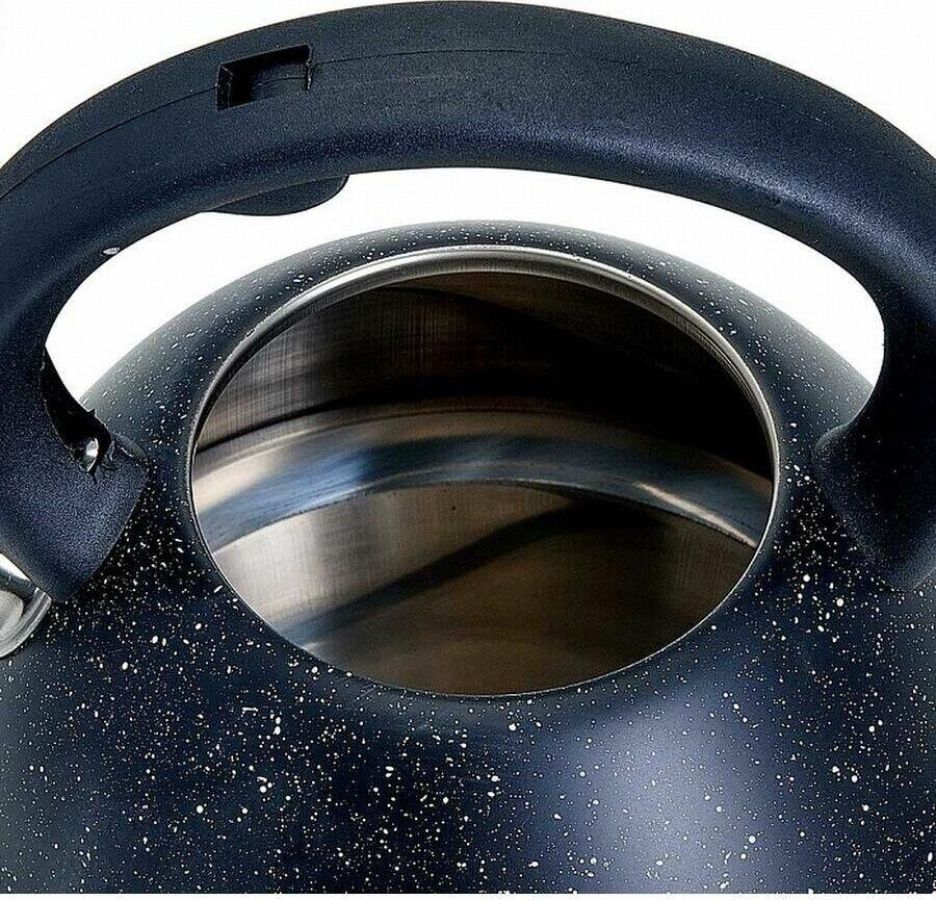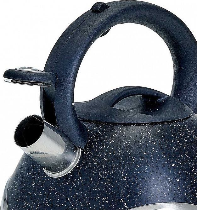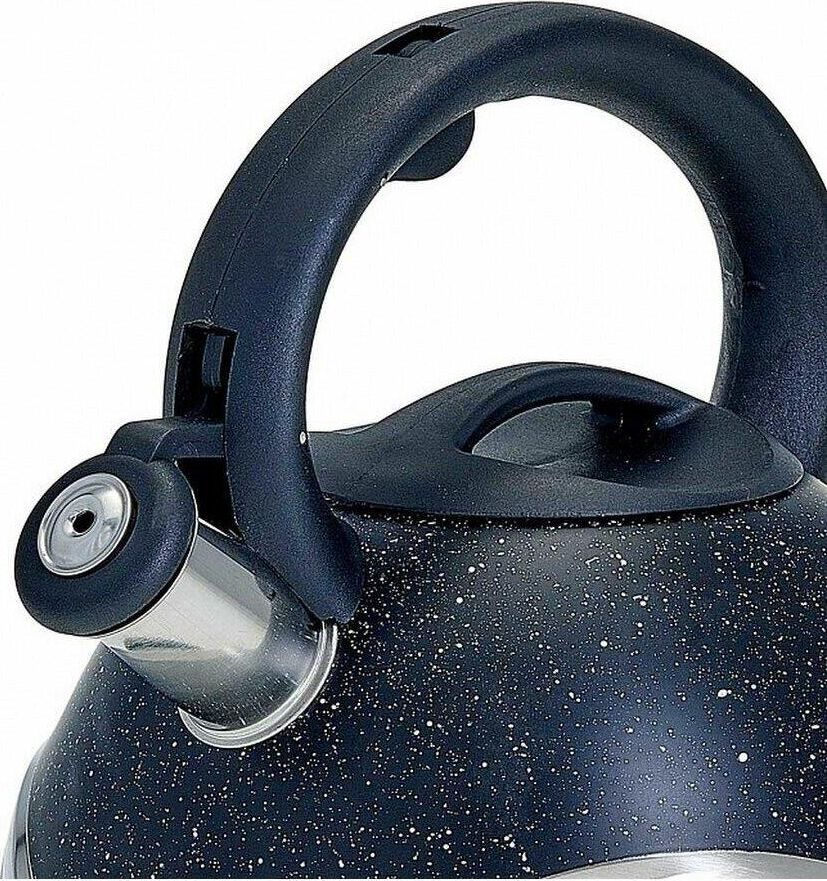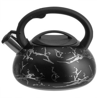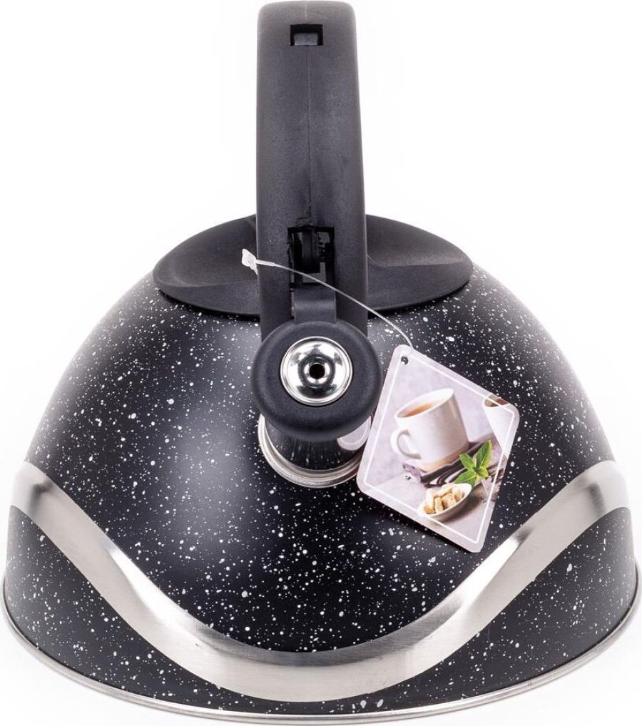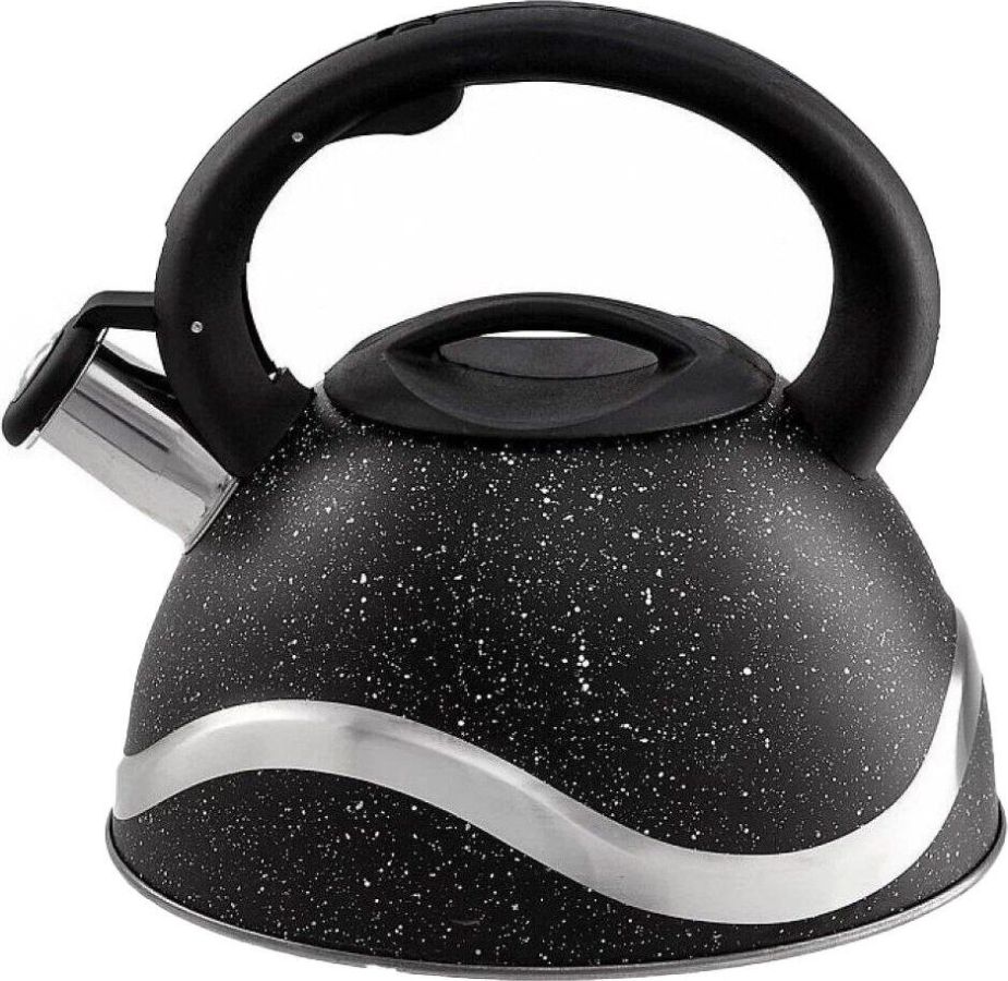 WEBBER BE-0574 Чайник из нерж.стали 3л, капсулированное дно Параметры Объем 3 л Толщина стали 0,4 мм Описание Чайник из нержавеющей стали со свистком Высококачественная нержавеющая сталь c цветным покрытием Цвет: черный мрамор Капсулированное дно Нейлоновая ручка с кнопкой открывания носика Цвет ручки и крышки: черный Пригоден для использования на всех типах кухонных плит, кроме индукционных