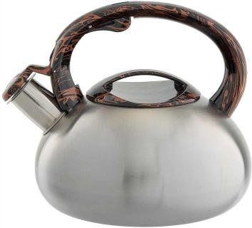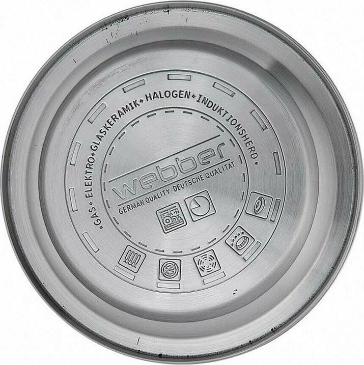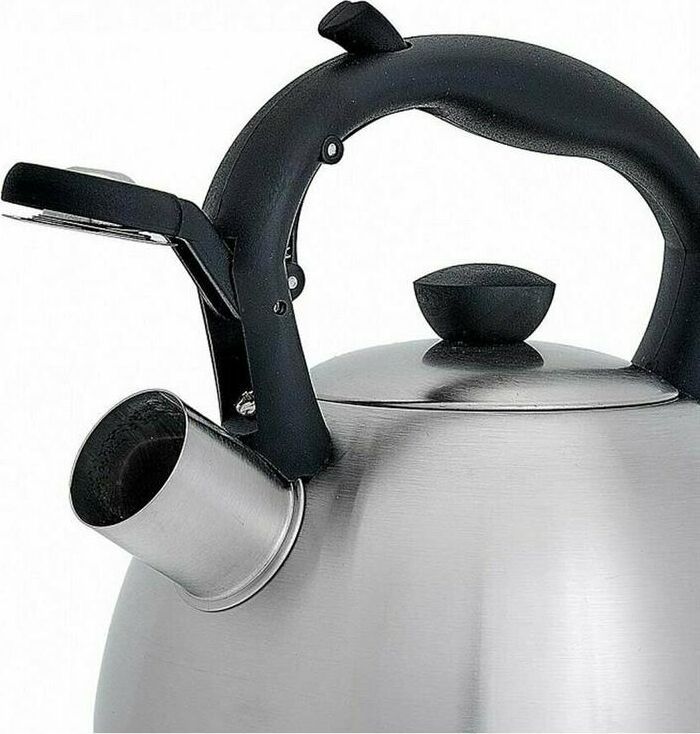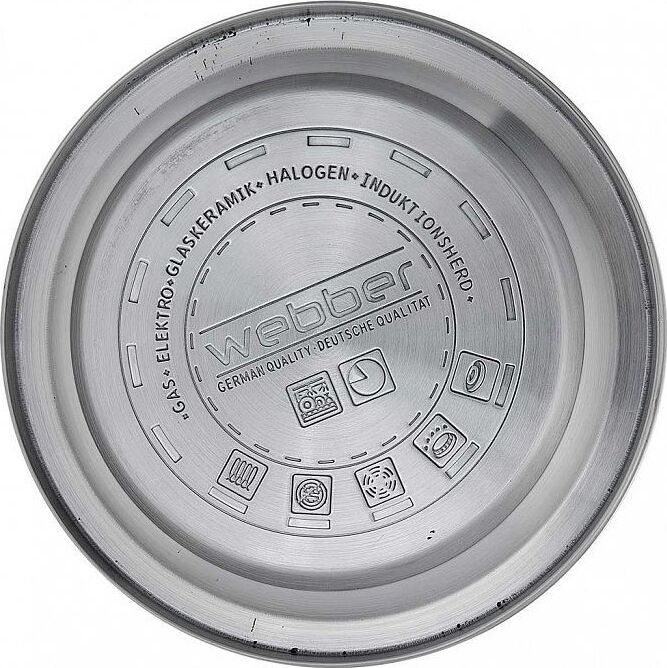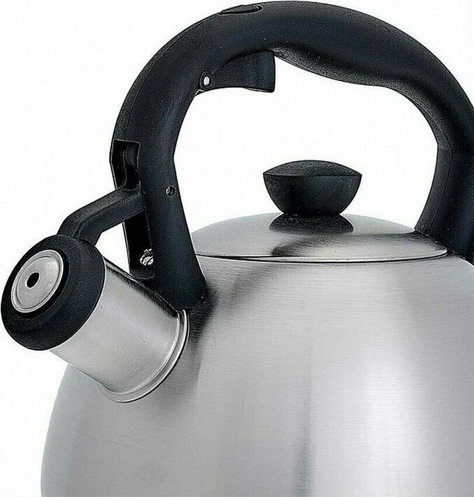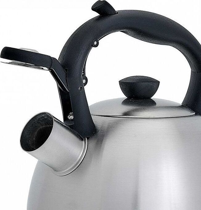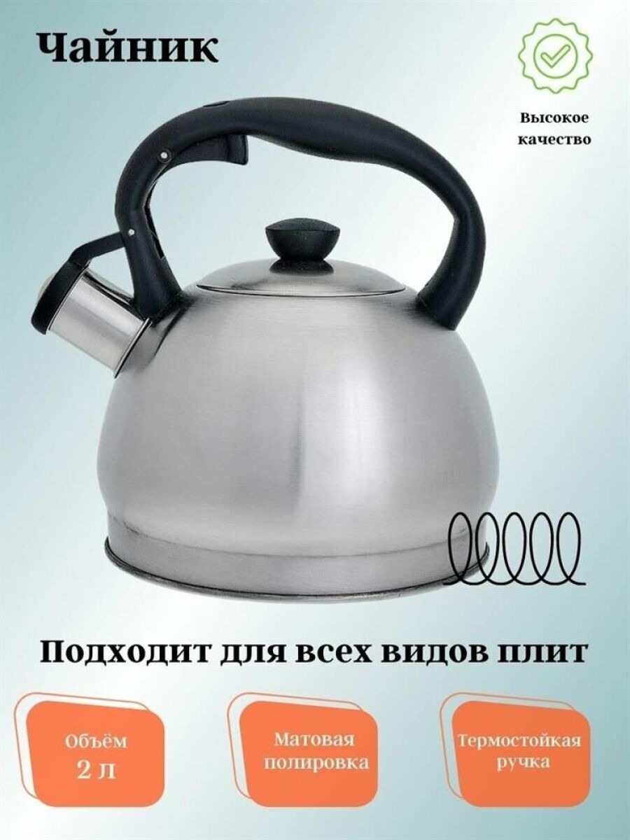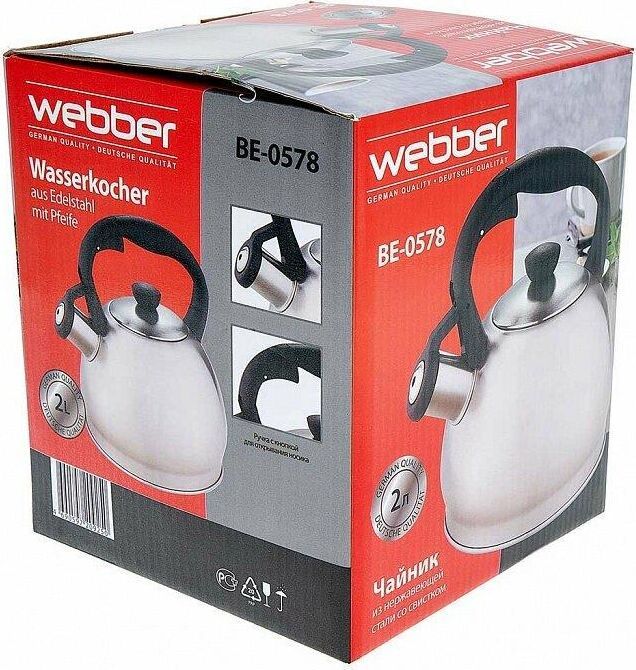 WEBBER BE-0578 Объем 2л. Чайник из нержавеющей стали со свистком. Высококачественная нержавеющая сталь. Матовая полировка. Индукционное дно. Термостойкая пластиковая ручка с кнопкой для открывания носика. Цвет ручки: черный. Пригоден для использования на всех типах кухонных плит, включая индукционные.