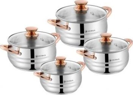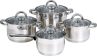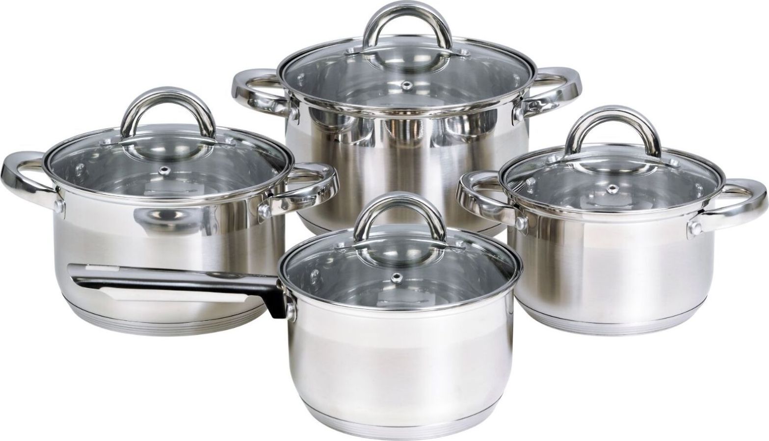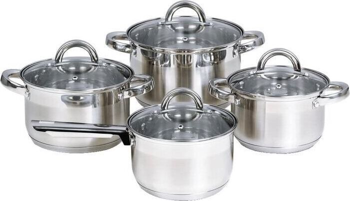 Набор из 8 предметов; Кастрюля с жаропрочной стеклянной крышкой 2.1л; Кастрюля с жаропрочной стеклянной крышкой 2.9л; Кастрюля с жаропрочной стеклянной крышкой 3.9л; Сотейник с жаропрочной стеклянной крышкой 2.1л; Высококачественная нержавеющая сталь; Капсульное дно; Удобные клепаные ручки; Жаропрочная стеклянная крышка с паровыпуском; Подходит для всех видов плит; Подходит для мытья в посудомоечной машине.