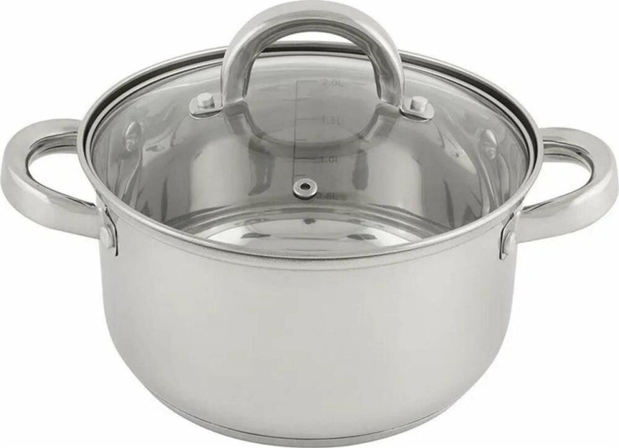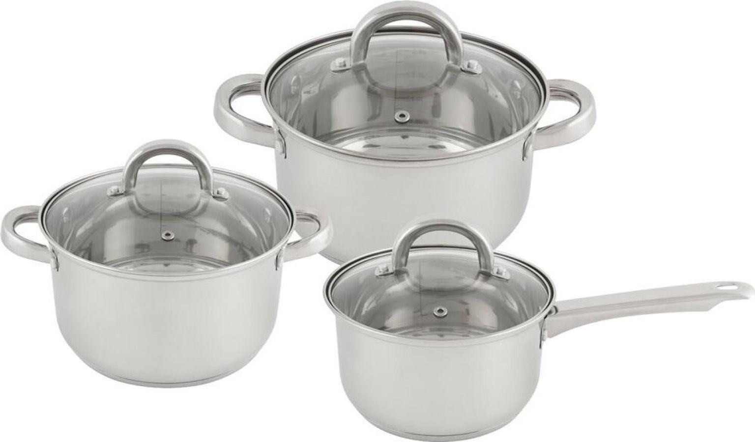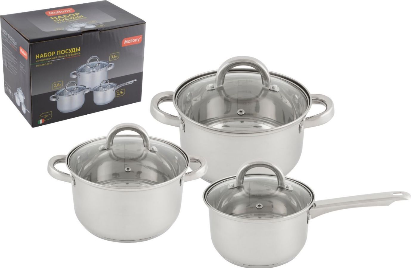 Набор посуды из нерж стали из 6 предметов, MEDIANO-SET-6 (ковш1,9л/кастрюли - 2,6 и 3,6 л), тм Mallony Высота стенок без крышек - ковш 9,5 см, кастрюля 2,6 л - 10,5 см, кастрюля 3,6 л - 11,5 см. Ковш с крышкой - 16*9,5 см размер, литраж 1,9 л + Кастрюля с крышкой - 18*10,5 см размер, литраж 2,6 л + Кастрюля с крышкой - 20*11,5 см размер, литраж 3,6 л. 201 нержавеющая сталь, толщина - 0,35 мм, дно 3-слойное капсулированное - 201 нерж сталь+ 1мм алюминия + 430 сталь, подходит для индукции, снаружи и внутри - зеркальная полировка, отметки литража; полые ручки из нерж стали, С-тип крышка из жаропрочного стекла с отверстием для выпуска пара. Не рекомендуется мыть в посудомоечной машине Упаковка - цветная коробка.
