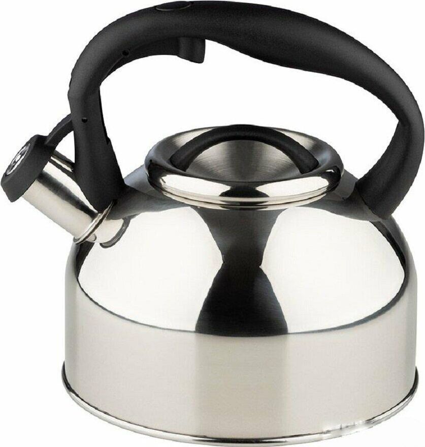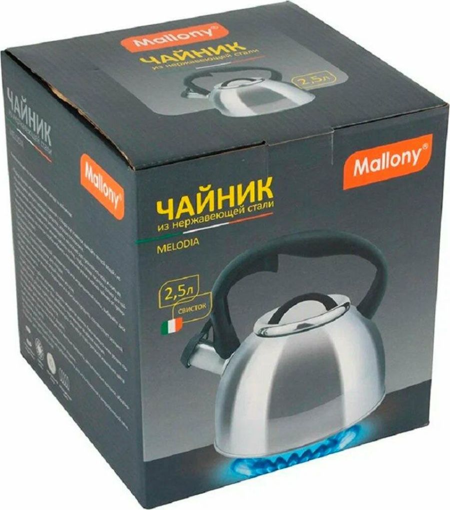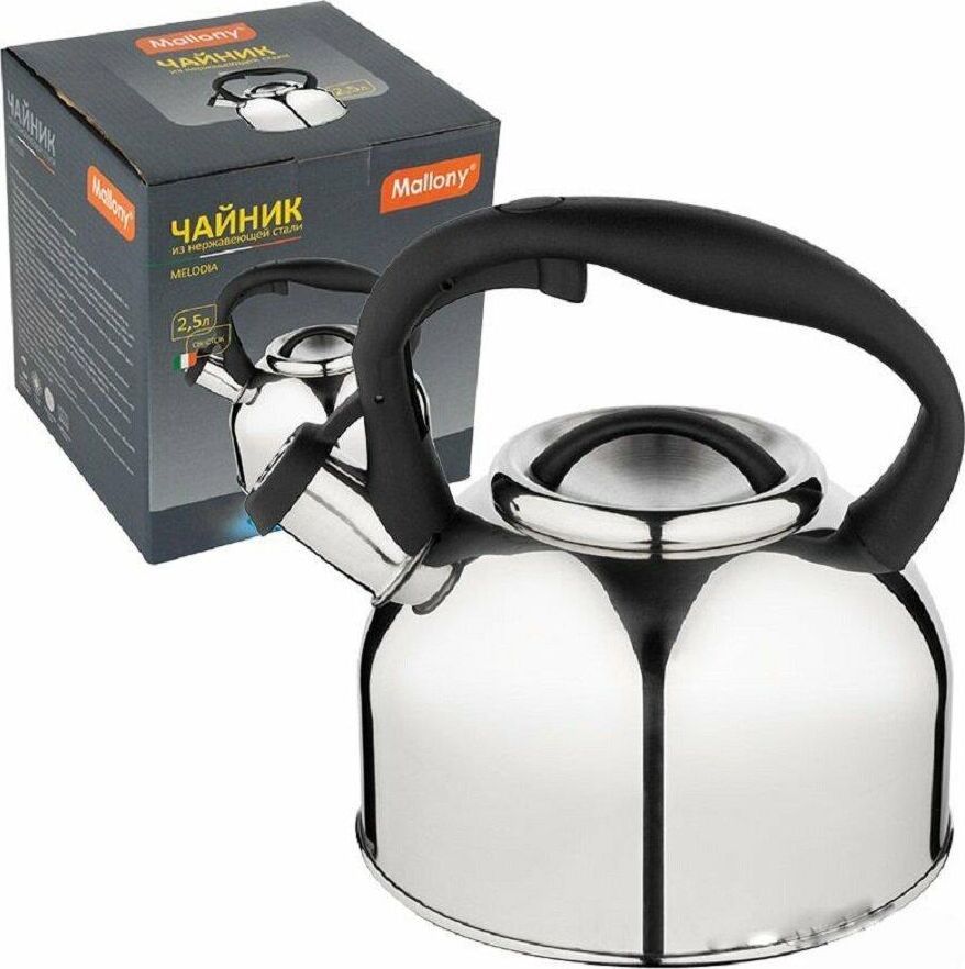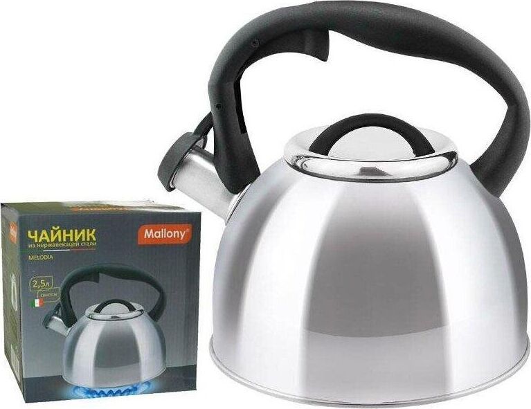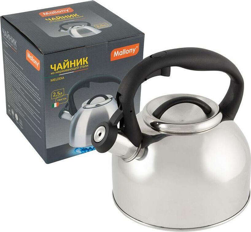 Чайник из нерж стали со свистком серия Melodia, 2,5 литра, зеркальная полировка корпуса, Mallony Объем 2,5 литра, Толщина стали - 0,3 мм. Зеркальная полировка корпуса. Материалы: нерж. сталь; нейлон Однослойное дно; внутри - матовый, ручка - нейлон. Не рекомендуется мыть в посудомоечной машине. Упаковка - цветная коробка. Чайник серии Melodia выполнен из высококачественной нержавеющей стали, внутри матовый. Носик чайника оснащен насадкой-свистком, что позволит контролировать процесс подогрева или кипячения воды. Чайник снабжен стальной крышкой и эргономичной нейлоновой ручкой. Подходит для всех видов плит.