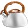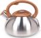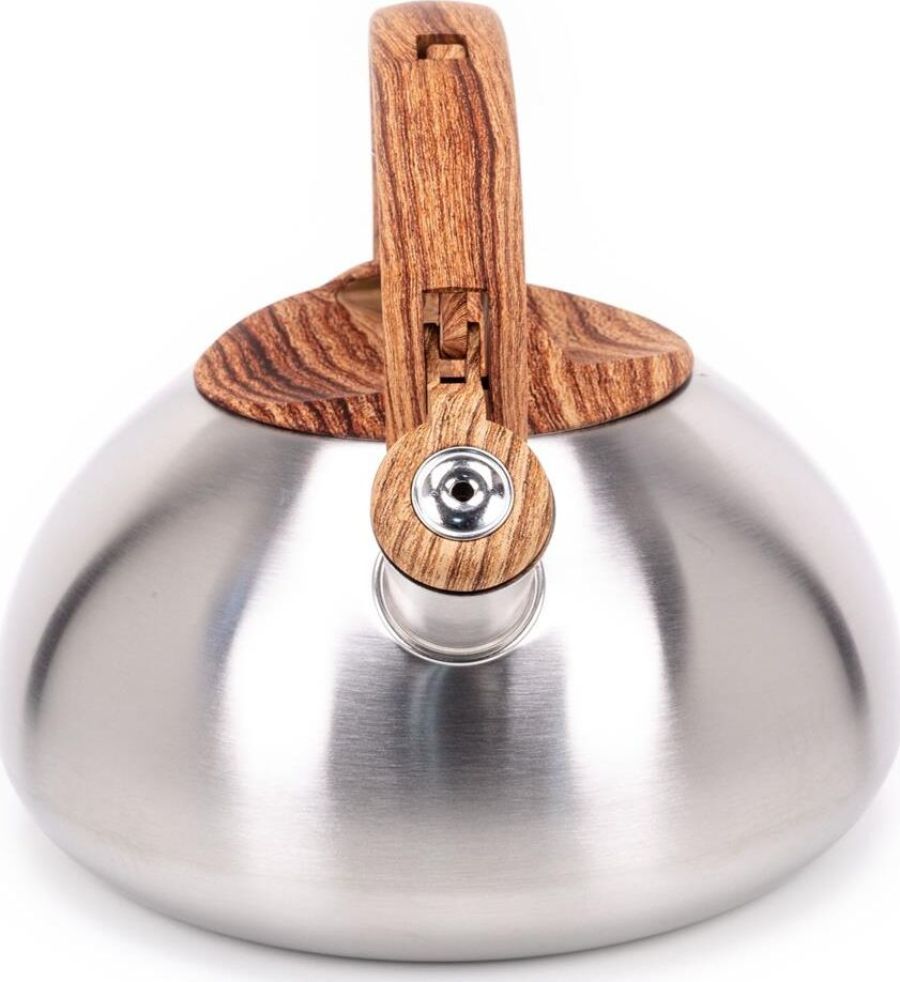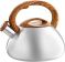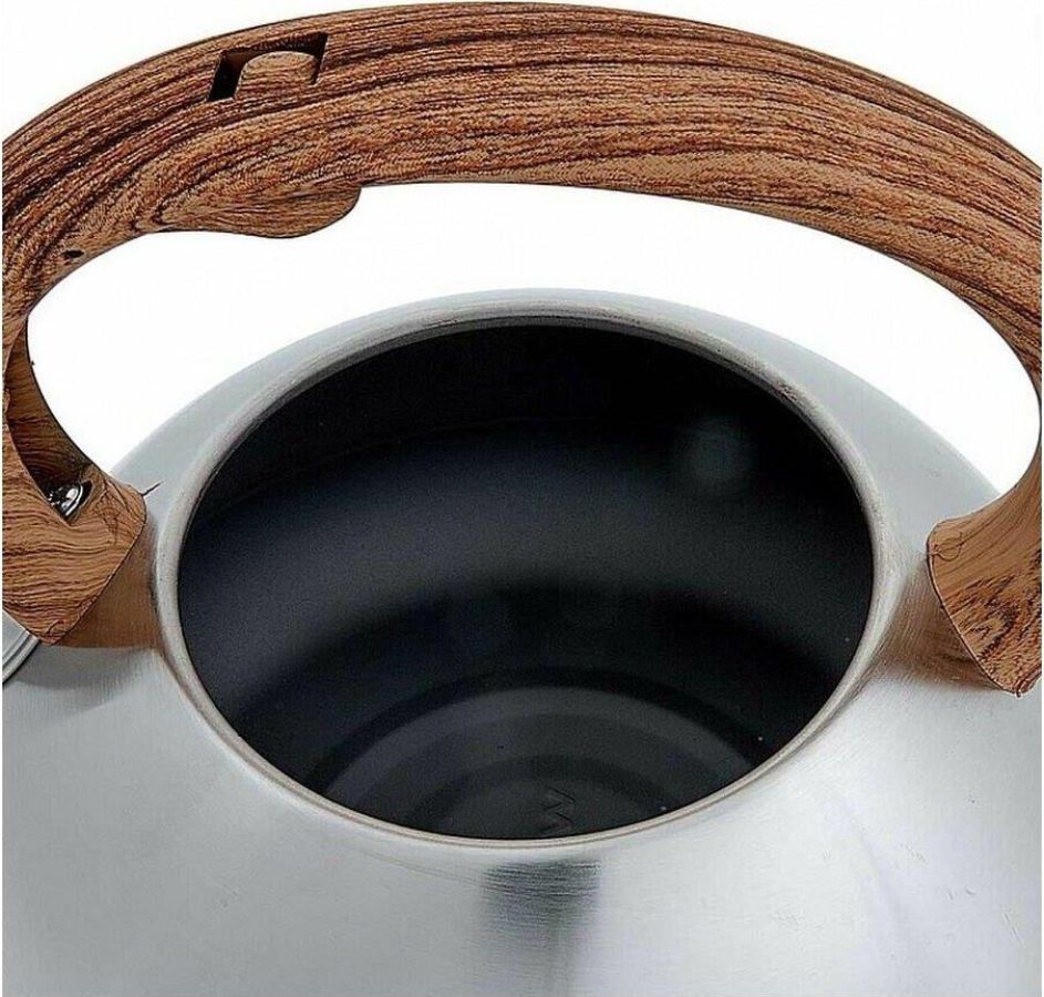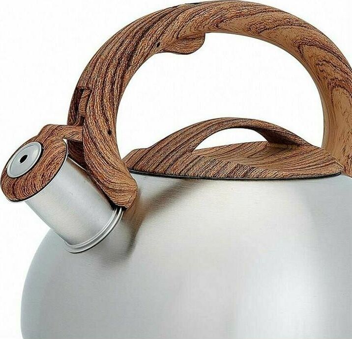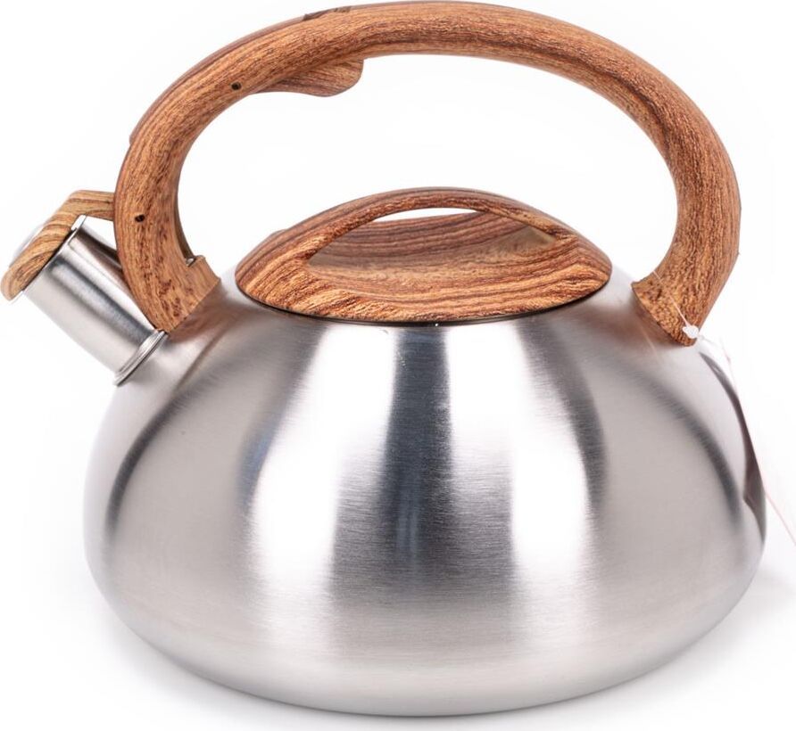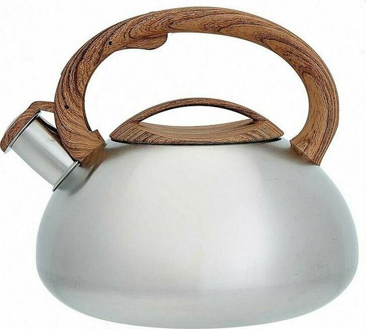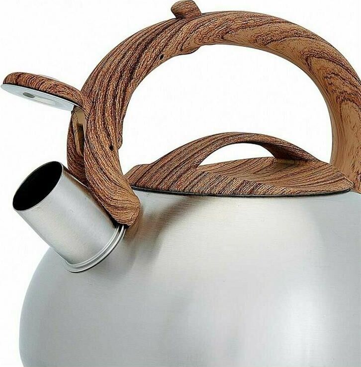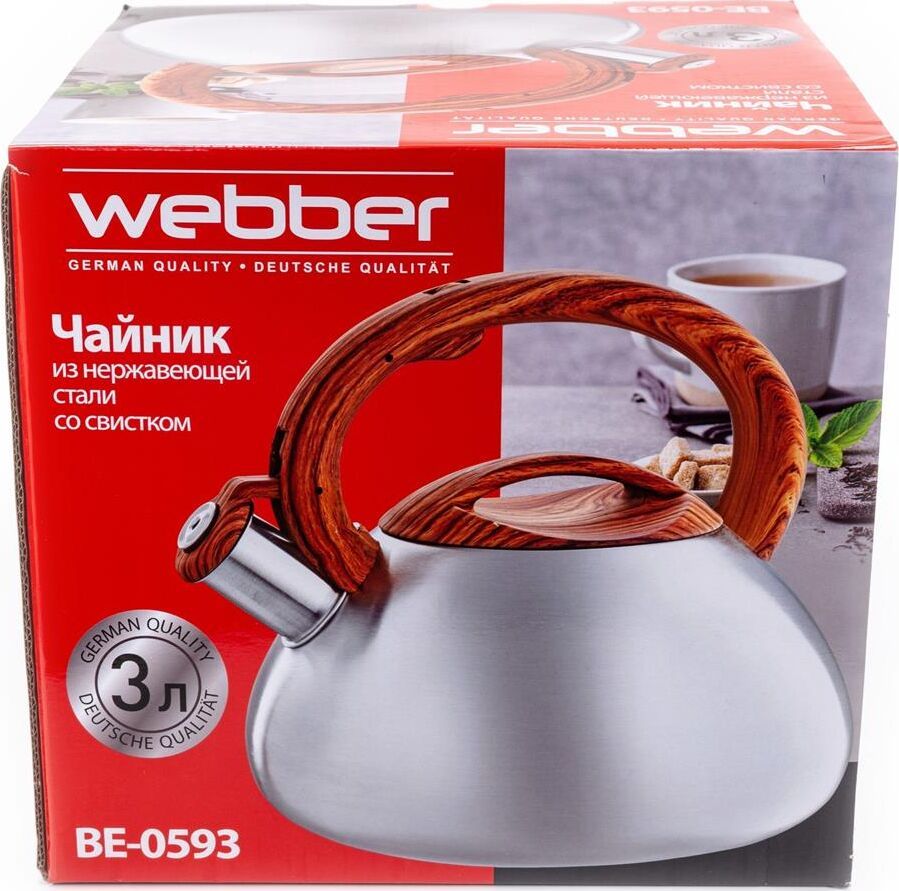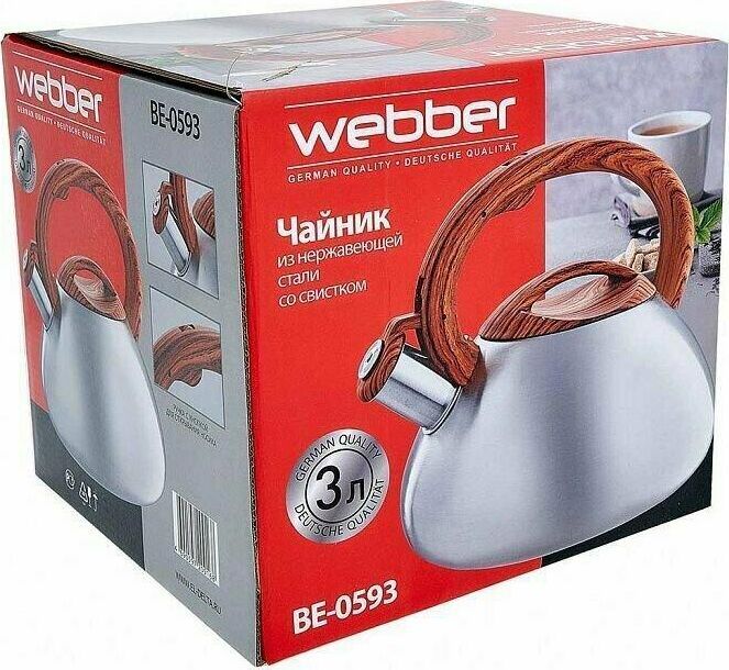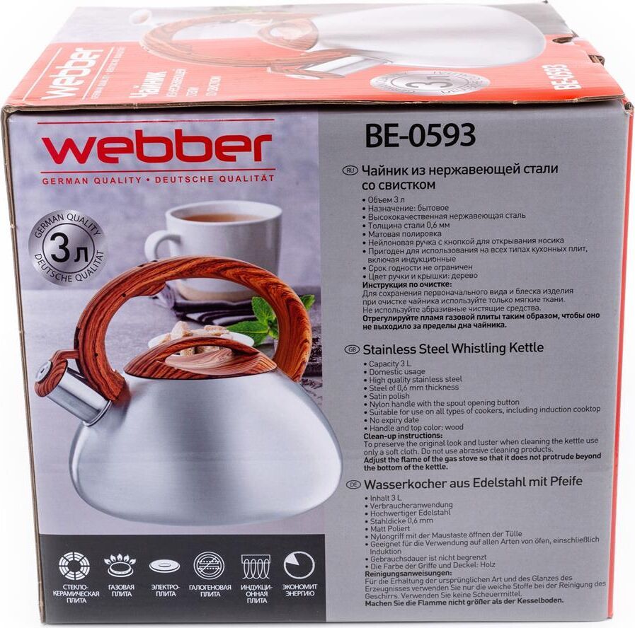 WEBBER BE-0593 со свистком 3л, сатин (12) Параметры Объем 3 л Толщина стали 0,6 мм Описание Чайник из нержавеющей стали со свистком Высококачественная нержавеющая сталь Матовая сатиновая полировка Индукционное дно Нейлоновая ручка с кнопкой открывания носика Цвет ручки и крышки: дерево Пригоден для использования на всех типах кухонных плит, включая индукционные