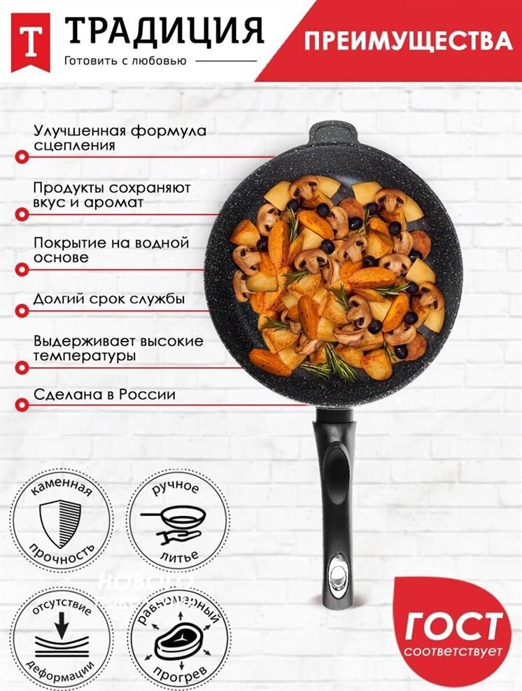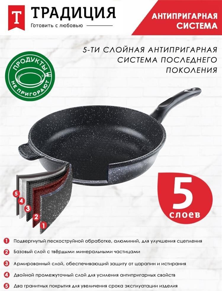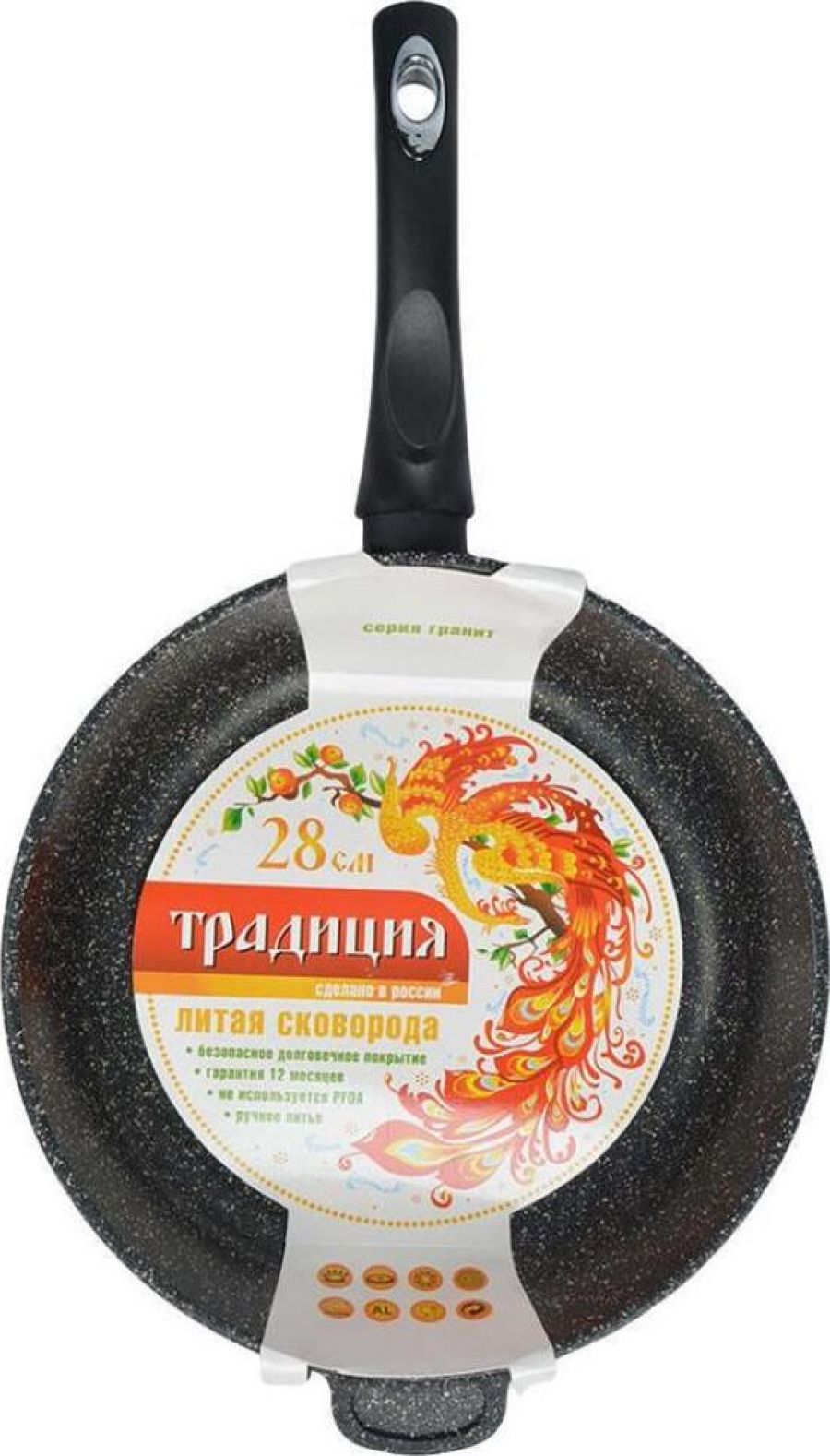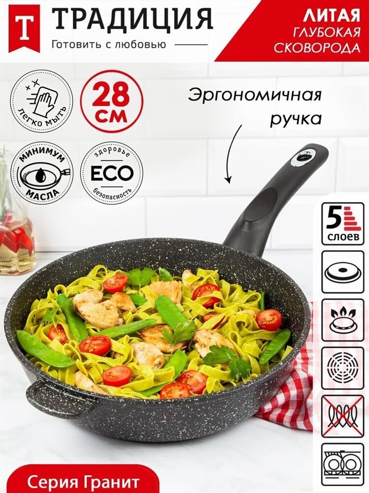 Объем, л./размер, см: 28 см Материал: литой алюминий Коллекция/серия: Гранит Торговая марка: Традиция Толщина дна: 6 Толщина стенок: 4.2 Источник тепла: Все виды плит, кроме индукционной Тип упаковки: цветной рукав Внутреннее покрытие: антипригарное покрытие Pfluon Внешнее покрытие: антипригарное покрытие Pfluon