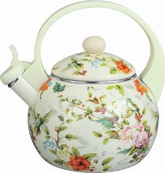 Эмалированный чайник со свистком Объем: 2,5л Носик со свистком и защитным кольцом Удобная ручка, не нагревается 3-х слойное внутреннее и внешнее эмалированое покрытие Неповсторимость дизайна Пригодность для посудомоечной машины Неповторимость узора