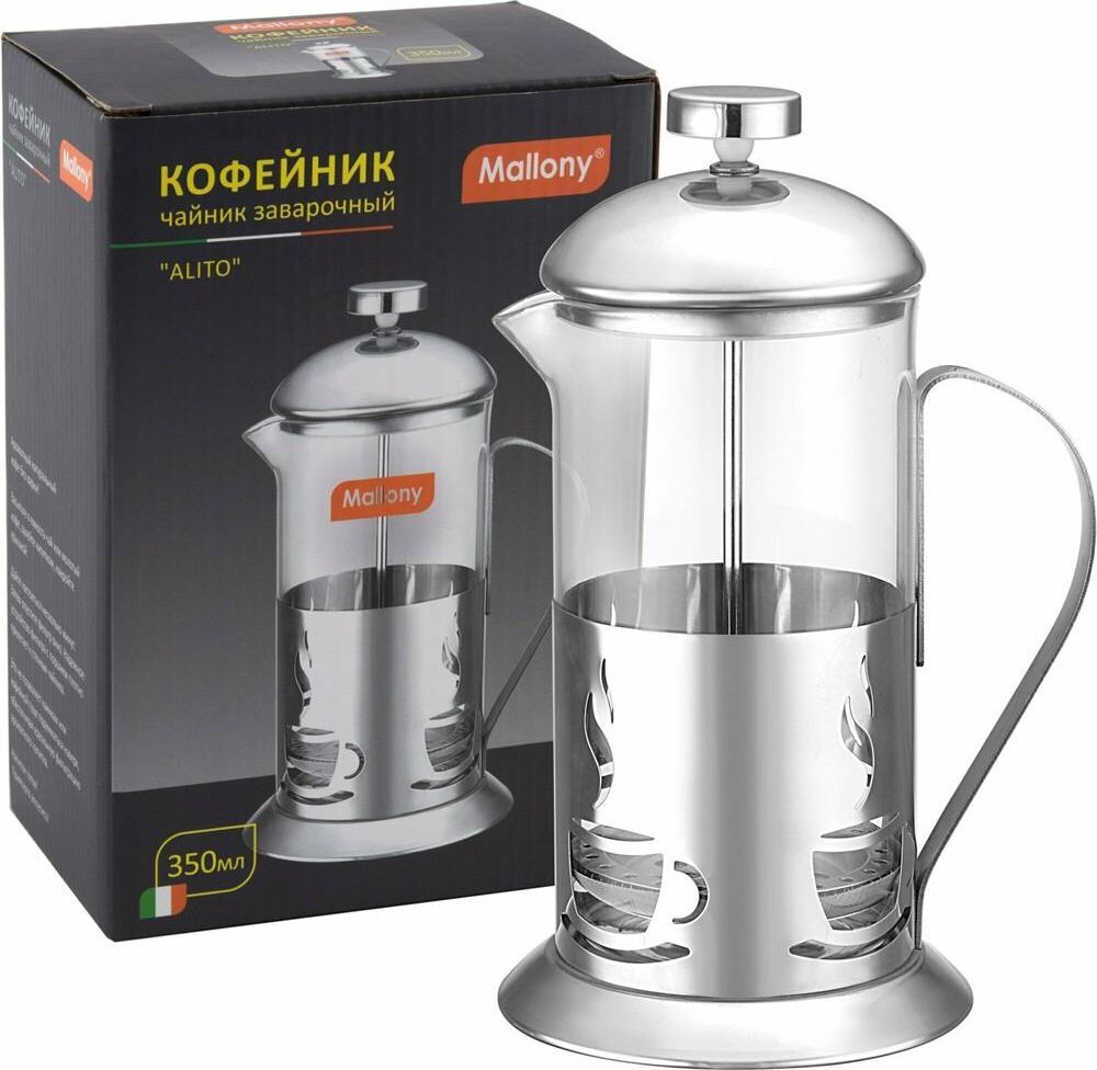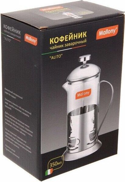 Кофейник/чайник (кофе-пресс) ALITO Литраж - 350 мл материалы: боросиликатное стекло, нерж сталь. Колба изготовлена из боросиликатного стекла, корпус из нерж. стали 201, фильтр из нерж. сталь 304. Упаковка: цветная коробка В кофе-прессе можно приготовить не только чай или кофе, но и заваривать травяные настои, какао. Пресс для кофе/чая позволяет использовать любой помол зерен, листовой, гранулированный чай или чай в пакетиках.
