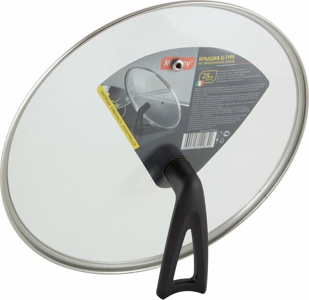 Крышка G-type (закал. стекло) VETRO-SPECIAL Длина - 28 см, толщина стекла - 4 мм, материалы: крышка -закаленное стекло, нержавеющая сталь., ручка - бакелитовая. Упаковка: цветной рукав Крышка снабжена ненагревающейся бакелитовой ручкой уникальной формы, благодаря которой крышку можно вертикально ставить на стол,что позволит избежать загрязнение рабочей поверхностей стола. Крышка имеет отверстие для выхода пара и металлический ободок, который предохраняет крышку от механических повреждений. Крышка подходит для любой посуды диаметром 28 см.