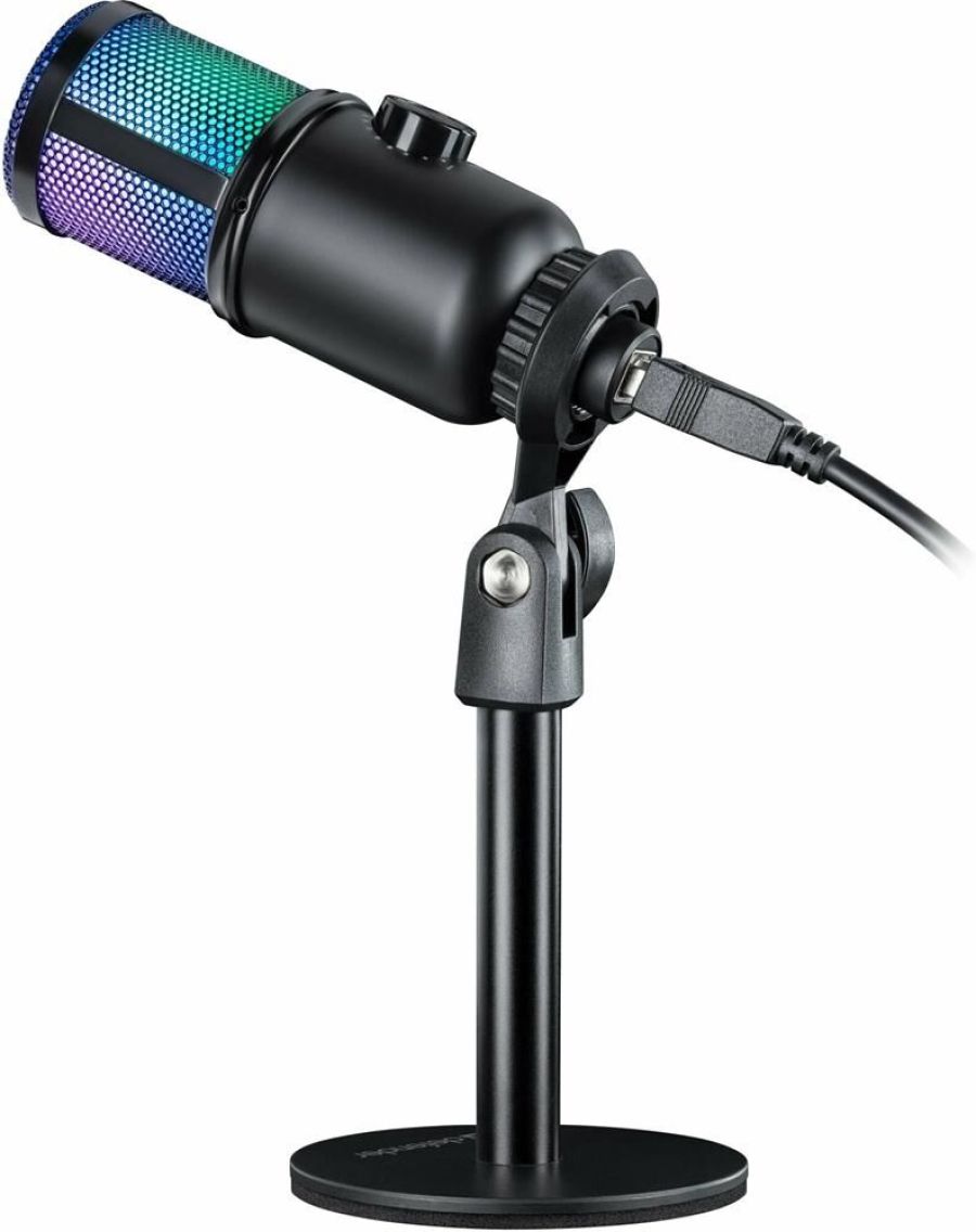 Игровой стрим микрофон Defender Glow GMC 400 USB, провод 1.3 м: Совместим с любыми ПК и ноутбуками с разъемом USB. RGB подсветка. Разъем для наушников. Легкая настройка и установка. Прочная и легкая алюминиевая конструкция. Компактность, легкость и удобство в использовании. Регулируемый угол наклона. Штатив в комплекте.