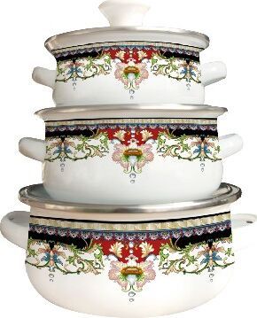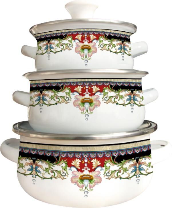 Набор из 6 предметов; Кастрюли: 0,5л, 0,7л, 1,1 л; С жаропрочными стеклянными крышками; 3-х слойное внешнее эмалированное покрытие; 3-х слойное внутреннее эмалированное покрытие; Подходит для индукционных плит.