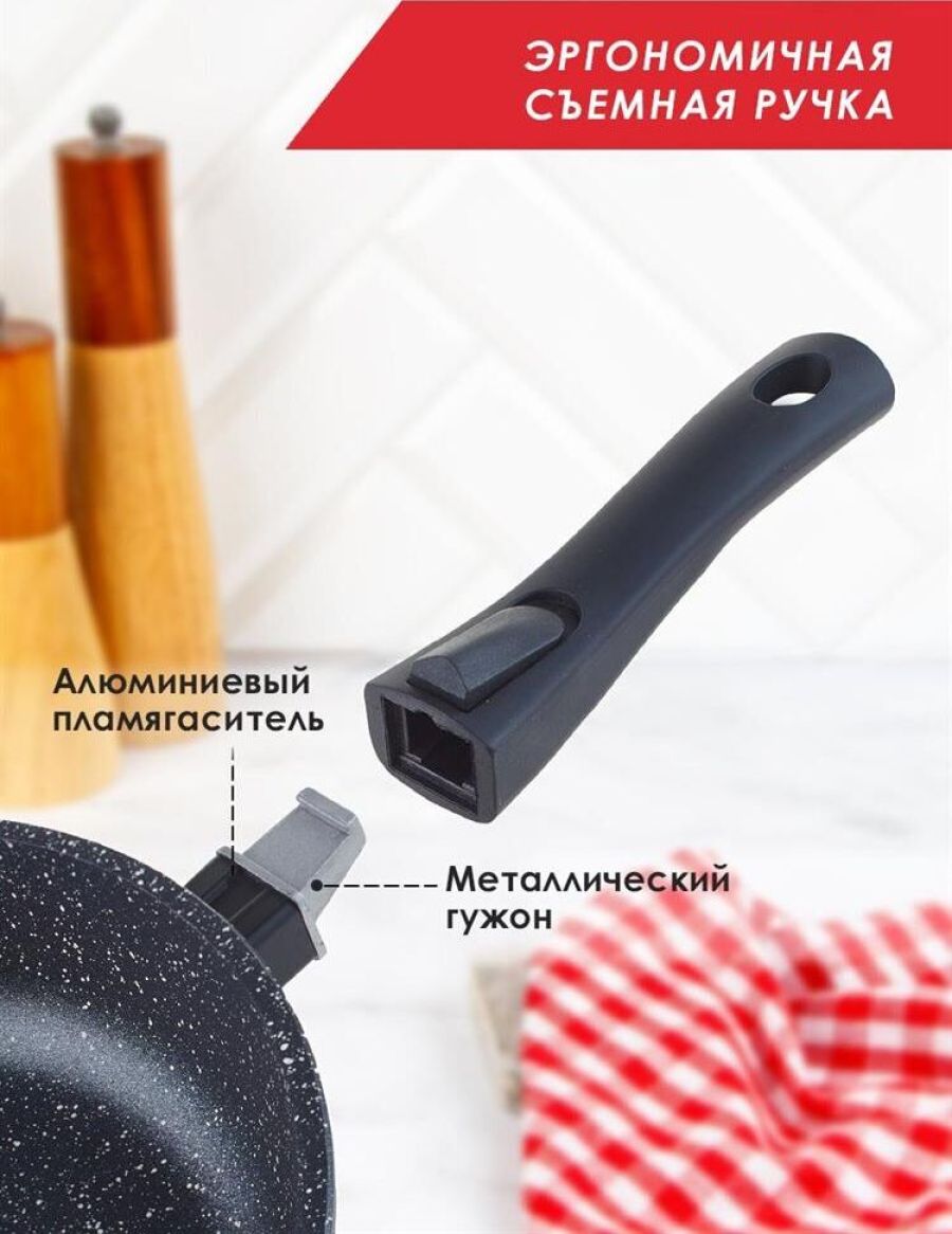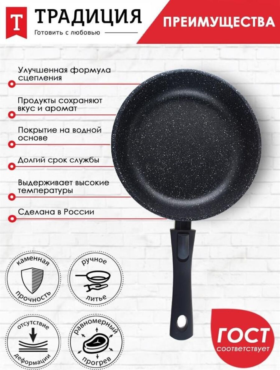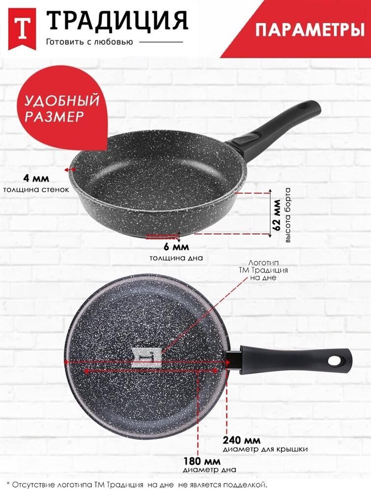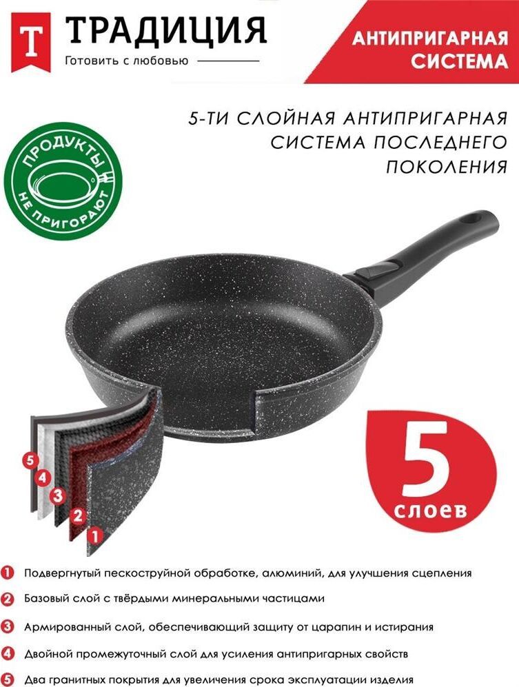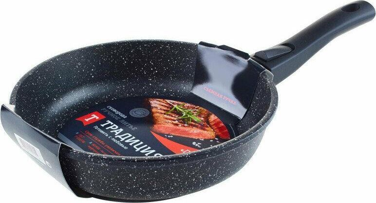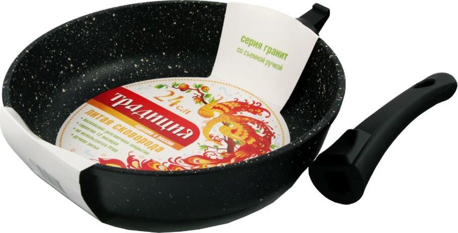Объем, л./размер, см: 24 см Материал: литой алюминий Коллекция/серия: Гранит Торговая марка: Традиция Толщина дна: 6 Толщина стенок: 4 Источник тепла: Все виды плит, кроме индукционной Тип упаковки: цветной рукав Внутреннее покрытие: антипригарное покрытие Pfluon Внешнее покрытие: антипригарное покрытие Pfluon Ручка: съемная soft-touch
