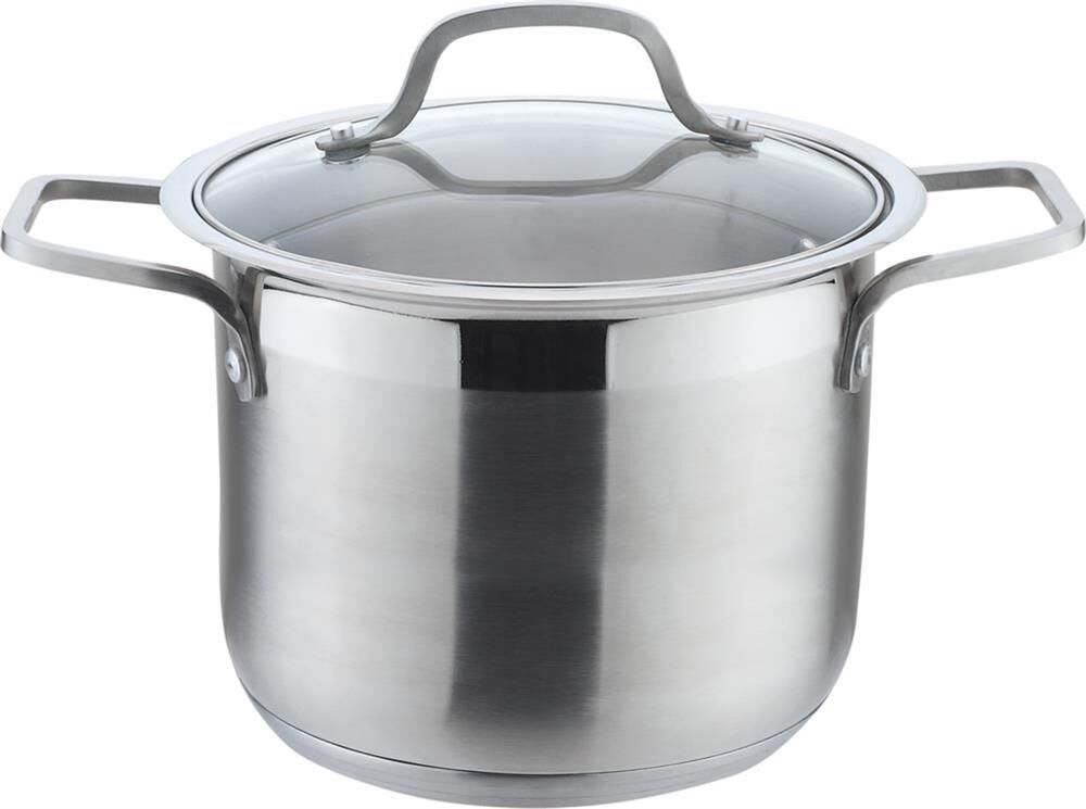 КАСТРЮЛЯ Объем 11 л Высокачественная нержавеющая сталь 5-ти слойное капсульное дно Подходит для индукции Стеклянная жаропрочная крышка с паровыпуском диаметром 26 см Удобные термостойкие клепаные ручки Матовая внутри и снаружи Мерная шкала внутри кастрюли